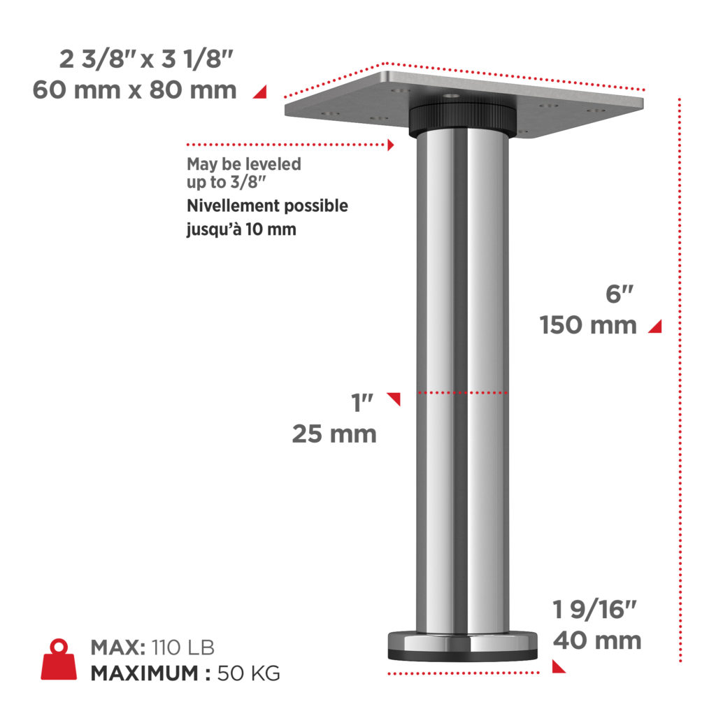 Richelieu BORSA - Adjustable Furniture Leg - 642 offers a stylish and practical solution for enhancing your furniture aesthetics. Designed with a contemporary round shape, these legs are ideal for bedrooms, living rooms, and bathrooms, adding a modern touch to dressers, nightstands, bathroom vanities, and TV stands. Crafted from durable Stainless Steel 201, the BORSA legs feature a sleek chrome finish that complements various décor styles. With a height of 5 29/32 in and a base diameter of 1 9/16 in, these legs provide a robust support system with a load capacity of up to 110 lb per leg, ensuring stability and reliability for your furniture. The adjustable feature allows for height modifications of up to 3/8 in, accommodating uneven floors and ensuring a level setup. The legs come with a plate dimension of 80 mm x 60 mm for easy installation. Whether you’re looking to revitalize existing furniture or create a cohesive look throughout your space, the versatility of the BORSA Adjustable Furniture Legs makes them a perfect choice. Available in various sizes and finishes, these legs not only enhance functionality but also elevate the overall design of your home.