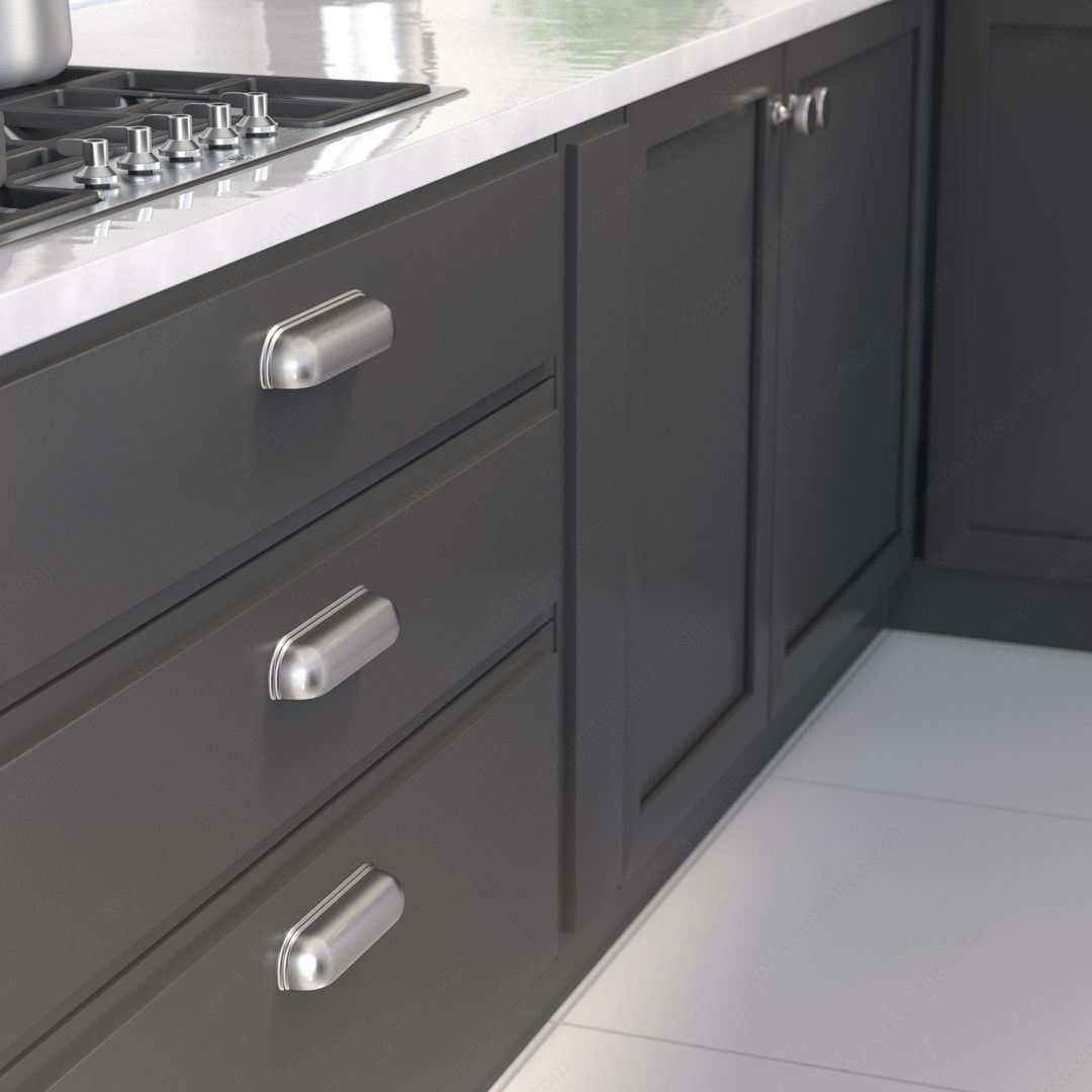 Richelieu 6574128195 Transitional Metal Pull - 6574 adds a sophisticated element to any drawer front with its elegant oblong cup design and stepped base. This pull is perfect for those looking to enhance their cabinetry with a modern yet timeless touch. Measuring 6 3/16 inches in overall length and featuring a center-to-center measurement of 5 1/32 inches, it is designed to fit seamlessly into various cabinet configurations. Crafted from durable zamak, the pull boasts a brushed nickel finish that not only elevates its visual appeal but also ensures longevity and resilience against wear. The stylish gray and chrome color combination enhances its versatility, allowing it to complement a wide range of design schemes. With an overall projection of 1 7/32 inches and a width of 1 5/32 inches, it provides a comfortable grip while maintaining a sleek profile. This transitional style cup pull is part of Richelieu's New Collection, reflecting a commitment to quality and innovation. Each pull comes with M4 screws included, making installation straightforward and hassle-free. Whether you're upgrading kitchen drawers or outfitting a stylish bathroom, the Richelieu 6574128195 is an ideal choice for adding both function and flair.