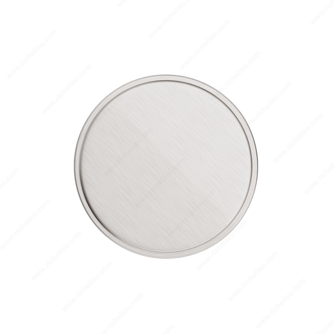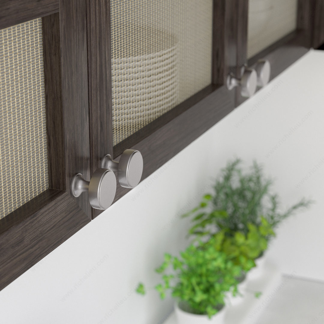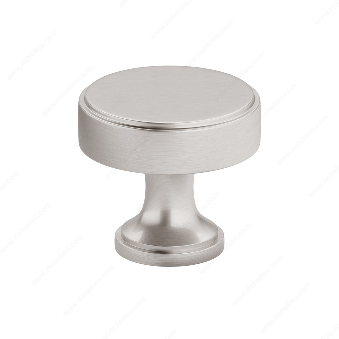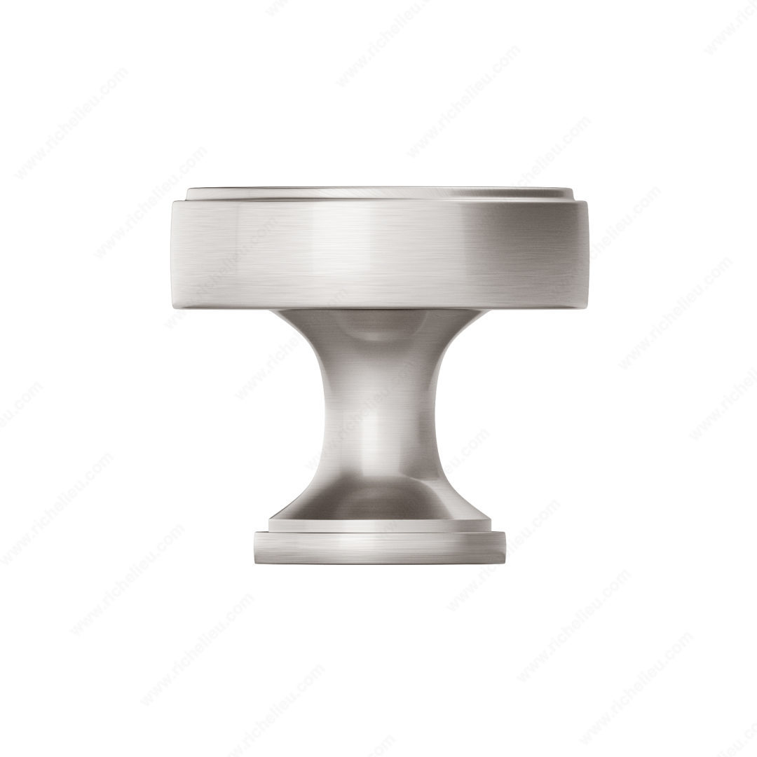 Richelieu 688440195 Transitional Metal Knob - 6884 offers a striking blend of style and functionality, making it an ideal choice for modern cabinetry and furniture. The knob features a sophisticated stepped face that adds a touch of elegance, while its flared stepped base enhances its overall aesthetic appeal. Crafted from durable zamak, this knob is designed for longevity and resilience. With an overall diameter of 1 9/16 inches and a base diameter of 31/32 inches, it fits comfortably in hand, providing a secure grip. The brushed nickel finish, complemented by gray and chrome accents, ensures it seamlessly integrates into a variety of interior design schemes. The knob’s projection measures 1 15/32 inches, making it a practical choice for both new installations and renovations. Included with the knob is an M4 screw, ensuring straightforward installation. The Richelieu 688440195 is part of the New Collection, reflecting contemporary trends while maintaining timeless appeal. This transitional style knob is perfect for building professionals and homeowners looking to elevate their spaces with high-quality hardware. Enjoy the perfect blend of beauty and practicality with this exquisite knob from Richelieu.
