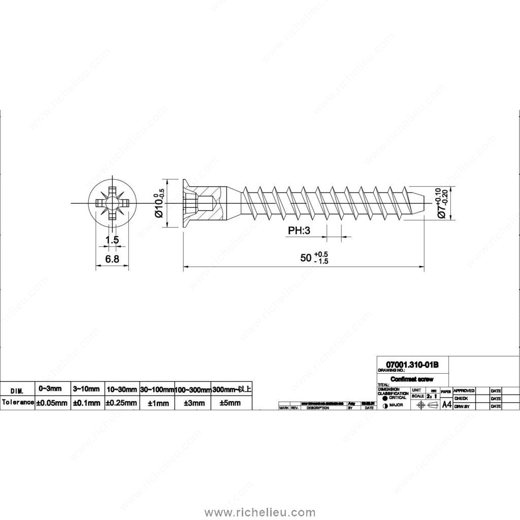 Richelieu 705001302G Wood Screw features a Confirmat head and coarse thread design, making it an essential component for the assembly and installation of cabinets and box constructions. Engineered to function like steel dowels, these fasteners create robust and stiff butt joints, ensuring your projects have the strength they need. This versatile screw has a length of 1 31/32 inches and a head size of 10 mm, providing the perfect fit for various furniture assembly applications. Manufactured from durable steel with a zinc finish, the 705001302G is designed to withstand the demands of everyday use while maintaining its structural integrity. The #2 Pozi drive size allows for easy installation with a Pozi drive tool, simplifying your assembly process. With a thread count of 3 and a dogpoint design, these screws offer exceptional holding power and precision. Each screw is packaged per unit, allowing for flexible purchasing based on project needs. While not certified, this product is built to meet the high standards expected in professional-grade fastening applications. Choose Richelieu's 705001302G for reliable performance and quality in your furniture assembly projects.
