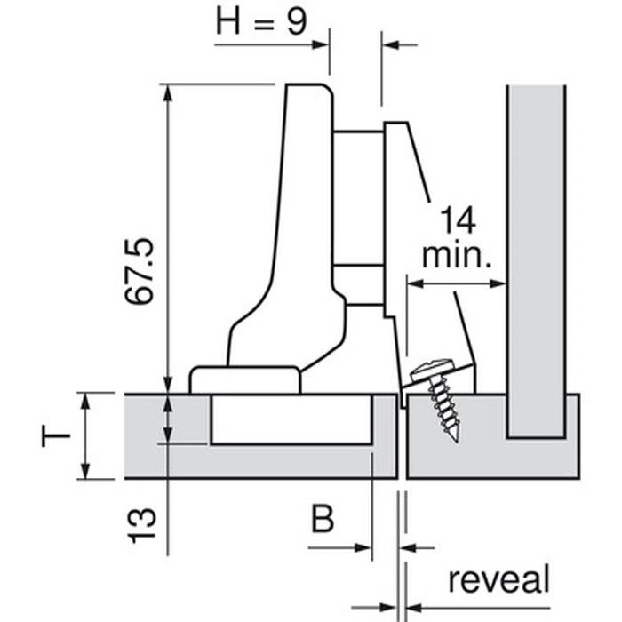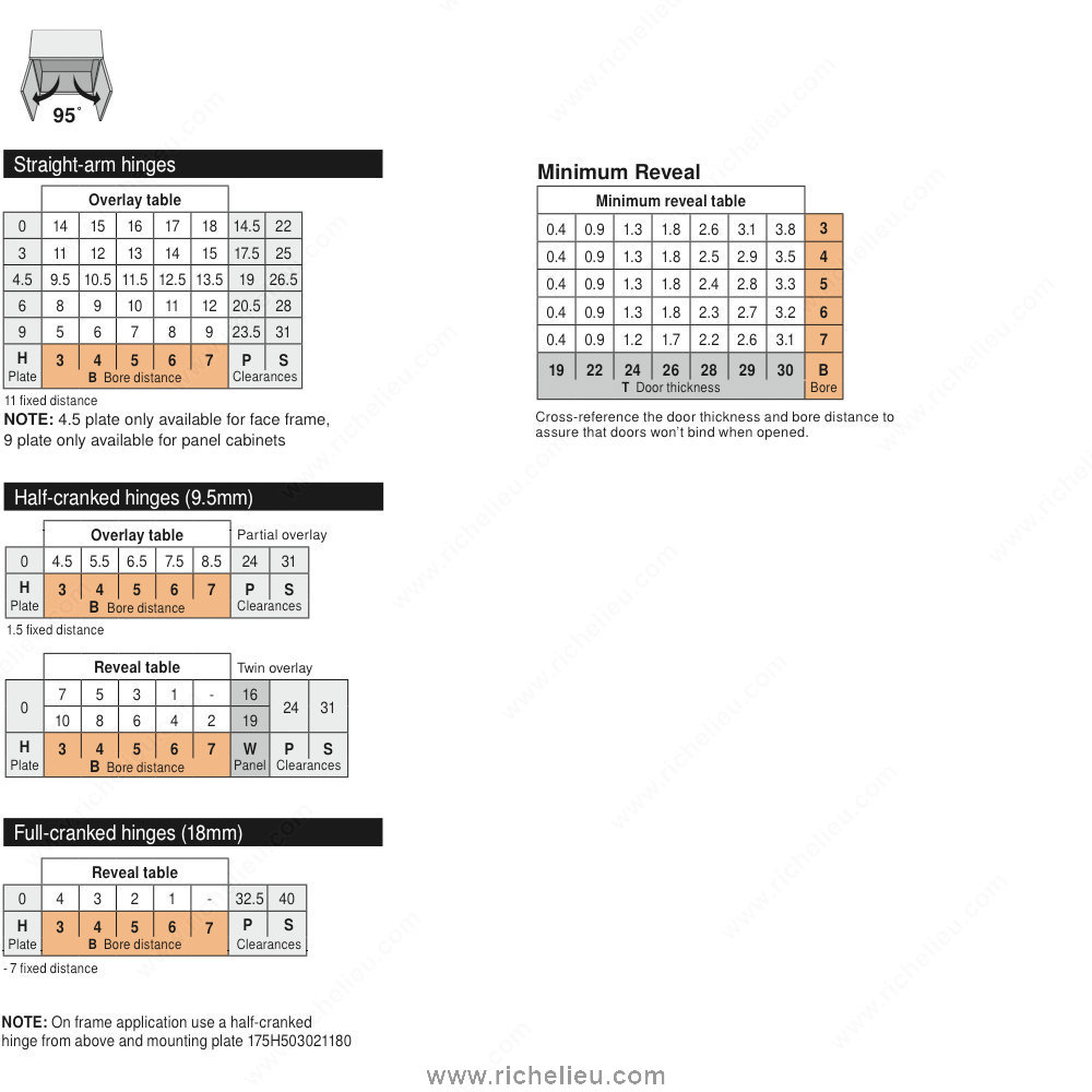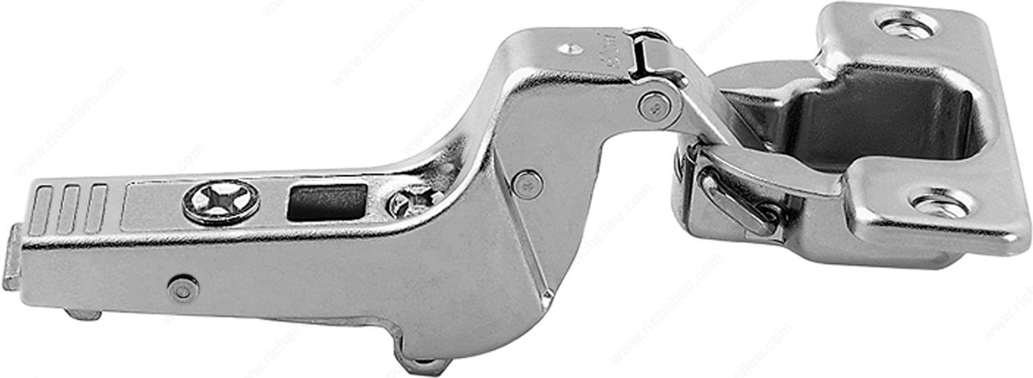 Richelieu 70T975180 CLIP top Hinge - 95 for Thick Doors is designed specifically for frameless cabinets, providing a seamless and elegant solution for inset doors. This hinge accommodates door thicknesses ranging from 5/8 to 1 1/4 inches, making it ideal for thicker applications. With a minimum cabinet thickness requirement of 5/8 inches, this hinge ensures a secure and sturdy attachment, enhancing the overall durability of your cabinetry. One of the standout features of this hinge is its impressive opening angle of +95°, which allows for easy access and optimal functionality. The free swing mechanism facilitates smooth operation, providing a user-friendly experience. Installation is straightforward with a screw-on fixing type, ensuring reliable performance over time. Additionally, the milling depth of 15/32 inches and milling diameter of 1 3/8 inches support precise fitting, making it easier to achieve a polished finish. Richelieu's commitment to quality is evident in this product, which is suitable for professional-grade applications. Whether you're a building professional or a knowledgeable homeowner, the Richelieu 70T975180 hinge is a fantastic choice for enhancing both the aesthetics and functionality of your kitchen cabinetry.