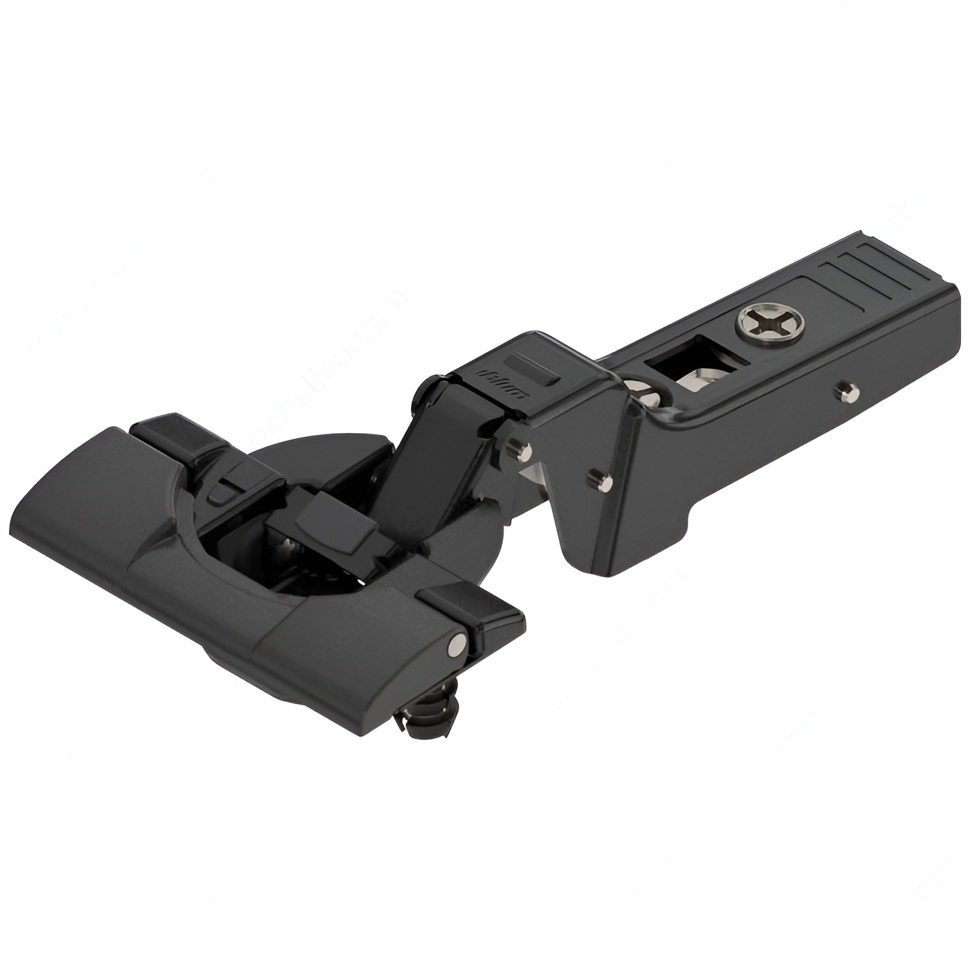 Richelieu 71B969181 CLIP top BLUMOTION Hinge for Thick Door - Onyx Black offers a seamless blend of functionality and style, designed specifically for frameless cabinetry. This hinge accommodates door thicknesses ranging from 5/8 to 1 1/4 inches, making it a versatile choice for a variety of thick doors. Its striking Black Onyx finish not only enhances aesthetics but also provides a durable surface that resists wear over time. Designed for half overlay doors, the hinge features an impressive opening angle of +95°, allowing for easy access to cabinet interiors. The innovative spring-closing mechanism ensures that doors close softly and quietly, eliminating the noise associated with traditional hinges. With a milling depth of 1/2 inch and a diameter of 1 3/8 inches, the hinge installation is straightforward, thanks to the Inserta fixing type. Richelieu's commitment to quality is evident in this hinge, which combines advanced BLUMOTION technology with user-friendly design. This product can ship via UPS, making it a convenient option for building professionals and homeowners alike. Enhance your cabinetry with the reliability and elegance of the Richelieu CLIP top BLUMOTION hinge, ensuring a sophisticated finish in any space.