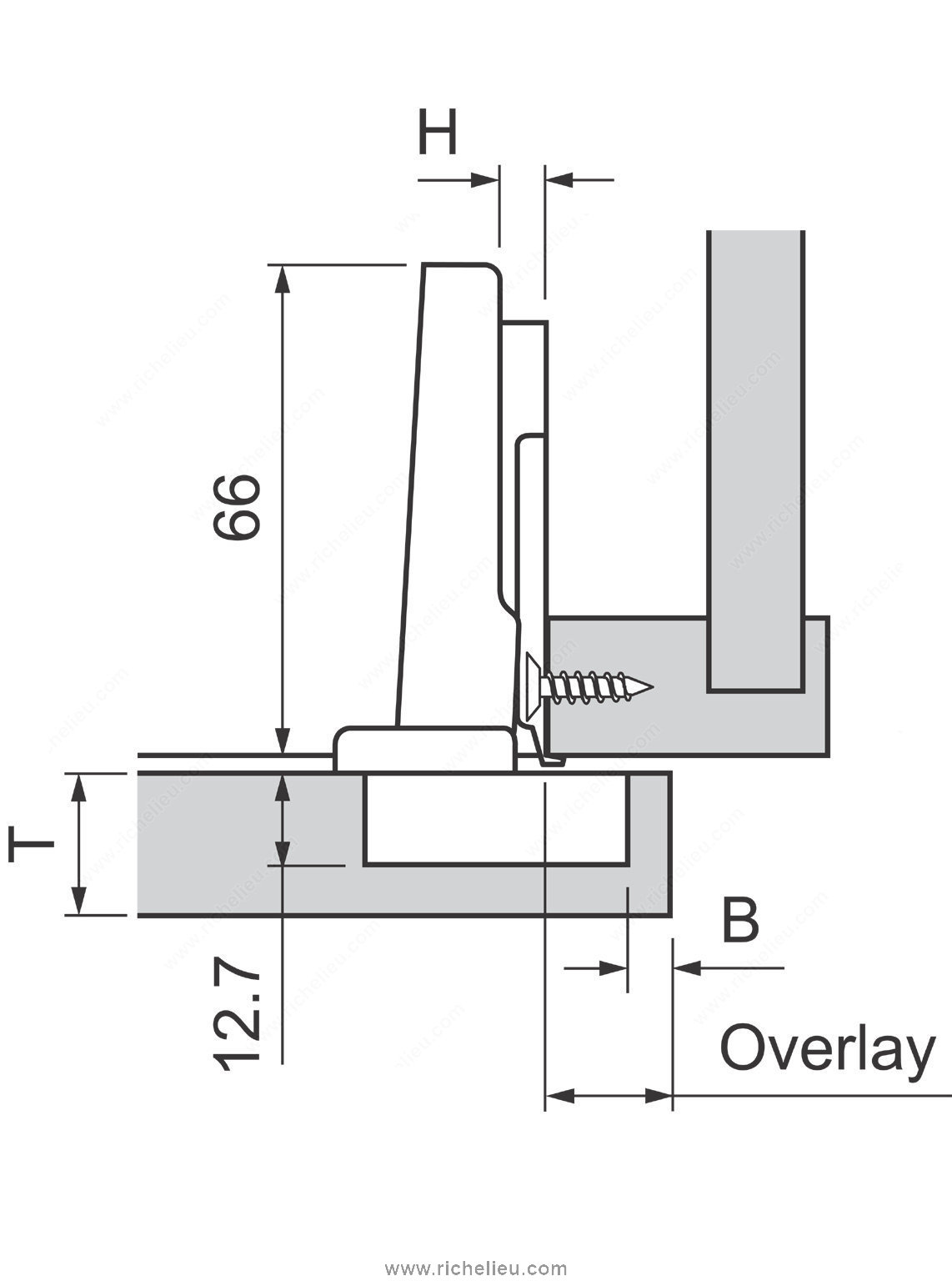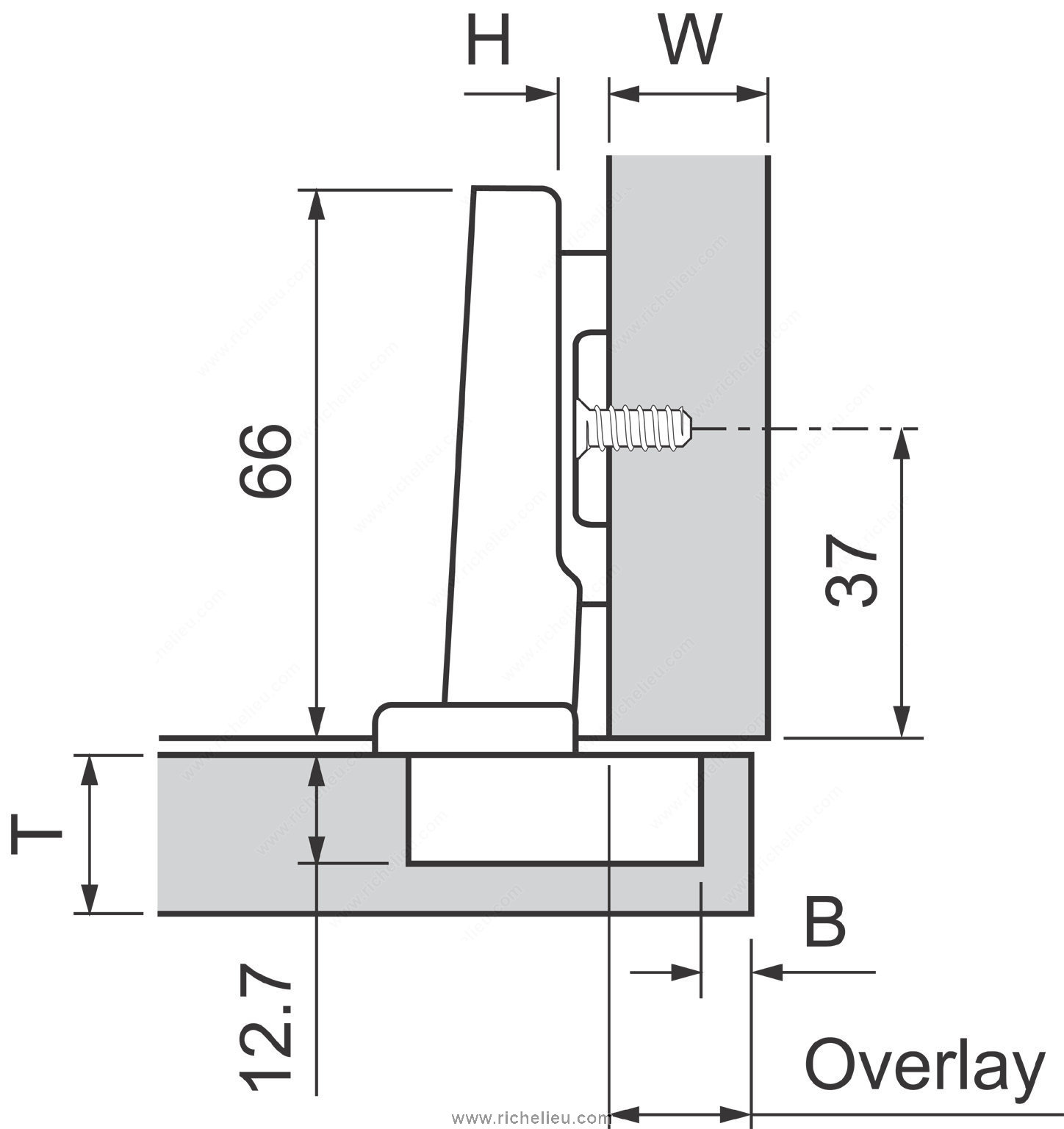 Richelieu 73T558E180 CLIP top Hinge - 120 is designed for frameless cabinets, providing a seamless and modern aesthetic. This hinge accommodates a minimum cabinet and door thickness of 5/8 inches, making it a versatile choice for various applications. With a remarkable hinge opening angle of +120°, this product allows for full overlay doors to swing open wide, enabling easy access to cabinet interiors. The spring closing mechanism ensures that doors close gently and securely, enhancing both functionality and user experience. Installation is straightforward, thanks to the expanding dowel fixing type, which guarantees a reliable and stable mount. The milling requirements include a depth of 13/32 inches and a diameter of 1 3/8 inches, ensuring a precise fit for optimal performance. Packaged individually, the Richelieu 73T558E180 is conveniently shipped via UPS, making it easy to incorporate into any project. Ideal for standard door use, this hinge exemplifies durability and efficiency, combining modern design with practical application. Whether you are a building professional or a knowledgeable homeowner, this hinge will elevate your cabinetry with its quality and ease of use.