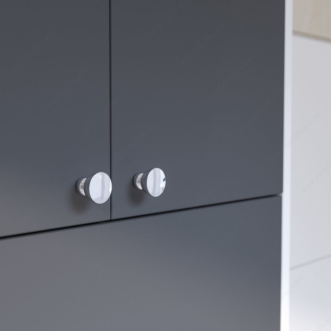 Richelieu 798626140 Modern Metal Knob is designed to enhance the aesthetic appeal of your furniture with its sleek, round shape and crisp, flat surface. This stylish knob effortlessly blends modern design with functionality, making it an excellent choice for contemporary spaces. Crafted from durable aluminum, it boasts a striking chrome finish that adds a touch of sophistication to any cabinet or drawer. With an overall diameter of 1 1/32 inches and a projection of 29/32 inches, this knob is perfectly sized for ease of use while maintaining a minimalist profile. The color combination of gray and chrome allows it to complement a variety of decor styles, ensuring versatility for your design projects. Each knob comes with an M4 screw, simplifying installation and allowing for a seamless upgrade to your furniture. Part of the New Collection, the Richelieu 798626140 is a standout piece that fits within the complete collection of models 7979 and 7986, giving you the option to create a cohesive look throughout your space. Ideal for both building professionals and discerning homeowners, this knob elevates any furniture piece while ensuring a functional grip. Choose Richelieu for quality hardware that combines style and durability.