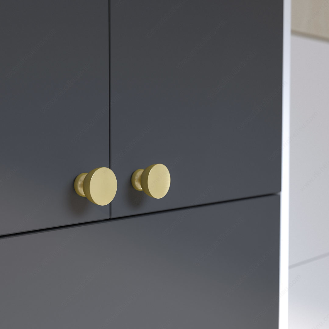 Richelieu 798632165 Modern Metal Knob - 7986 enhances your furniture with its elegant design and modern appeal. This round knob features a crisp, flat surface that brings a charming touch to cabinets, drawers, and furniture, making it an ideal choice for both contemporary and transitional styles. With a diameter of 1 1/4 inches and a projection of 1 3/32 inches, it offers a comfortable grip while remaining sleek and unobtrusive. Crafted from durable aluminum and finished in a stunning brushed gold, the knob showcases a striking blend of yellow and brass hues that effortlessly complement a variety of decors. This stylish piece is part of Richelieu's New Collection and fits seamlessly in any space, whether it’s a kitchen, living room, or office. Installation is simple, as the knob comes with an M4 screw included, ensuring you can upgrade your furniture with ease. Designed for versatility, the Richelieu 798632165 knob is not just a functional hardware piece but a statement accessory that elevates the overall aesthetic of your home. Enhance your interiors with this modern metal knob and enjoy a blend of style and practicality.