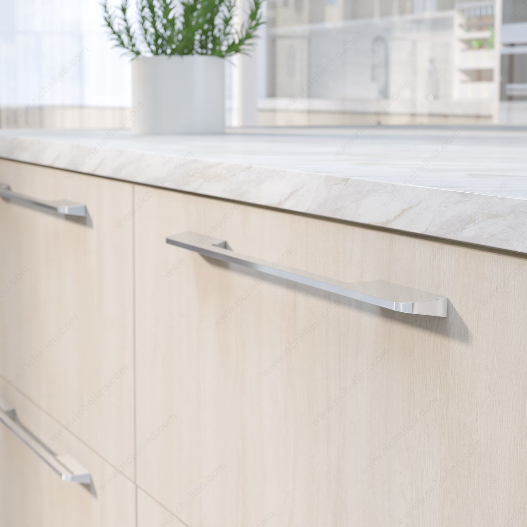 Richelieu 7996320140 Modern Metal Pull is a stunning addition to any contemporary furniture or cabinetry project. With its sleek flared posts and curved internal grip, this pull combines aesthetic appeal with functional design, making it an ideal choice for those looking to elevate their interior spaces. Designed with a center-to-center measurement of 12 5/8 inches, the pull fits seamlessly into modern cabinetry layouts. Its overall dimensions of 18 7/8 inches in length, 1/2 inch in width, and a projection of 1 1/4 inches ensure a comfortable grip while maintaining a streamlined profile. Crafted from durable aluminum, this pull features a sophisticated chrome finish that enhances its modern look, while the gray accents add depth and versatility to the design. Included with the pull are M4 screws, ensuring easy installation for building professionals and DIY enthusiasts alike. This model is part of the New Collection, allowing for cohesive design across various applications. Whether used in kitchens, bathrooms, or living spaces, the Richelieu 7996320140 Modern Metal Pull is sure to impress with its perfect blend of style and functionality.