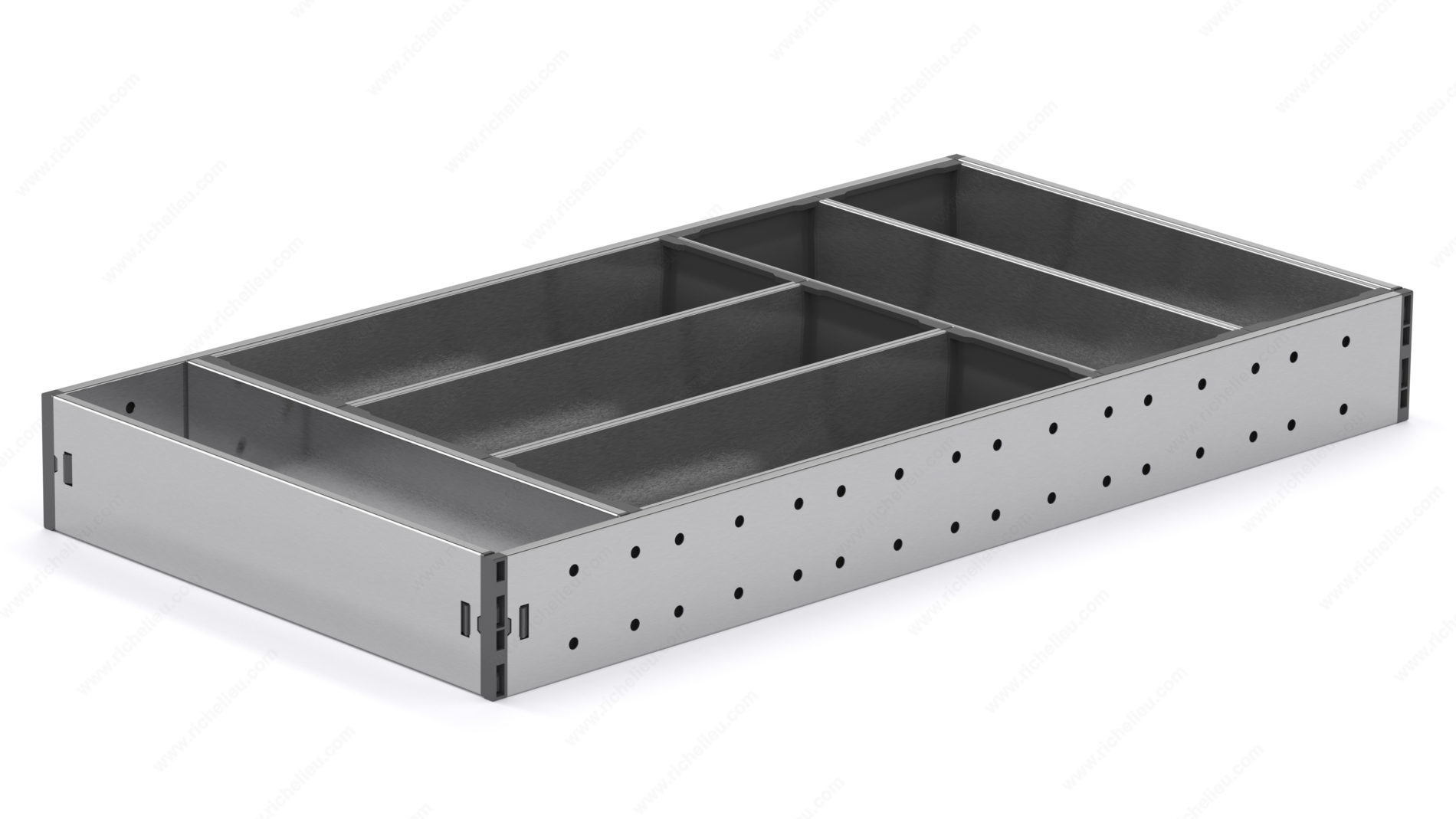 Richelieu 808CKIT550170 ORGANIZ-R Kit for Cutlery - 550 mm offers a streamlined solution for organizing your kitchen drawers. Designed to enhance storage efficiency, this kit allows you to neatly compartmentalize your cutlery and kitchen utensils, making daily tasks smoother and more enjoyable. Say goodbye to clutter and the time wasted searching for items, as this durable metal organizer provides a clean, modern look that will last for years. Measuring 550 mm (net 523 mm), this versatile organizer is available in two stylish finishes: anthracite gray and stainless steel, allowing you to choose the perfect match for your kitchen decor. The kit is designed to fit seamlessly inside a face frame drawer measuring 24 in (610 mm) or an OPTIMIZ-R drawer of 22 in (550 mm), making it a flexible choice for various storage needs. With dimensions of 21 5/8 in (length), 10 7/8 in (width), and a height of 2 9/32 in, the ORGANIZ-R Kit is compact yet spacious, accommodating a range of utensils. Discover how easy it is to maintain order in your kitchen with the Richelieu ORGANIZ-R Kit, where functionality meets aesthetic appeal.