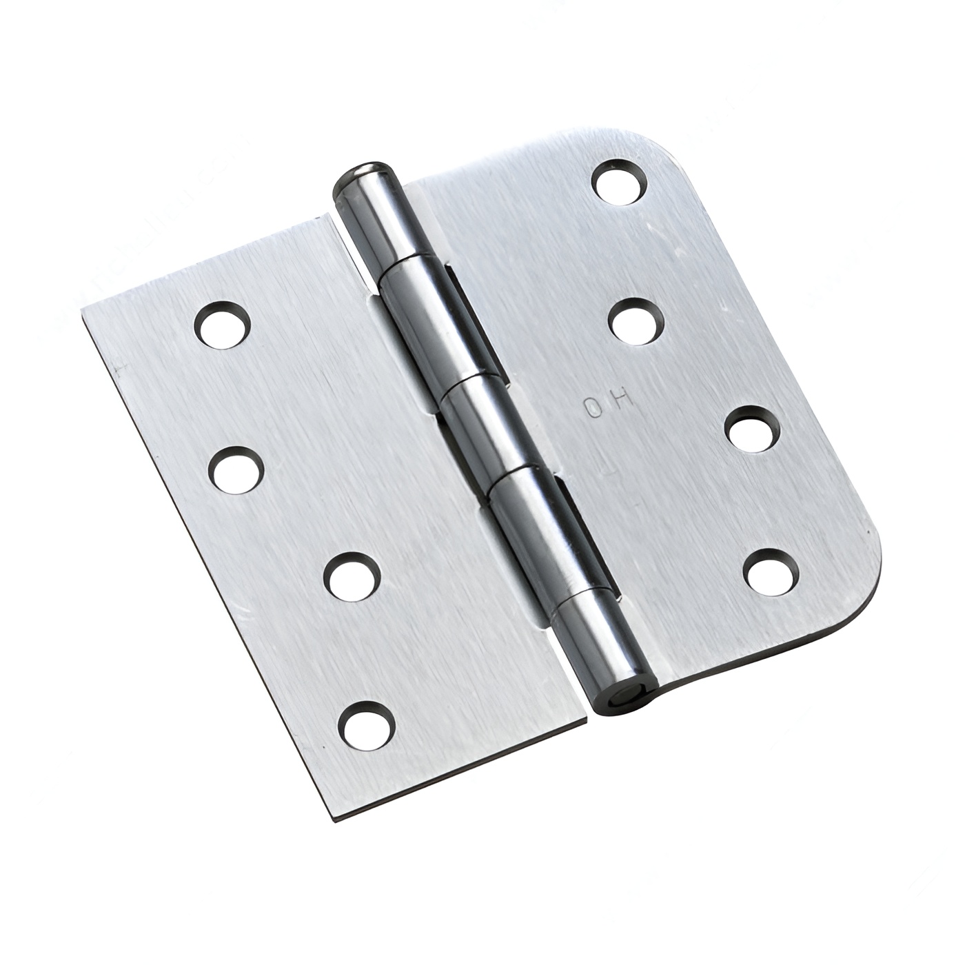 Richelieu 81822BCB 4" Full Mortise Combination Butt Hinge - 5/8" Radius is the perfect addition for any architectural project requiring quality and style. Crafted from durable steel and finished in sleek brushed chrome, this hinge not only enhances aesthetics but ensures long-lasting performance. With a height of 4 inches and a width of 4 inches, it accommodates standard doors with a maximum load capacity of 55 pounds when three hinges are used. Designed for light-use applications, the hinge features a removable pin that simplifies both installation and removal, making it an ideal choice for professionals and homeowners alike. Its reversible design allows for versatile installation options, accommodating various door configurations. The hinge is engineered for mortise mounting, featuring a square corner with a 5/8" radius, ensuring a seamless fit in your project. Included with the hinge are necessary screws, facilitating a straightforward setup. With an overall gap of 1/8", it provides a precise alignment that enhances the door's closing capabilities. Whether you're looking to update existing fixtures or complete new installations, the Richelieu 81822BCB hinge combines functionality with modern design, making it an essential component for any door application.