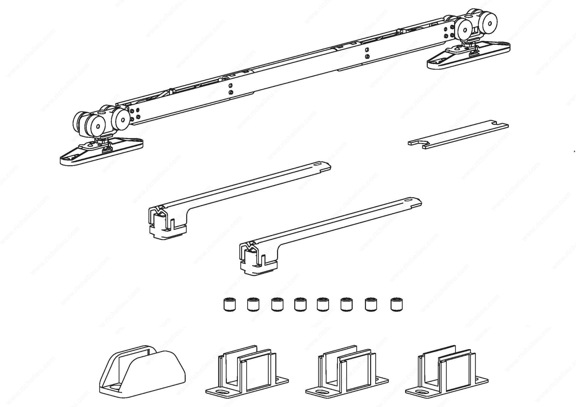 Richelieu 891688V40 Terno Vetro 40 Hardware Set with Two-Way Soft-Close offers a sophisticated solution for sliding glass doors, accommodating thicknesses from 5/16 inch to 1/2 inch (8 mm to 12.7 mm) and a weight of up to 176 lb (80 kg). Designed specifically for narrow glass doors, this hardware set enhances both functionality and aesthetic appeal in any space. The clip-on top mount suspension plate ensures easy installation and a clean look, while the innovative two-way soft-close mechanism gently slows the door to a stop, providing a smooth and quiet operation. This feature also allows the door to remain securely in a resting position in either direction, contributing to enhanced safety and convenience. Included floor guides further enhance stability, ensuring a seamless experience when opening and closing the door. With a maximum door height of 9 ft and a minimum width of 28 7/8 in, the Terno Vetro 40 is versatile enough to fit various design needs. Whether for residential or commercial applications, this hardware set is an excellent choice for those looking to combine style with practicality. Trust Richelieu to deliver quality and performance that meets the demands of modern architectural design.