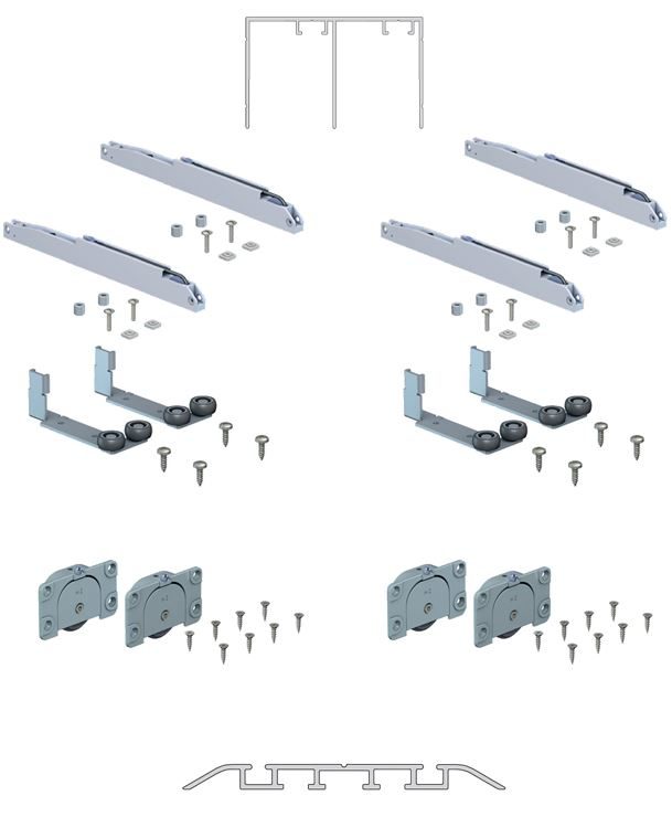 Select from kits for two doors with 2 m (78-3/4 in) double upper tracks or three doors with 3 m (118 in) triple tracks. All tracks are surface mounted.