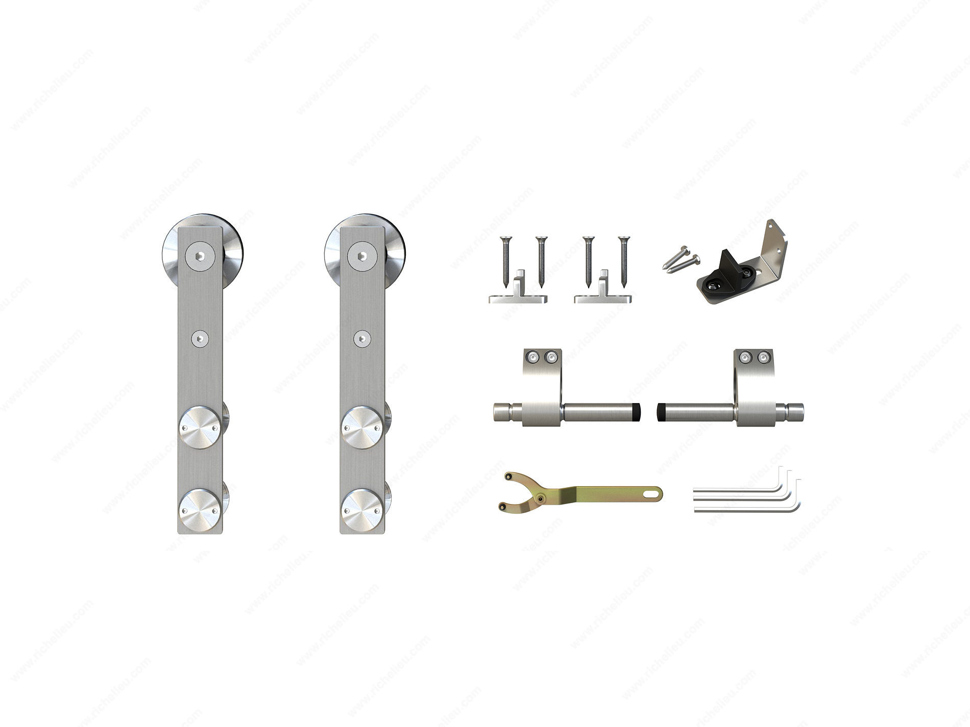 Richelieu 89TY049S2561170 Pro Series Albergo STP SC Hardware SetRichelieu 89TY049S2561170 Pro Series Albergo STP SC Hardware Set is expertly crafted for seamless soft-close functionality, accommodating wood doors weighing up to 176 lb (80 kg). This professional-grade hardware set is ideal for both residential and commercial applications, designed for high-frequency use. Constructed from Type 304 stainless steel, this set features strap-mount ball bearing wheels that ensure smooth and reliable door movement. The adjustable wall mount bottom door guide enhances installation flexibility, while the built-in anti-derailing device offers added security and peace of mind. For customization, the adjustable track stop allows for various door widths, making the product adaptable to different settings. The system includes an activator for the soft-close mechanism, sold separately, ensuring a gentle and quiet closing action. It supports single sliding door movement and is designed for top-hung installation, accommodating door heights from 59 to 106 inches and thicknesses between 1 3/8 to 1 25/32 inches. With a maximum width capacity ranging from 33 1/8 to 51 1/8 inches, this hardware set is versatile and robust. Ensure precise installation by following the metric specifications provided, including cutting a groove at the door's bottom. Enhance your space with the reliability and style of Richelieu's Pro Series Albergo hardware set.