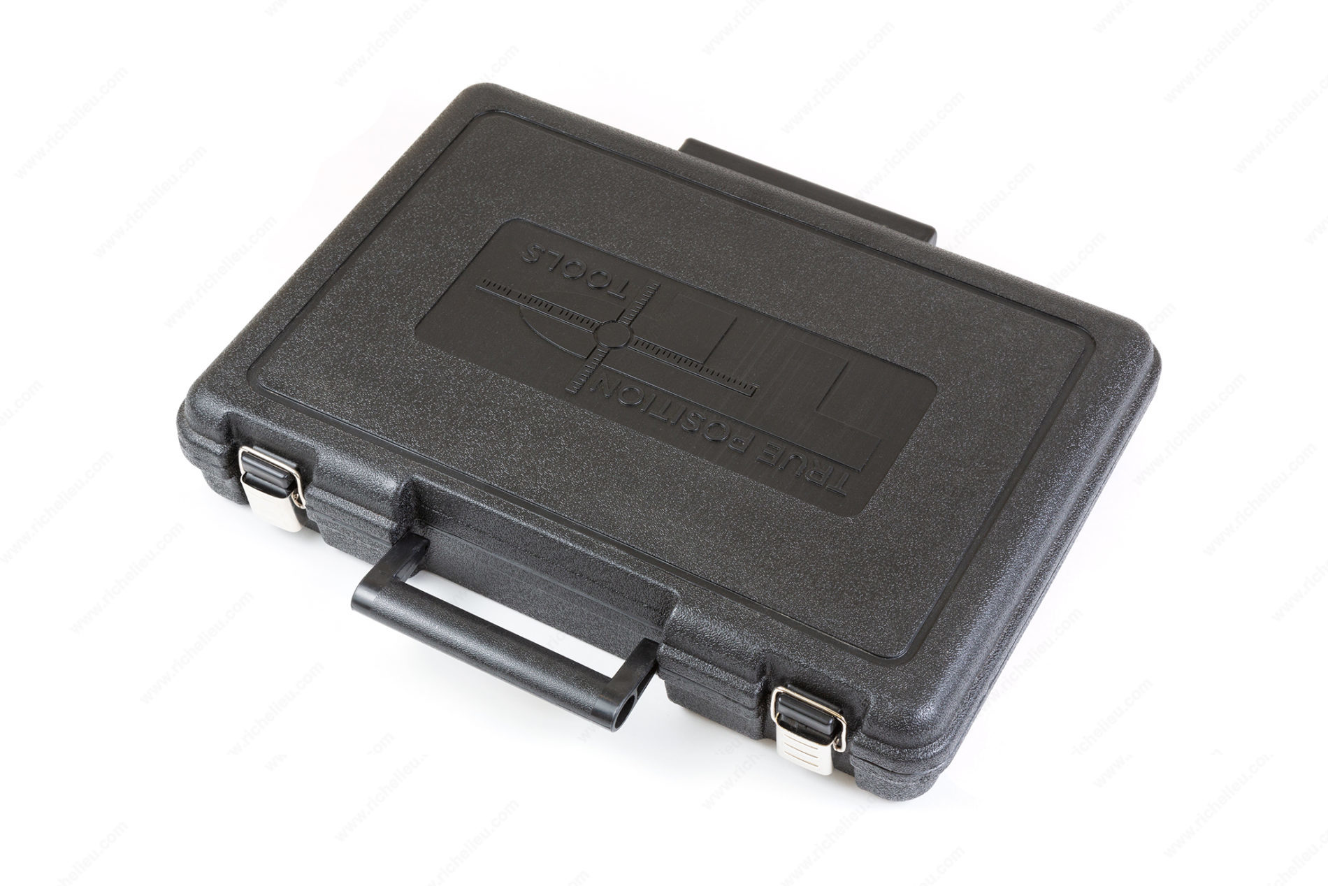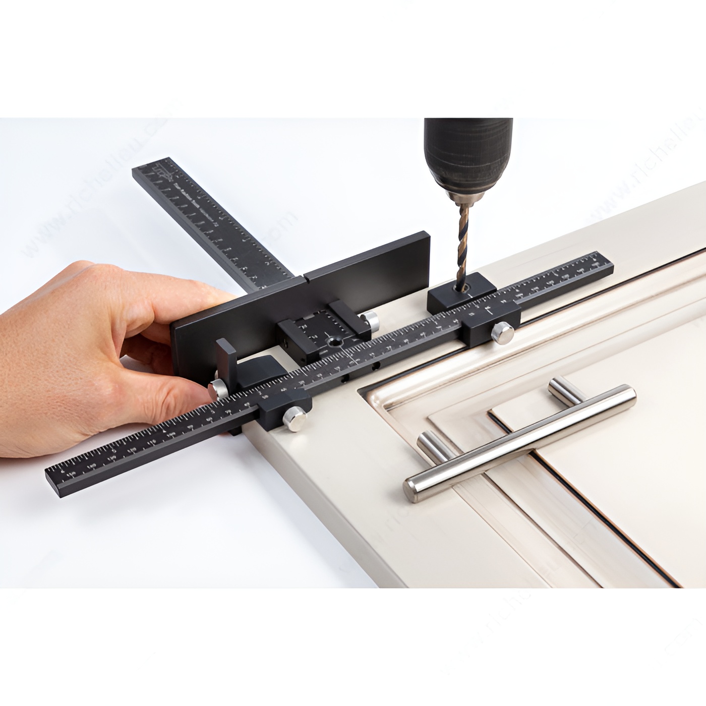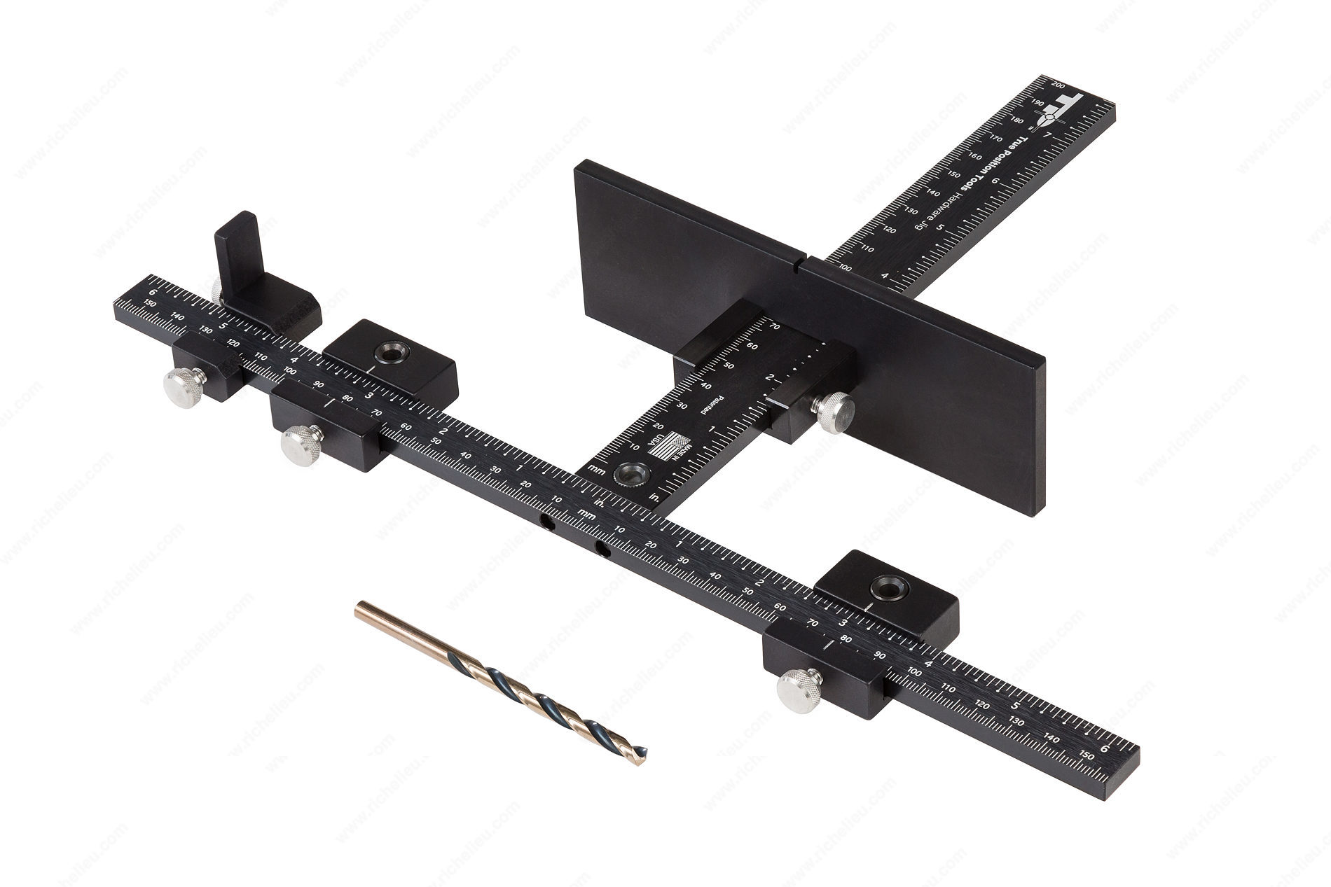 Richelieu 9125BASICJIG Jig System for Handles, Knobs and Case offers an essential solution for professional installation of handles and knobs on doors and drawer fronts. This jig system is a must-have for cabinet installers looking to achieve precision and efficiency in their projects. The design incorporates durable lightweight aluminum construction paired with case-hardened steel bushings, ensuring longevity and reliability in use. The jig features adjustable aluminum guides and stops that slide along both imperial and metric rulers, allowing for simple setup. By tightening the thumb screws, users can drill with confidence, knowing they'll achieve perfect symmetry every time. Its reversible design minimizes setup time, making it incredibly user-friendly for quick installations. With a minimum style and rail width of just 1/2 inch, the 9125BASICJIG is versatile enough to handle various applications. The 5 mm case-hardened steel bushings are not only replaceable but come with a lifetime warranty, adding to its value. Weighing in at a manageable 4.3 pounds and finished in sleek black, this jig measures 8.75 inches in height and 12.5 inches in width, making it easy to store and transport. Enhance your installation process with the reliability and precision of the Richelieu 9125BASICJIG.