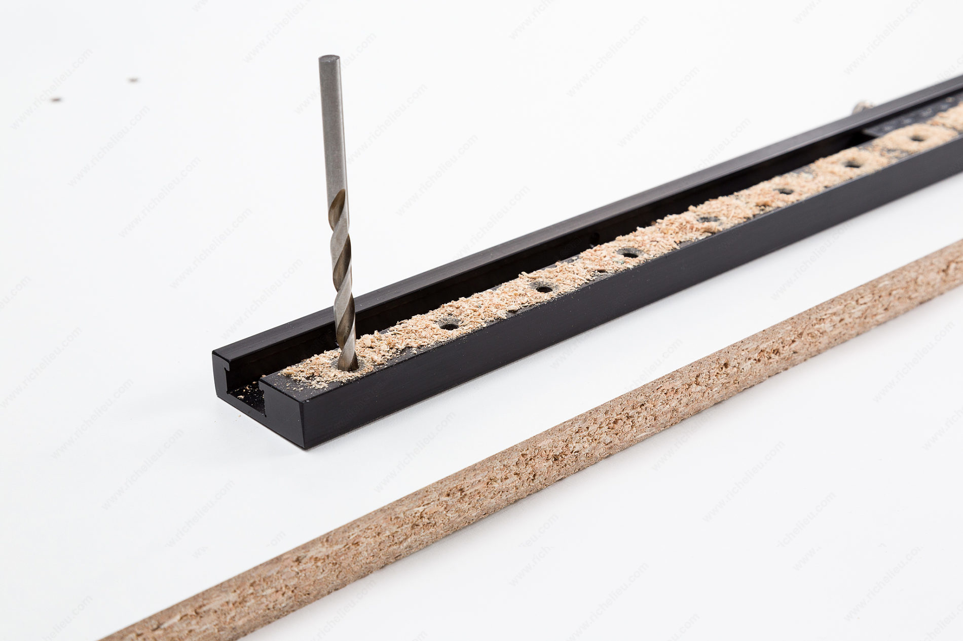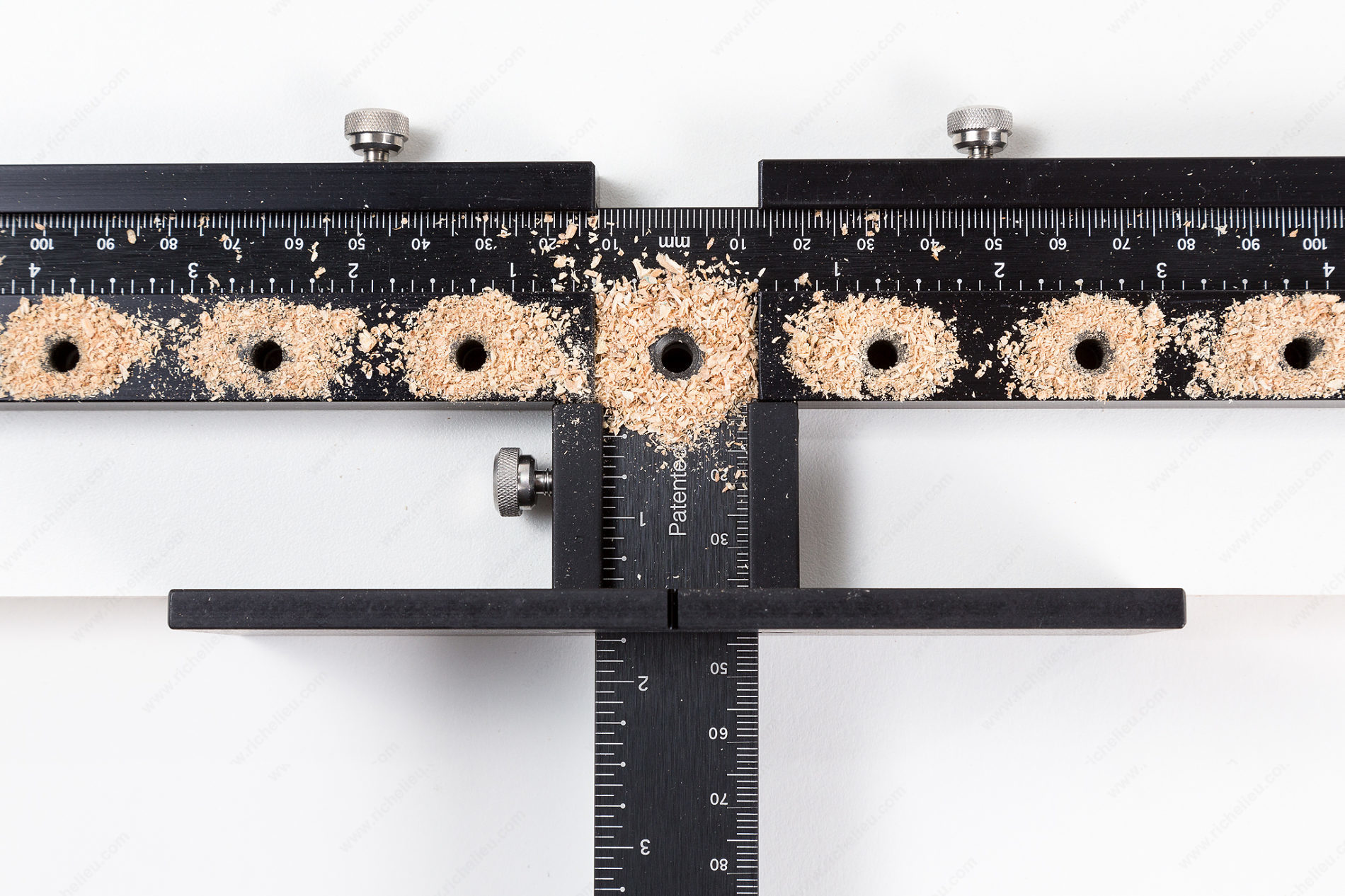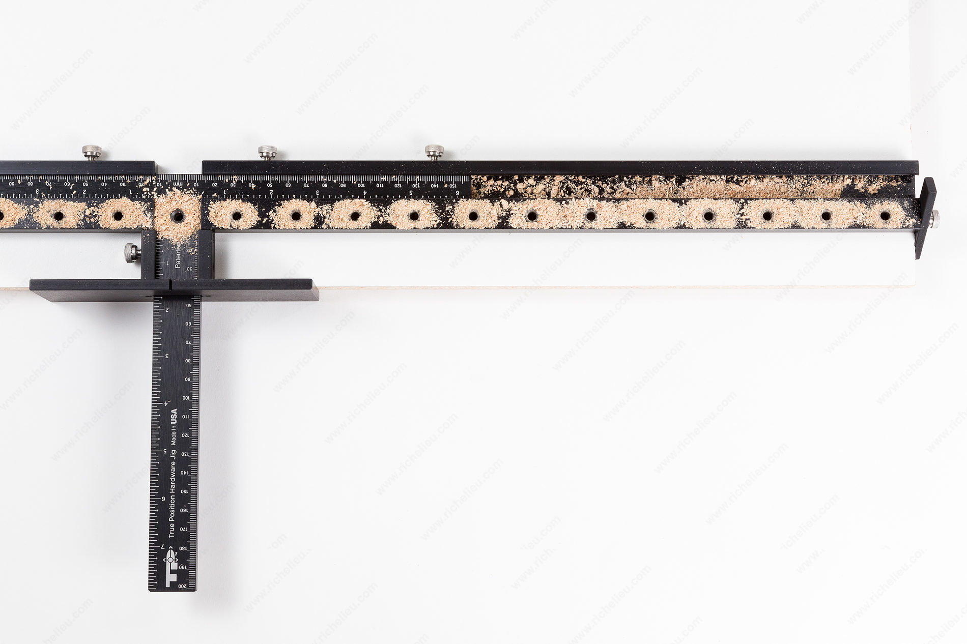 Drill shelf holes in the shop before assembly or on the job after assembly. Simply slide aluminum guides and stop along imperial and metric ruler, tighten thumb screws and drill.