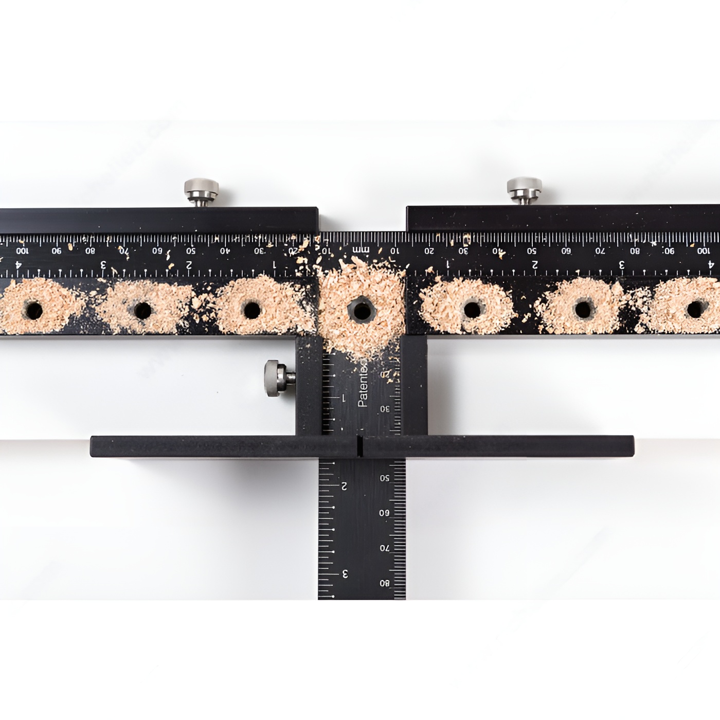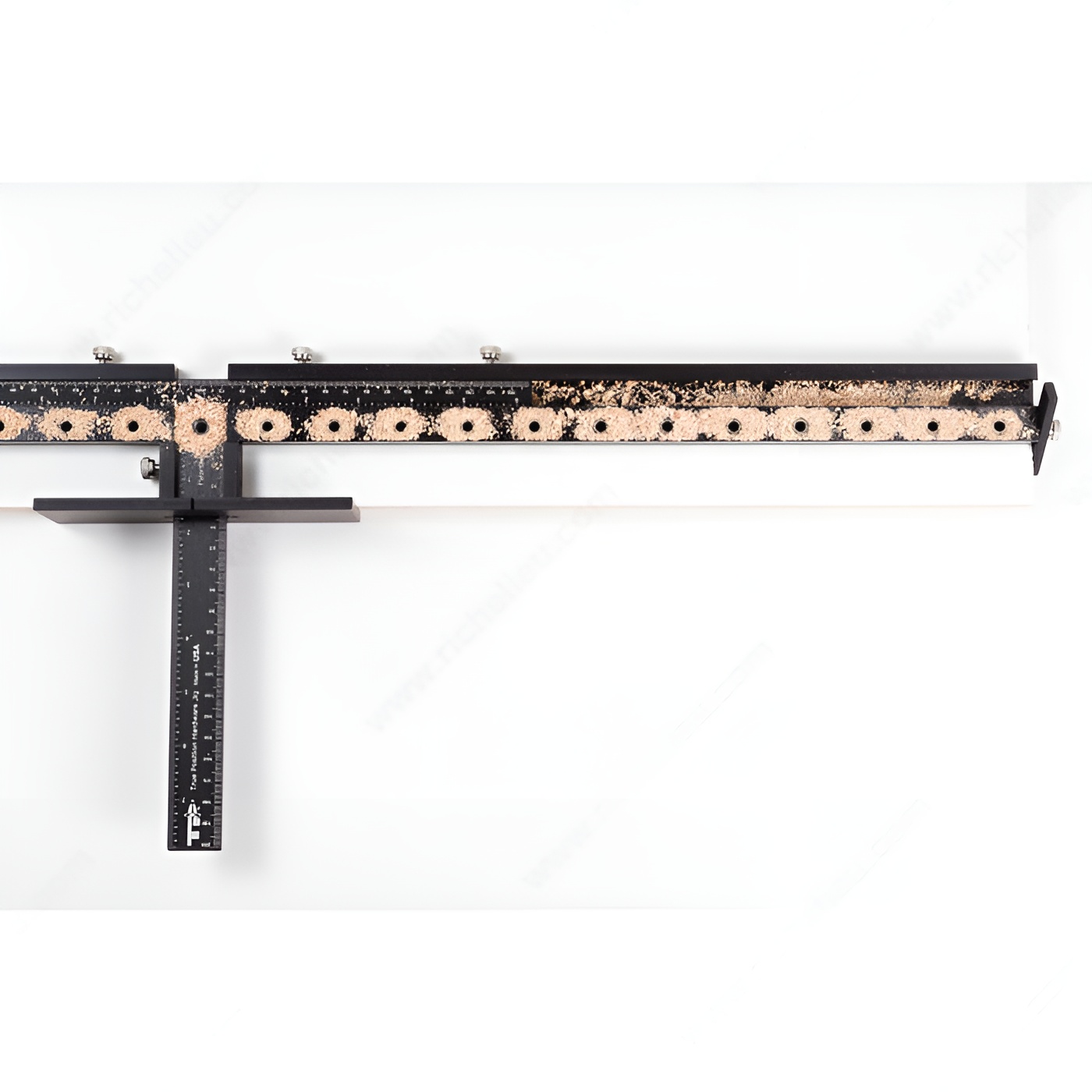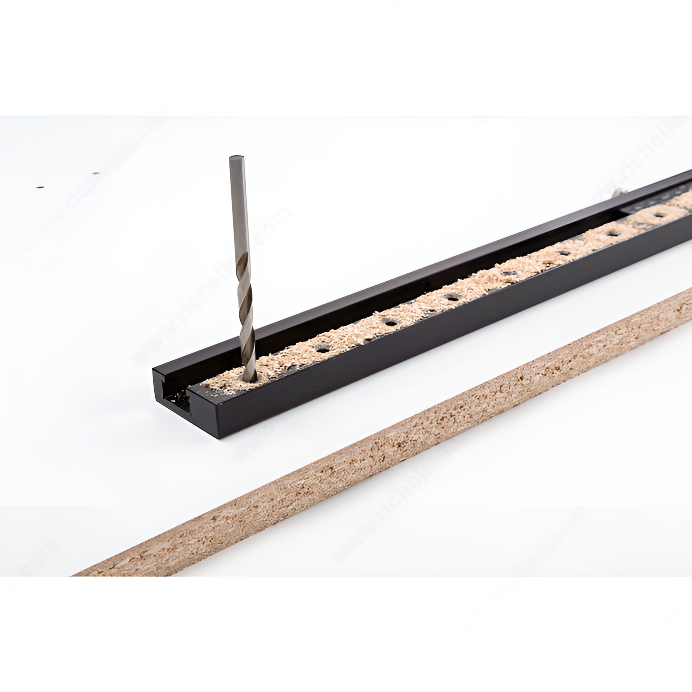 Drill shelf holes in the shop before assembly or on the job after assembly. Simply slide aluminum guides and stop along imperial and metric ruler, tighten thumb screws and drill.