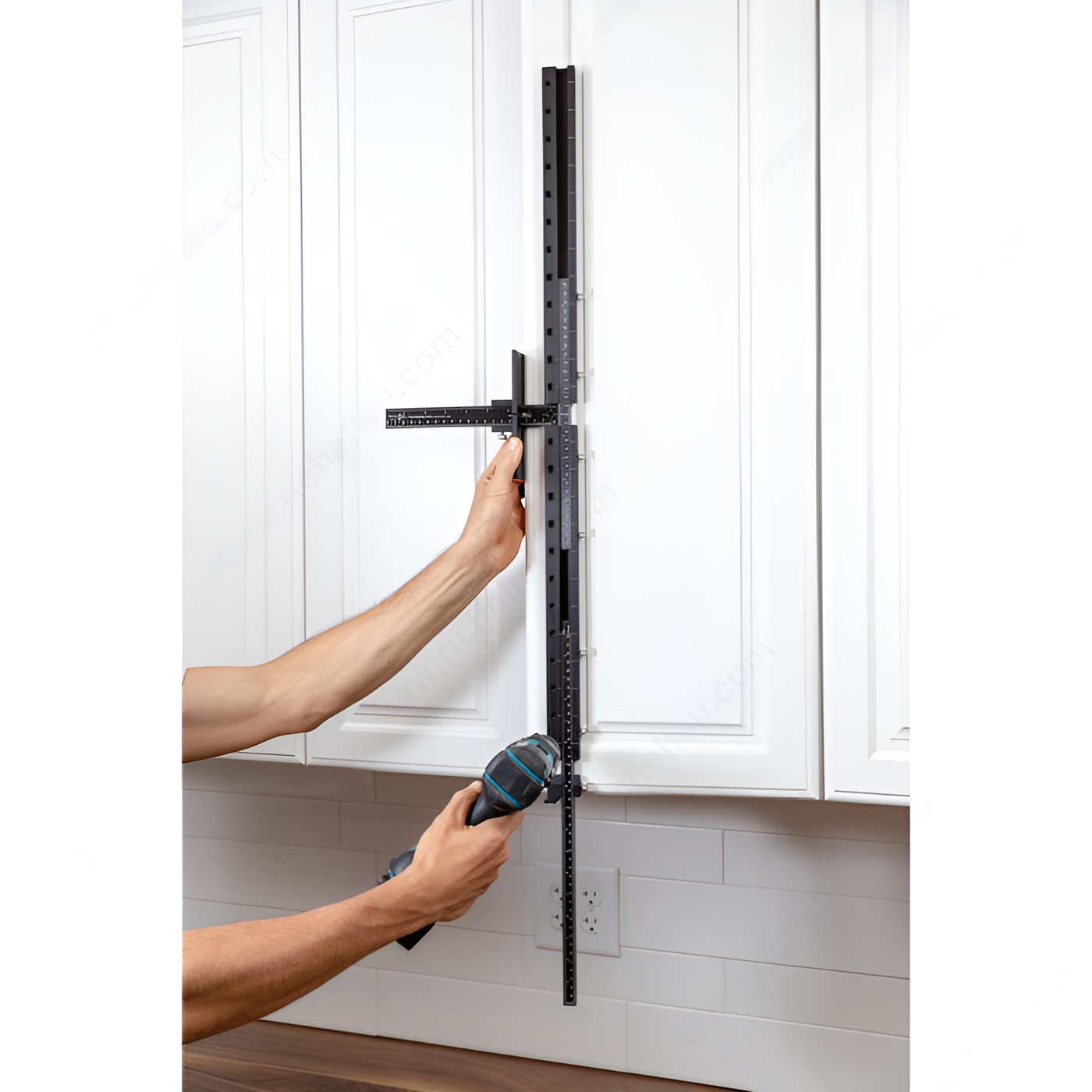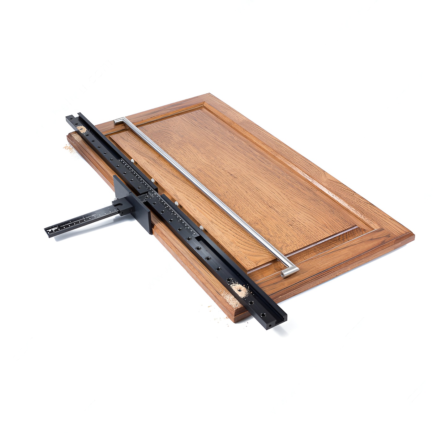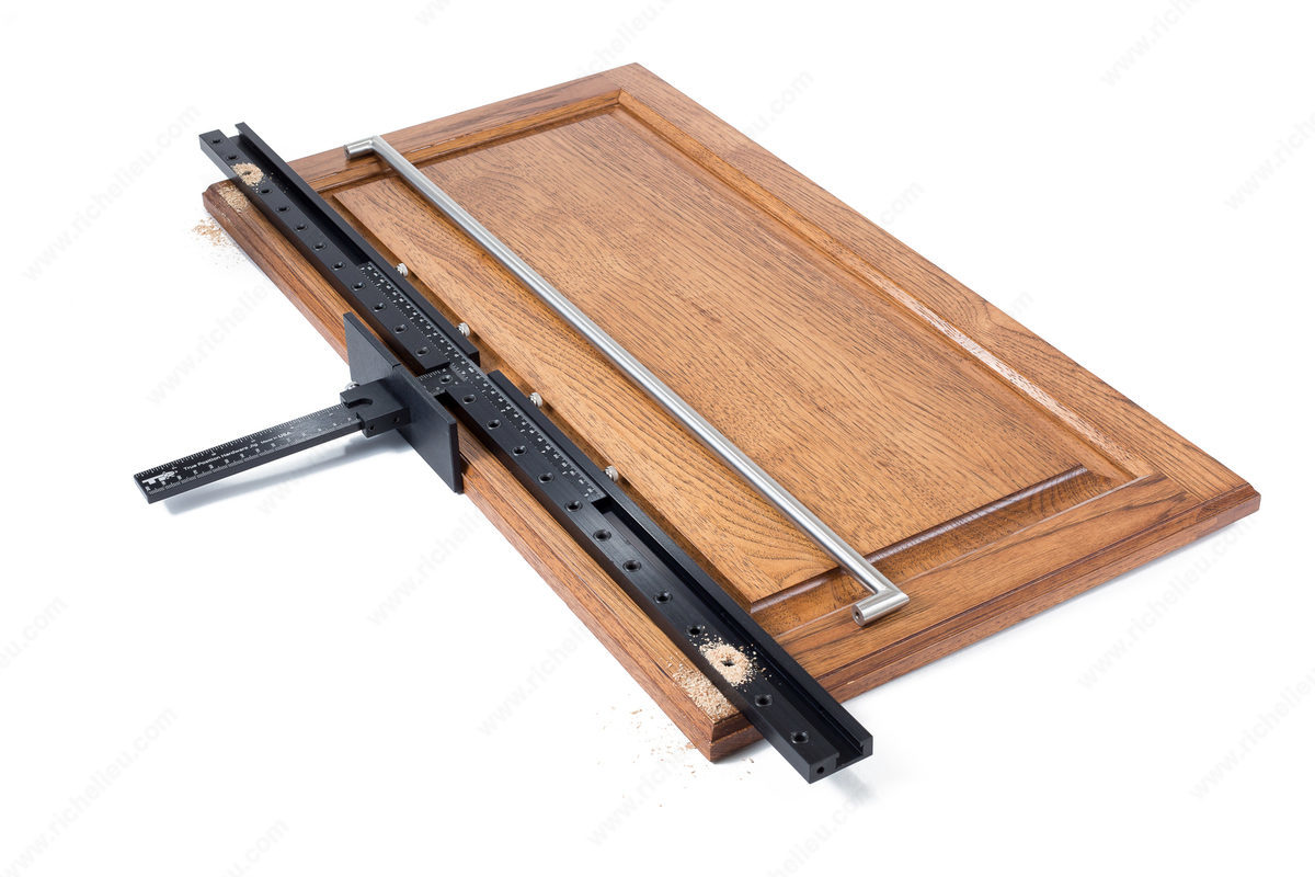 Also drills long handles up to 38" in length. Locates hardware holes of any dimension on doors and drawer fronts.