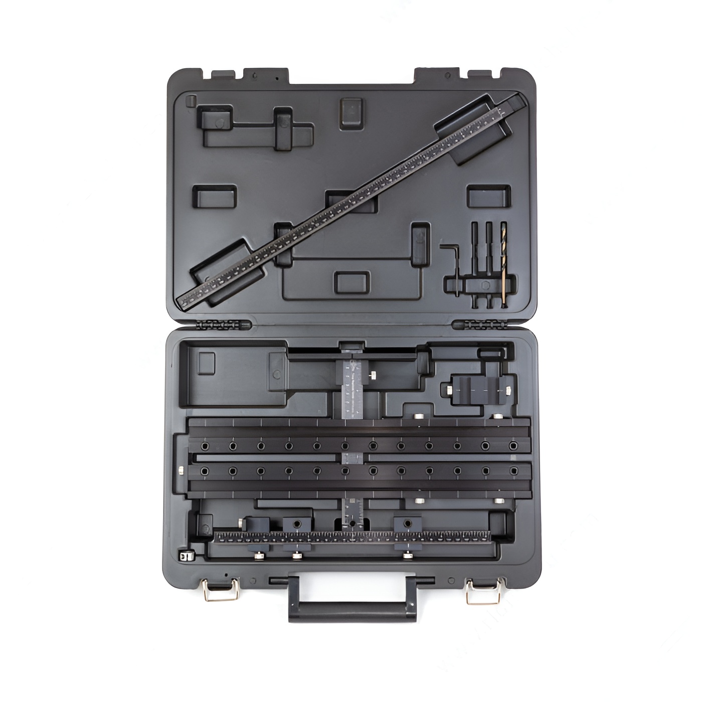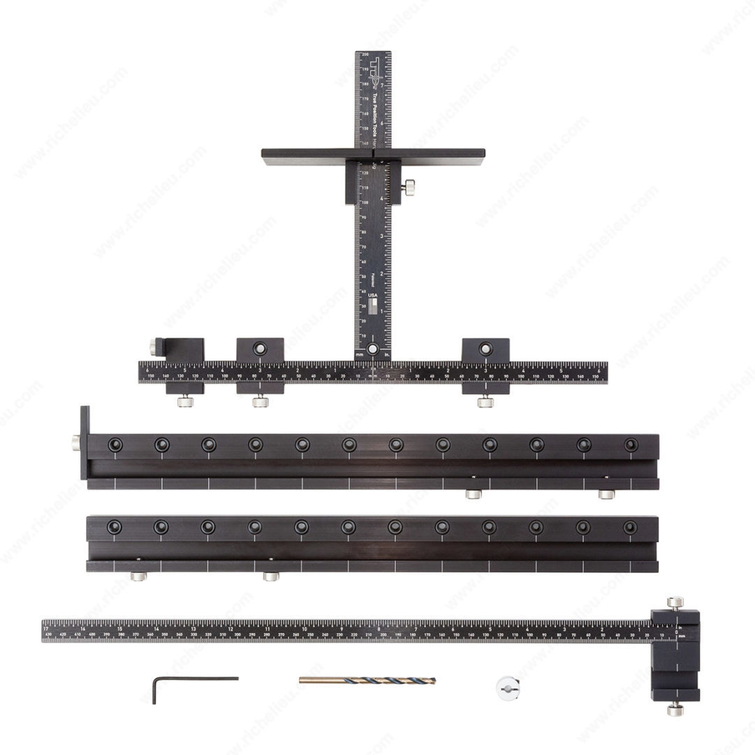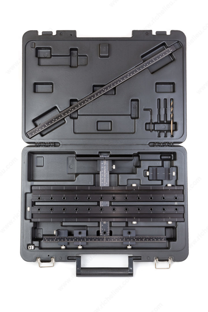 Includes the basic hardware jig (TP1934) with additional drilling extensions for 32 mm line boring and an extended ruler attachment for fast centering on drawer fronts and large doors.