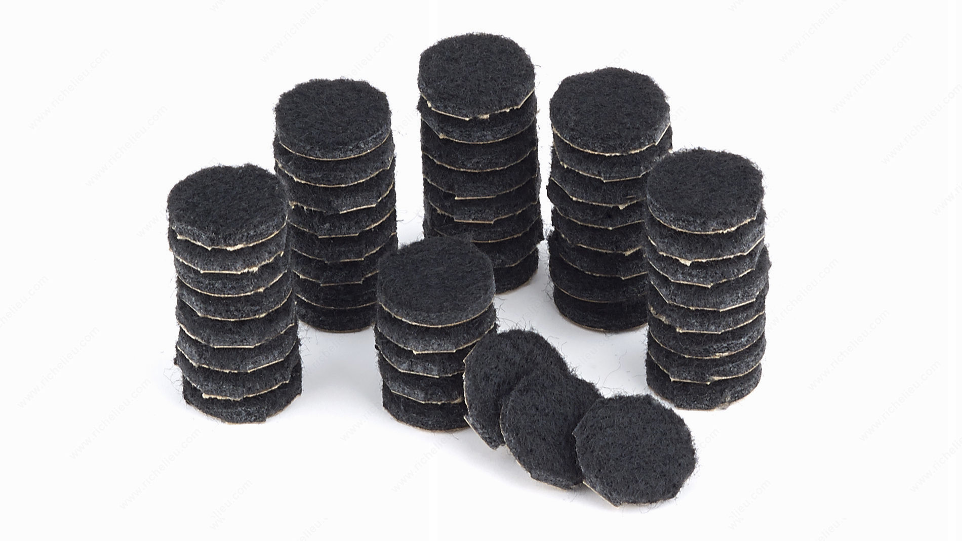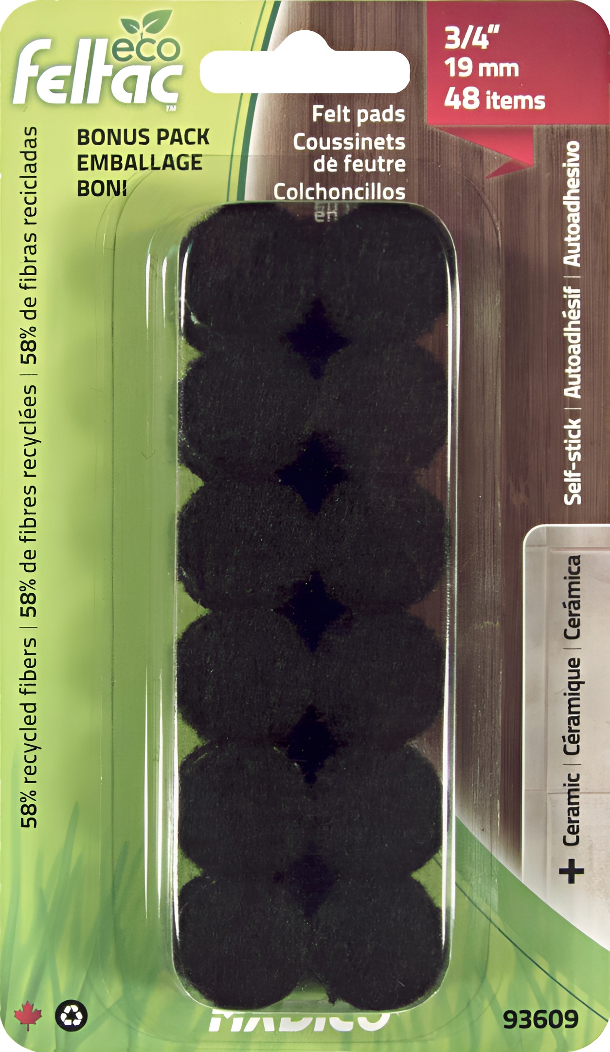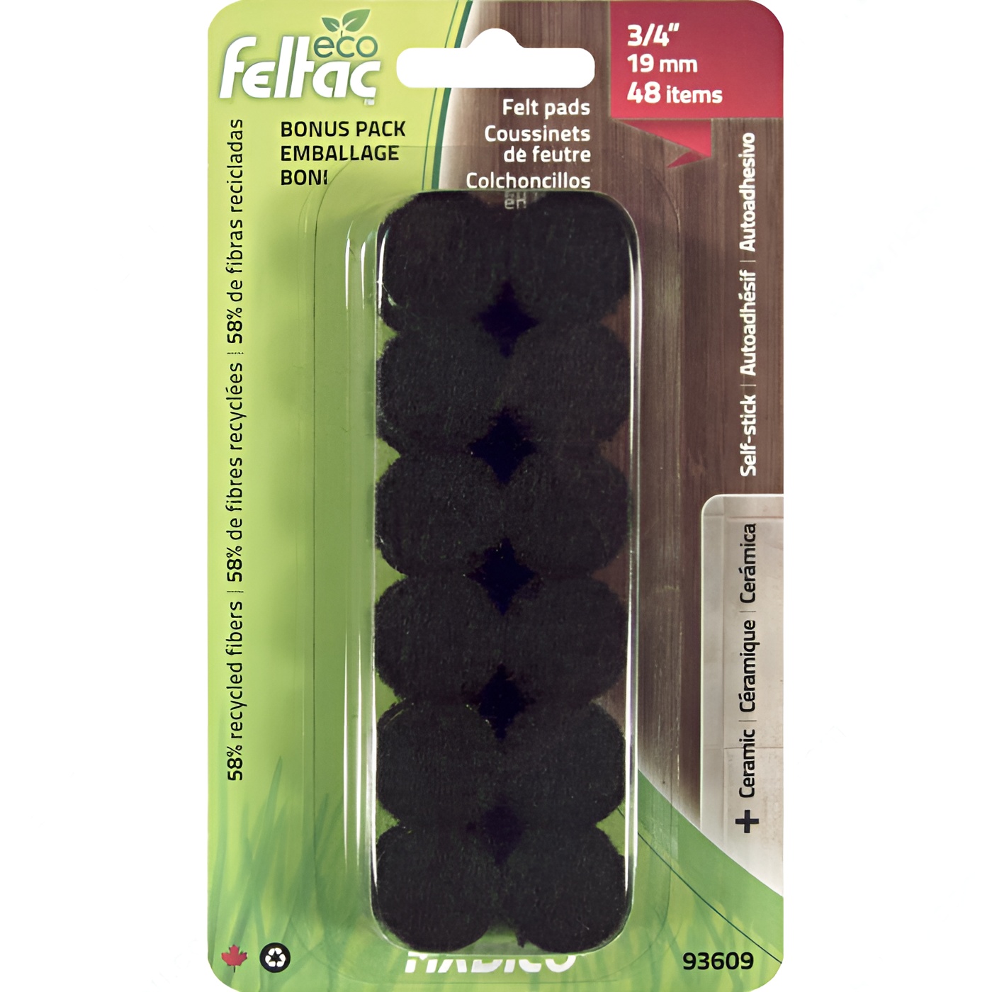 Richelieu 93609 ECO FELTAC - Black Round Felt Pads provide an exceptional solution for protecting your flooring surfaces. Made from recycled polyester fibers, these self-adhesive felt pads not only safeguard your floors from scratches and scuffs but also contribute to a more sustainable environment. The strong adhesive is injected deep into the felt, ensuring a secure bond that lasts, even under heavy furniture. With a diameter of 3/4 inch, these round pads are versatile and can be used on a variety of surfaces, including tile, ceramic, linoleum, hardwood, and laminate. This adaptability makes them an ideal choice for both residential and commercial applications. Each blister pack contains 48 units, allowing for ample coverage in your home or office. The sleek black finish blends seamlessly with any décor, making these felt pads both functional and aesthetically pleasing. Whether you're looking to protect your floors from daily wear and tear or simply seeking an easy-to-install flooring solution, Richelieu ECO FELTAC pads are designed to meet your needs. Trust in their durability and quality to keep your surfaces looking pristine while providing peace of mind.