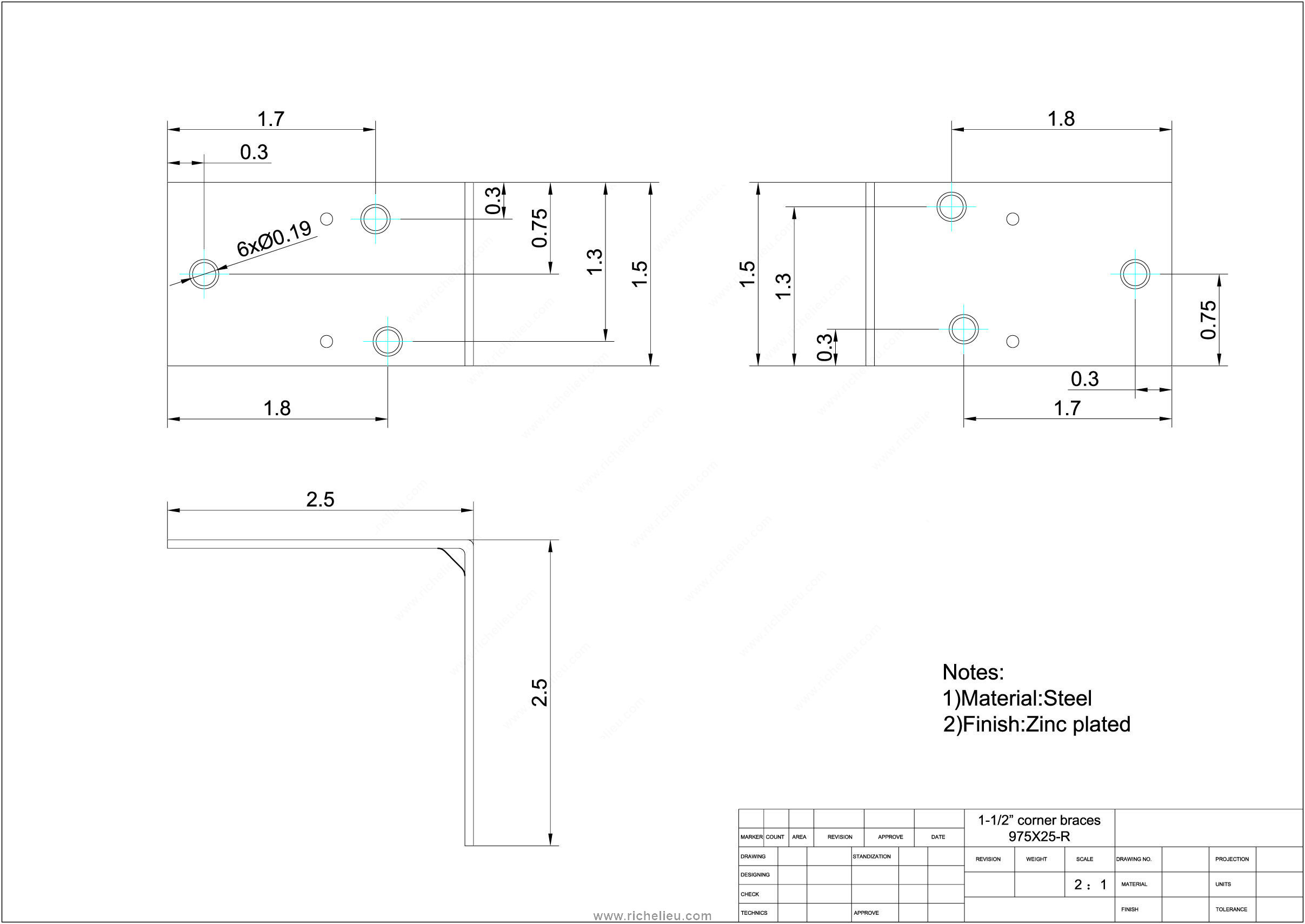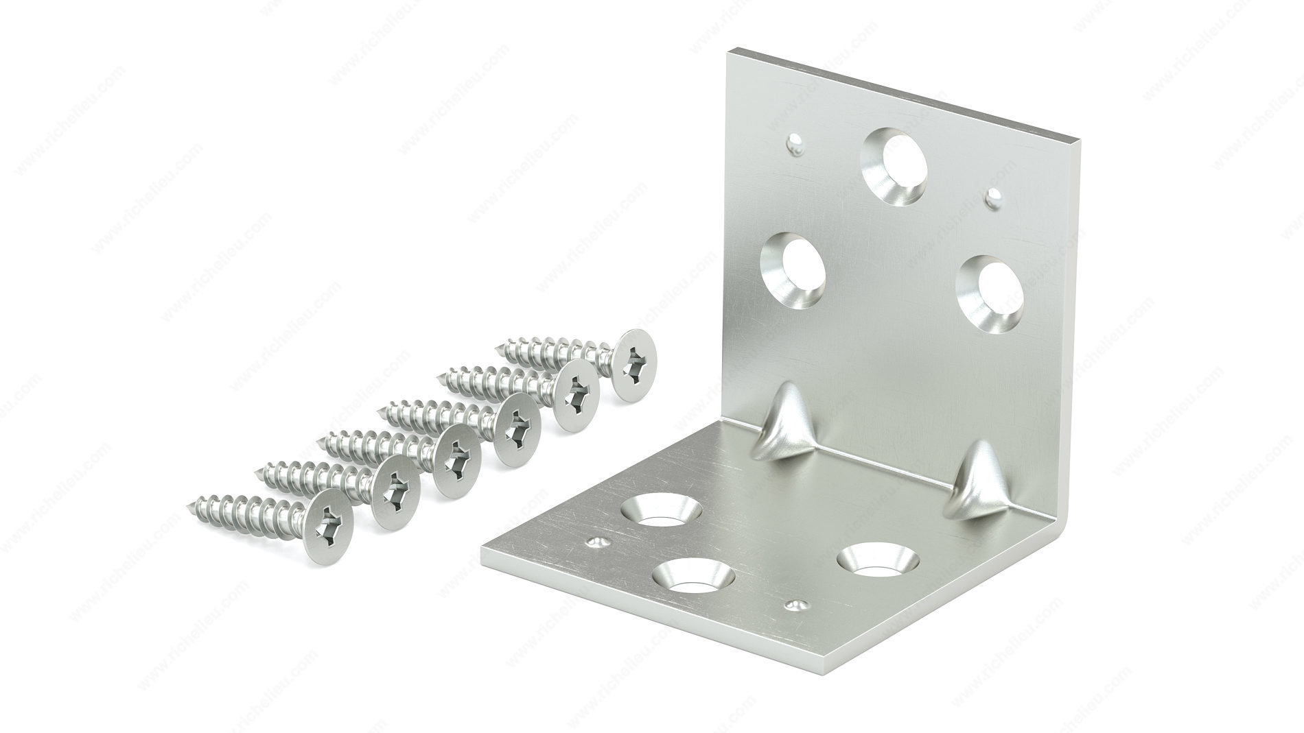 Richelieu 975X25R Double Wide Corner Brace is the ideal solution for reinforcing the inside of right angle corner joints, ensuring enhanced stability and durability for your projects. This brace features a double wide design, providing an extra layer of support that is perfect for applications involving boxes, chests, or any items that require robust corner strengthening. Crafted from high-quality steel with a zinc finish, the 975X25R not only delivers strength but also offers a sleek and polished look. Each brace measures 2 1/2 inches in length and projects 2 1/2 inches, making it versatile enough to fit various assembly needs. The width of 1 1/2 inches ensures ample coverage for effective reinforcement. Installation is straightforward, as the product comes packaged in a blister containing two units, complete with screws included for your convenience. This makes it an excellent choice for furniture assembly, allowing for quick and efficient setup. Designed by Richelieu, a trusted name in the industry, this corner brace combines functionality with reliability. Whether you are a building professional or a knowledgeable homeowner, the 975X25R Double Wide Corner Brace is a practical addition to your toolkit, helping you achieve strong and stable constructions.