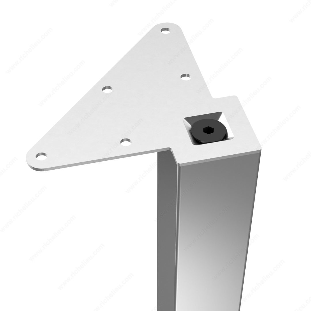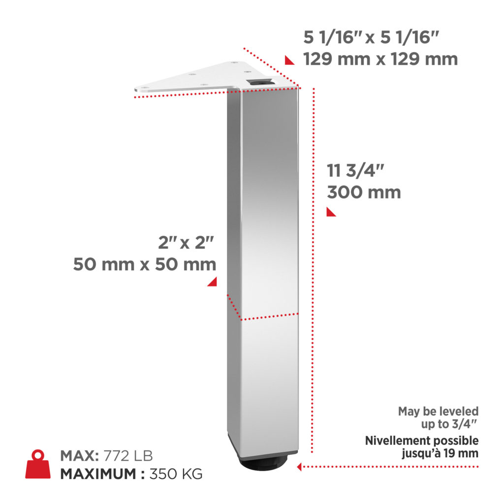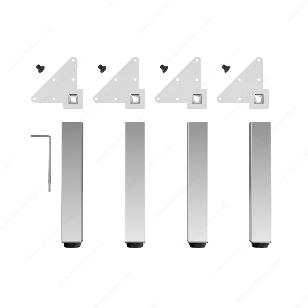 Richelieu 555300140 Adjustable Furniture Leg 555Richelieu 555300140 Adjustable Furniture Leg - 555 adds a touch of modern elegance to various spaces, including kitchens, bathrooms, living rooms, and bedrooms. Crafted from durable metal, these square furniture legs are designed to support a range of furnishings such as cabinets, sideboards, vanities, nightstands, and small tables, offering versatility for your design projects. Sold as a set of four, these heavy-duty legs are equipped with levelers that enable height adjustments of up to 3/4" to accommodate uneven floors, ensuring stability and a refined appearance. The legs can be mounted flush with the corners of your furniture, which enhances their sleek aesthetic. Each leg can support an impressive load capacity of 772 lbs, making them not only stylish but also practical. With a base dimension of 49 mm x 49 mm and a height of 11 3/4", these legs are available in a chrome finish that complements various design styles. Included in the package are mounting plates, bolts, and an Allen key for straightforward installation. Whether you’re revamping existing furniture or creating new pieces, Richelieu’s adjustable furniture legs offer the strength and adaptability you need.