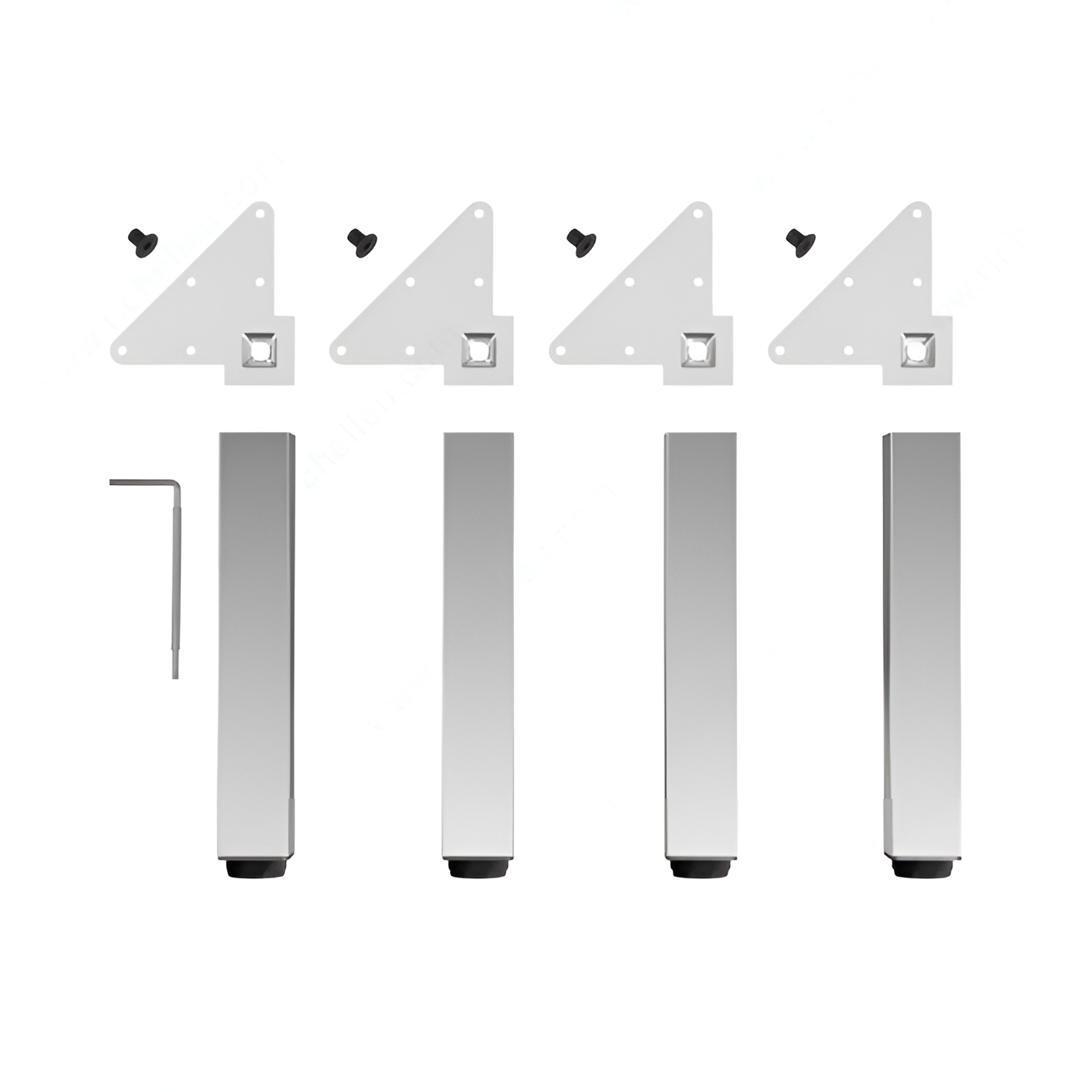 The legs come with levelers that allow you to adjust the legs' height up to 3/4" on uneven floors. Mounting plates, bolts, and an Allen key are included for easy installation.