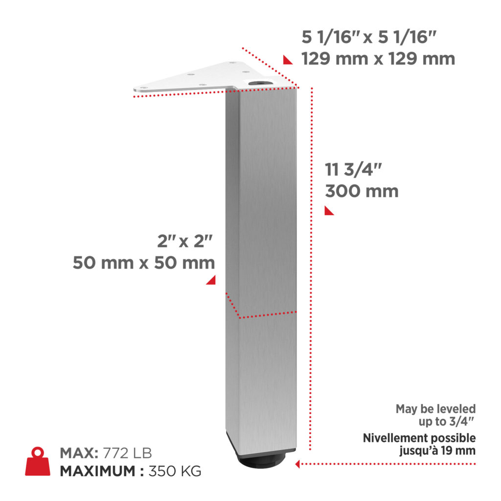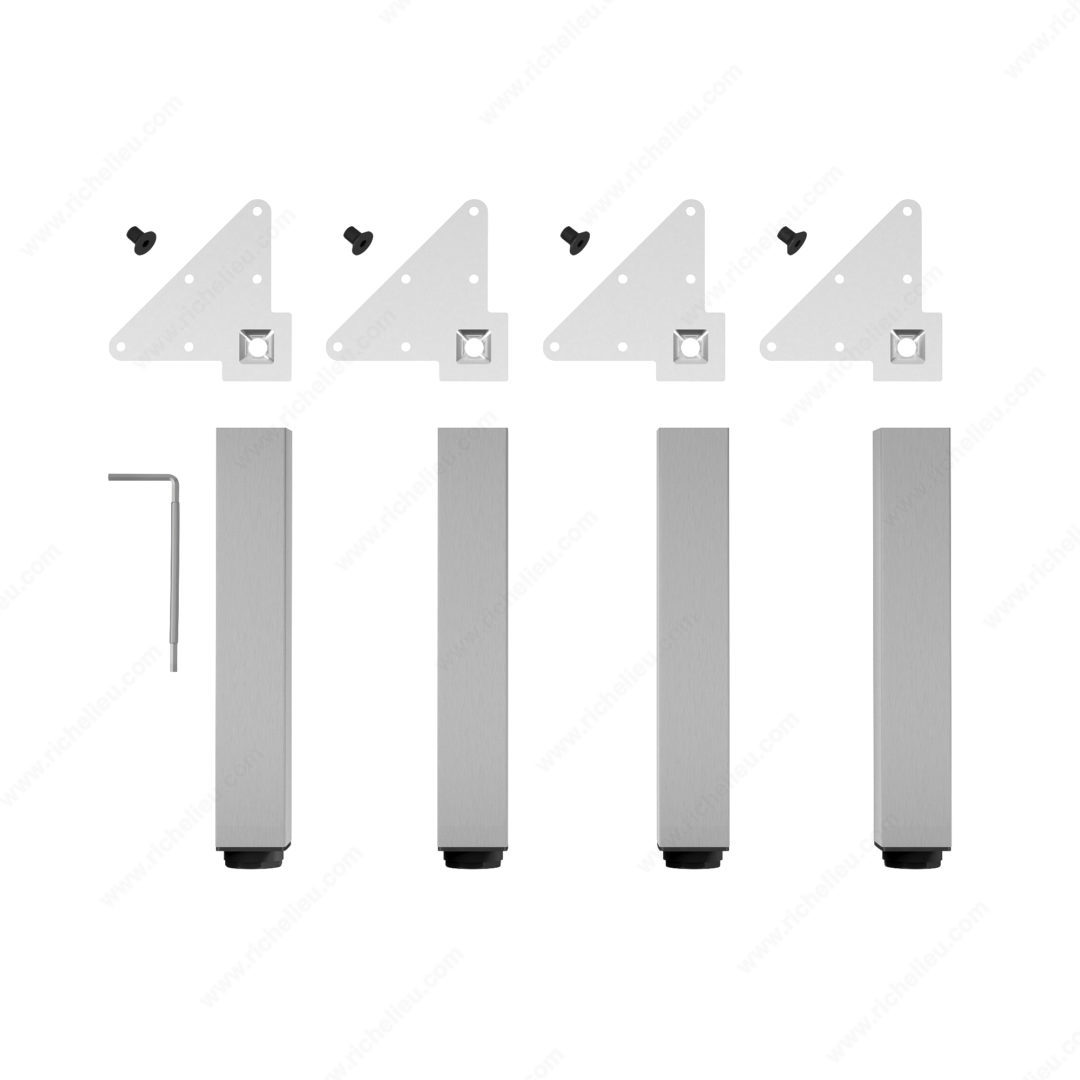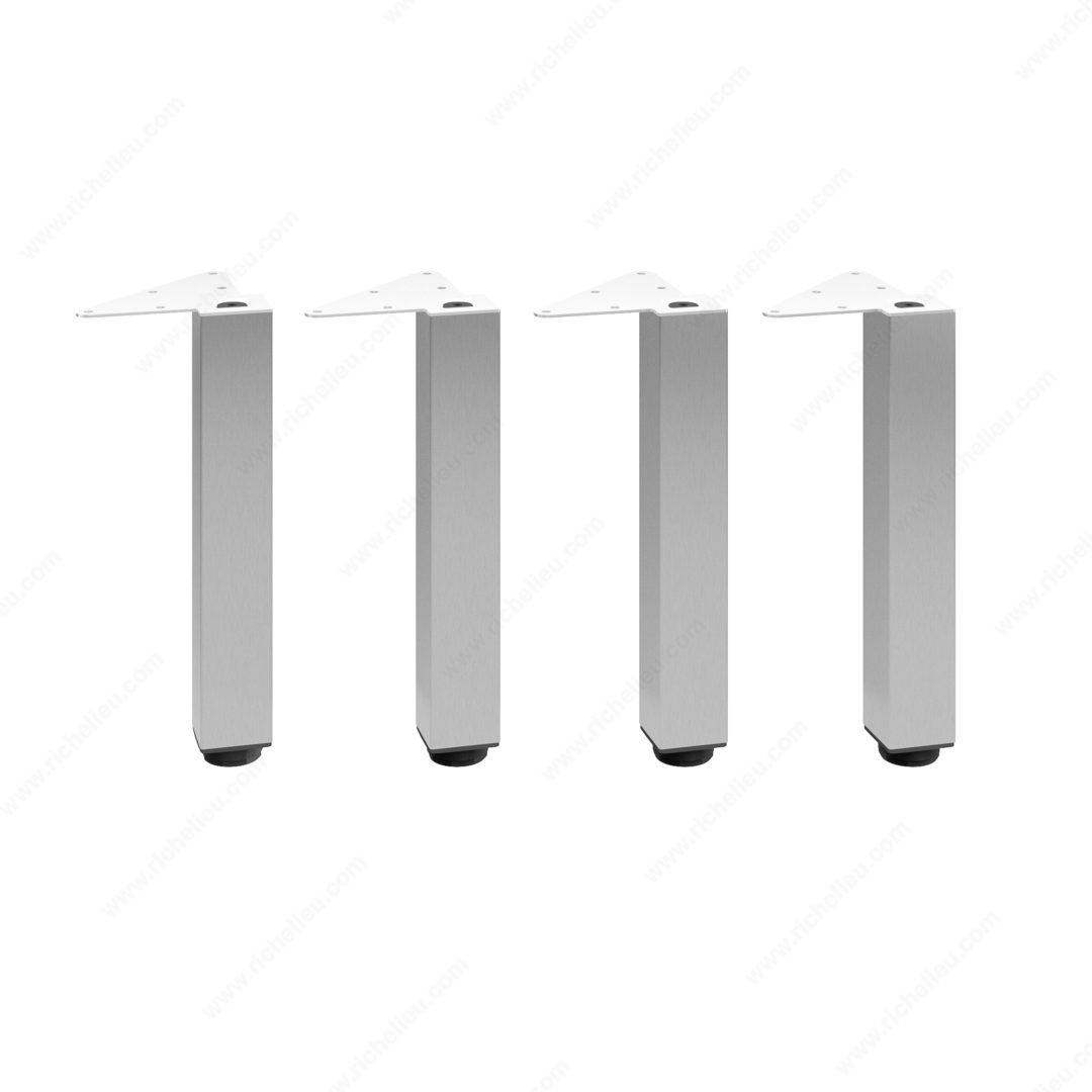 Richelieu 555300170 Adjustable Furniture Leg 555Richelieu 555300170 Adjustable Furniture Leg - 555 offers a perfect blend of style and functionality for any modern space. Crafted from durable stainless steel, these square furniture legs are designed to provide robust support for a variety of furniture items, including cabinets, sideboards, vanities, and nightstands, with an impressive load capacity of up to 772 lbs per leg. Standing at 11 3/4 inches tall, each leg features a sleek base dimension of 49 mm x 49 mm, ensuring a refined and contemporary look when mounted flush with the corners of your furniture. The adjustable height feature allows for an increase of up to 3/4 inch, making it simple to achieve stability on uneven floors. Sold as a set of four, these legs come complete with mounting plates, bolts, and an Allen key for straightforward installation. The versatile design and variety of finishes available enable you to coordinate these legs seamlessly with your existing décor. Whether you're updating your kitchen, bathroom, living room, or bedroom, Richelieu's Adjustable Furniture Leg is an excellent choice for enhancing the aesthetic and structural integrity of your furniture. Elevate your space with these stylish and practical components.