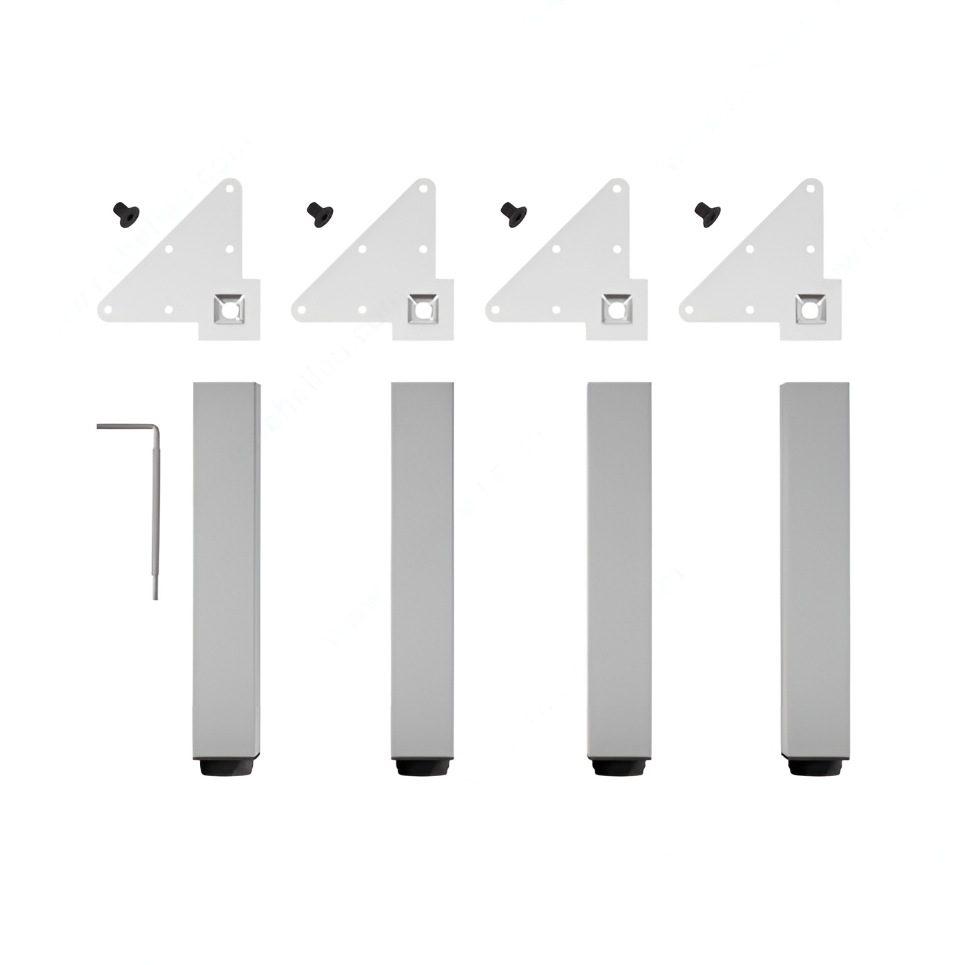 The legs come with levelers that allow you to adjust the legs' height up to 3/4" on uneven floors. Mounting plates, bolts, and an Allen key are included for easy installation.