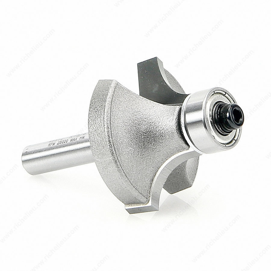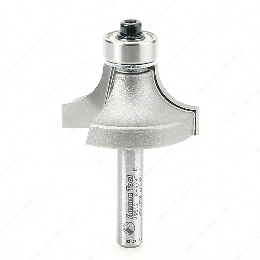 Richelieu AT49512 Corner Rounding Bit is a versatile tool designed for edge profiling, rounding, and rabbet cutting. This essential edge-forming bit rounds edges to a precise radius, making it ideal for achieving a refined finish on various woodworking projects. With a diameter of 1 1/4 inches and a 3/8-inch radius, it allows for smooth transitions and aesthetically pleasing contours. Constructed with a carbide-tipped material, the AT49512 ensures durability and sharpness, providing clean cuts that enhance the quality of your work. The bit is shouldered to cut a fillet, which adds functionality for easing edges or creating simple profiles as part of more complex designs. For added versatility, using a smaller pilot bearing can transform the bit into a beading bit, allowing for even greater creativity in your projects. Featuring an overall length of 2 3/16 inches and a 1/4-inch shank, this router bit is compatible with standard routers, making it easy to integrate into your existing toolkit. Whether you're a professional woodworker or an enthusiastic DIYer, the Richelieu AT49512 Corner Rounding Bit will elevate your craftsmanship and help you achieve flawless finishes with ease.