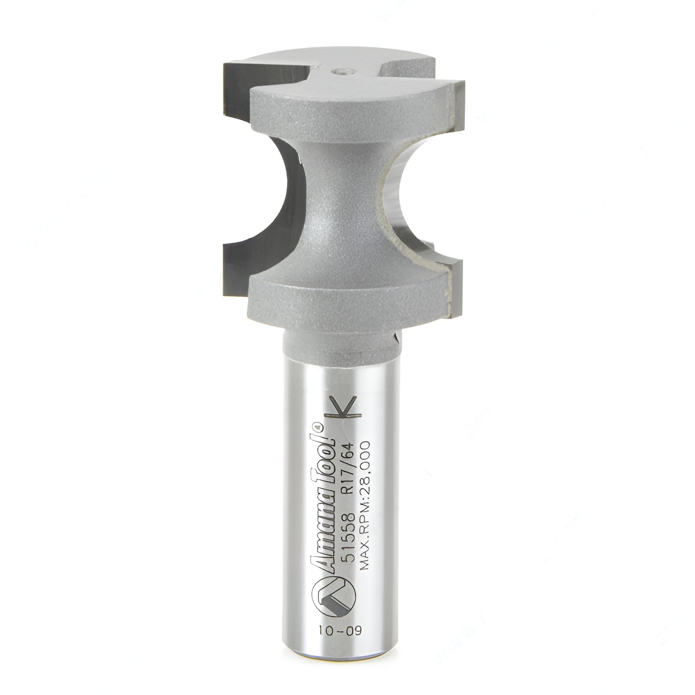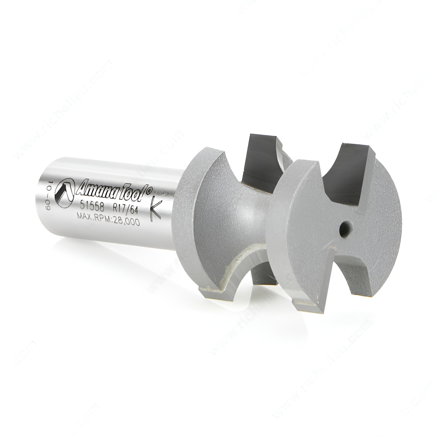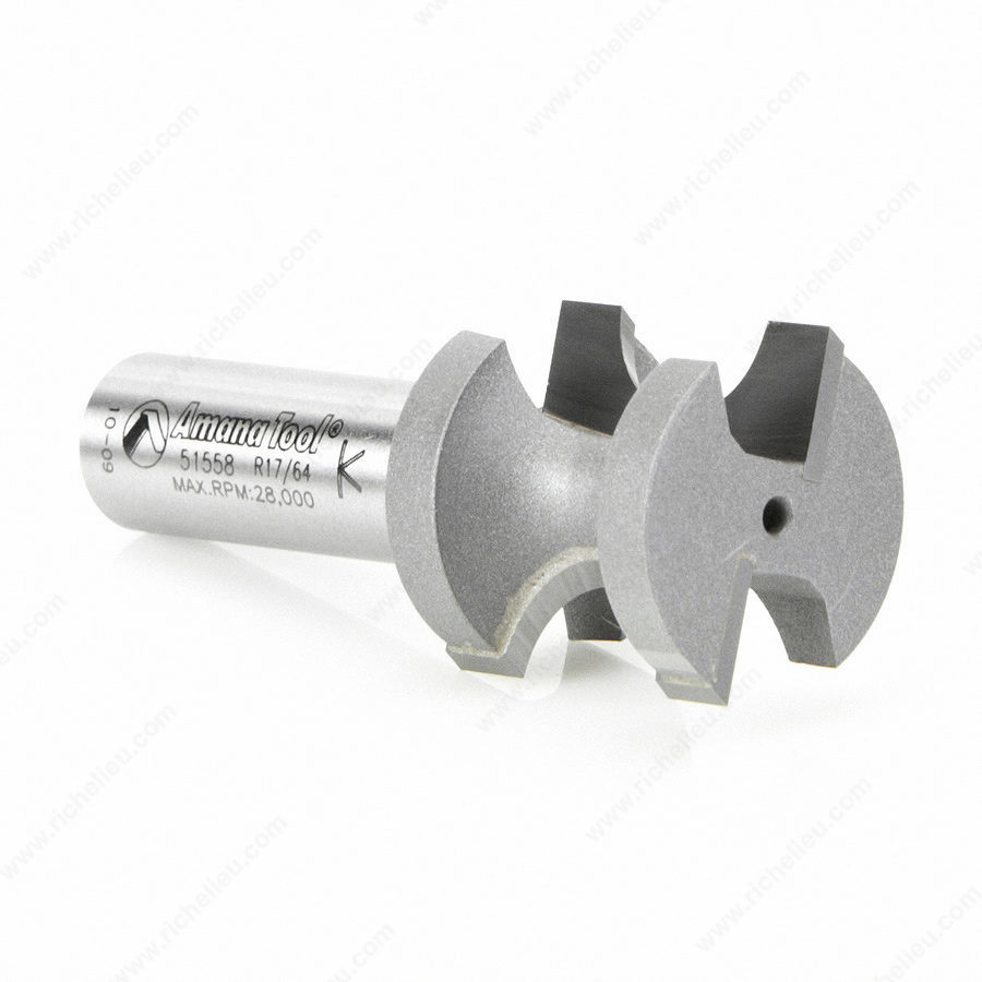 Richelieu AT51558 Bullnose Radius Bit is designed to shape the full edge of various workpieces with precision and ease. This versatile tool is perfect for crafting stair treads, window sills, table and counter edges, shelves, and intricate moldings. With a nose diameter that allows for a complete 180-degree roundover, it ensures a smooth, professional finish on your projects. The cutting edges feature flats at both the top and bottom, which create fillets on stock thicker than the nose diameter, enhancing the aesthetic quality of your work. For optimal performance, this bit should be used with an edge guide on handheld routers or the fence on a router table, ensuring accurate and consistent results. Constructed from carbide-tipped material, the AT51558 is built for durability and long-lasting use. The bit has a cut diameter of 1 1/32 inches and a radius of 17/64 inches, making it ideal for a range of applications, including profiling and rabbeting. With an overall length of 2 1/2 inches and a 1/2-inch shank, it fits securely into various CNC and router tools. Elevate your woodworking projects with the reliability and precision of the Richelieu AT51558 Bullnose Radius Bit.