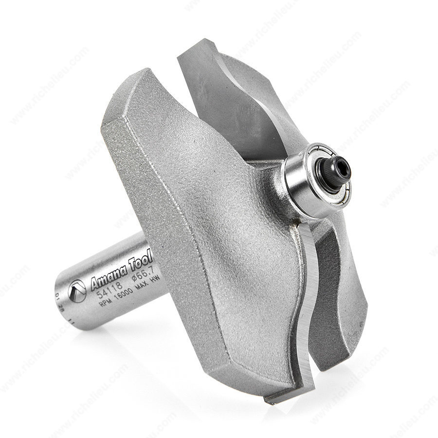 Richelieu AT54118 Ogee Raised Panel Bit empowers craftsmen to create exquisite raised panels for cabinet doors, frame-and-panel furniture, and architectural paneling. Designed for precision, this cutter forms a fillet to clearly define the raised field, with a shaped band surrounding it and an integral tongue that fits perfectly into the panel groove of frame members. Notably, the profile contour and reveal width can be customized to meet your design needs. Constructed with carbide-tipped materials, this router bit excels in delivering a polished finish across a variety of substrates including solid hardwood, softwood, MDF, plywood, and even abrasive materials like plastic and Corian. The cutter measures a cut diameter of 2 5/8 inches, with an overall length of 2 1/2 inches and a 3/4 inch radius, ensuring versatility in your projects. Its 1/2 inch shank makes it compatible with table-mounted routers of 3+ horsepower, and it should be operated at reduced speeds for optimal performance. For best results, multiple passes are recommended, especially when working with panels that feature curved edges. Elevate your woodworking projects with the precision of the Richelieu AT54118 Ogee Raised Panel Bit.