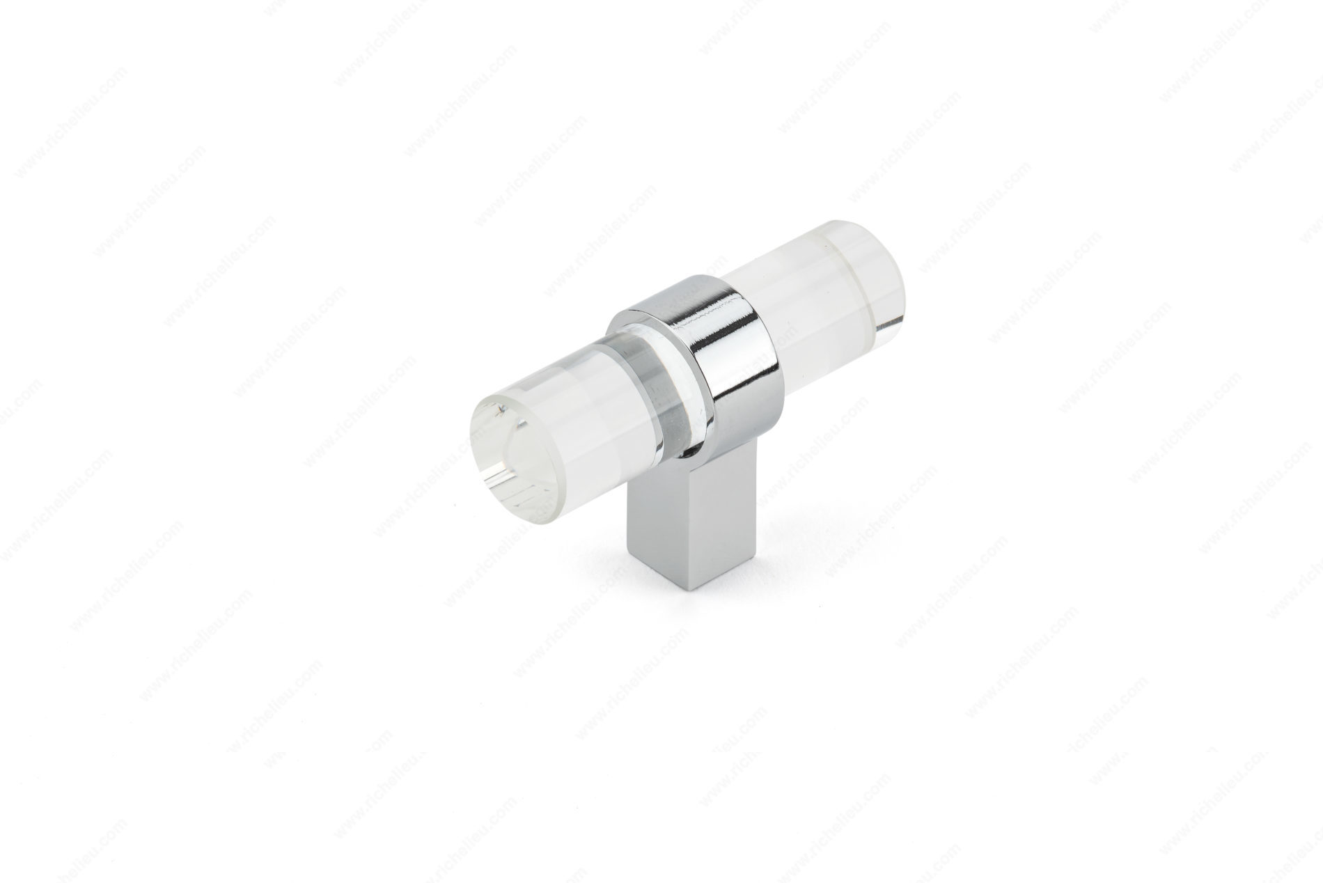 Richelieu BP02065014011 Modern Glass and Metal Knob - 0206 combines elegance and functionality, making it an ideal addition to any cabinetry or furniture piece. This T-bar knob features a stunning interplay of clear glass and chrome-finished metal, creating a sophisticated touch that enhances modern interiors. With overall dimensions of 1 31/32 inches in length, 3/4 inch in width, and a projection of 1 5/16 inches, this knob is designed to fit comfortably in hand while maintaining a sleek profile. The clear color and contemporary design allow it to seamlessly integrate into various décor styles, from minimalist to eclectic. Constructed from durable metal and glass, the Richelieu knob not only adds aesthetic appeal but also promises longevity and resilience. It comes complete with an 8/32 inch screw for easy installation, ensuring that you can enhance your space without hassle. Whether you're updating kitchen cabinetry or refreshing furniture pieces, the Richelieu BP02065014011 Modern Glass and Metal Knob is a stylish choice that elevates your design while providing reliable functionality. Ship via UPS for convenience, making it an accessible option for building professionals and discerning homeowners alike.