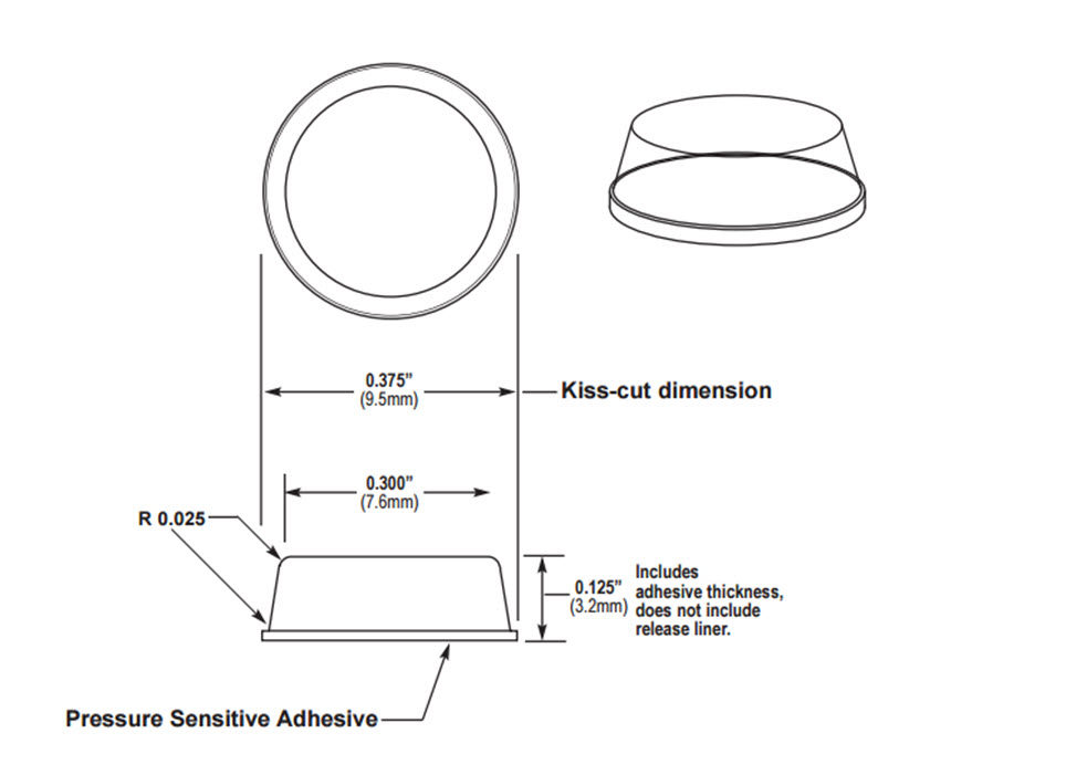 Richelieu BP0323411 Self-Adhesive Polyurethane Bumper - 9.5mm x 3.2 mm is a versatile solution designed to protect surfaces while providing stability and preventing unwanted sliding. Crafted from durable polyurethane, these bumpers feature a flat top shape that makes them ideal for load-bearing applications, such as serving as feet for small appliances, cutting boards, or laptops. The innovative design allows for numerous applications, including serving as spacers under glass tables, providing airflow under network equipment, or safeguarding walls behind picture frames. Each bumper measures 9.5 mm in height (including adhesive thickness) and 3.2 mm in thickness, with a diameter of 3/8 inch and a top diameter of 0.299 inches. The product comes in a convenient sheet format, with 300 pieces per sheet, ensuring you have enough for various projects. With a tolerance of 0.5 mm (+-0.02"), these bumpers provide reliable performance for both professional and DIY applications. To use, simply peel and stick the bumper feet to your desired location, making installation quick and straightforward. Available in a clear finish, these bumpers seamlessly blend into any environment, enhancing both functionality and aesthetics.