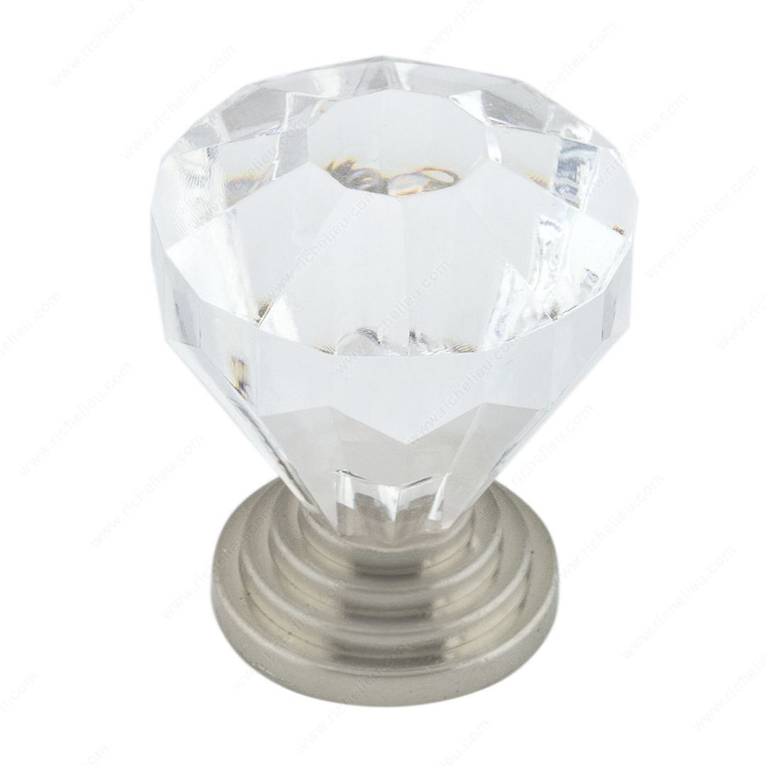 Richelieu BP1008919511 Eclectic Acrylic and Metal Knob - 10089 brings an exquisite blend of luxury and sophistication to your kitchen or bathroom cabinets. Crafted with a stylish combination of acrylic and metal, this knob features a clear finish with brushed nickel accents, making it an ideal choice for contemporary and eclectic decor styles. With an overall diameter of 1 1/4 inches and a base diameter of 15/16 inches, this knob is both visually appealing and functional. Its projection of 1 17/32 inches provides a comfortable grip while maintaining an elegant profile. Designed to support a load capacity of up to 2.2 pounds, it is sturdy enough for daily use while adding a refined touch to your cabinetry. This product is easy to install, as it comes with an 8/32 inch screw included in the packaging. Packaged in a blister for protection, the Richelieu BP1008919511 is not only a practical hardware solution but also a stylish accessory that enhances the overall aesthetic of your space. Ideal for those looking to elevate their interiors with quality design, this knob is a perfect choice for professionals and discerning homeowners alike.