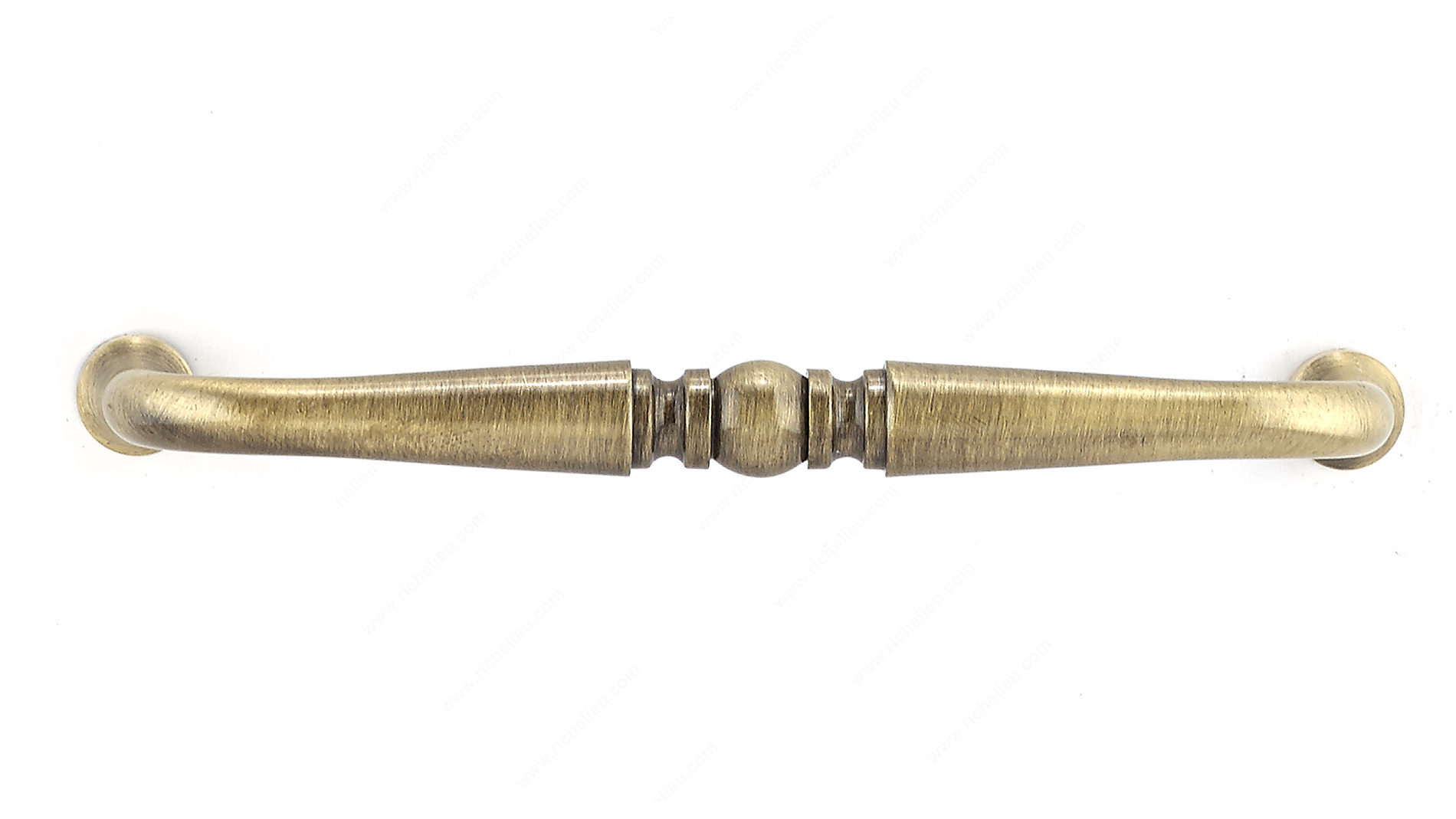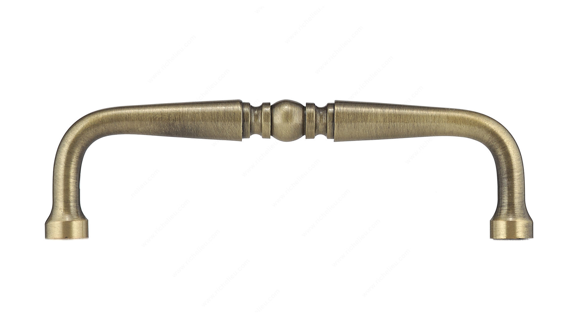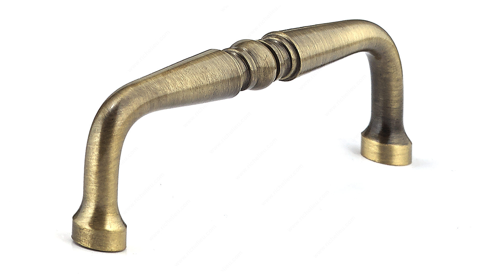 Richelieu BP1452AAE Traditional Metal Pull - 145 brings a refined elegance to your kitchen or bathroom decor. This stunning pull features simple lines complemented by beautifully crafted handle details, embodying a classic design that enhances any cabinetry. With a center-to-center measurement of 3 25/32 inches, it is perfectly suited for a variety of applications, ensuring a seamless fit. Crafted from durable zamak, the pull boasts an Antique English finish that adds warmth and character, making it an ideal choice for traditional and contemporary spaces alike. Measuring 4 1/8 inches in overall length and projecting 1 3/16 inches, it provides both functionality and style. The width of 11/32 inches ensures a comfortable grip, making it easy to open drawers and cabinets. Each package includes 8/32 inch screws for effortless installation, so you can quickly elevate your space without hassle. The pull is available in a striking yellow and brass color combination, making it a standout feature in your home. Shipments are convenient via UPS, ensuring you receive your order promptly. Choose the Richelieu BP1452AAE Traditional Metal Pull for a touch of timeless sophistication in your living areas.