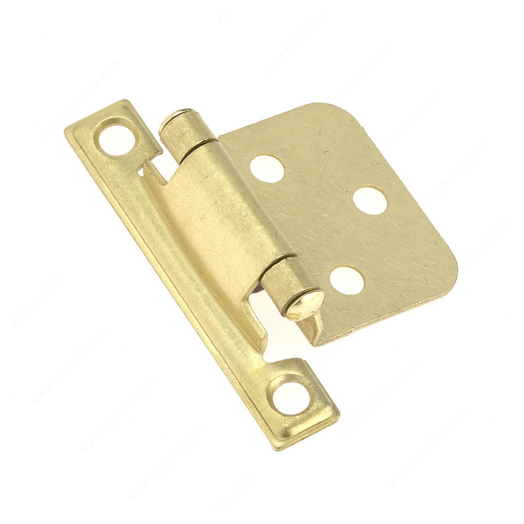 Richelieu BP234160 Semi-Concealed Self-Closing Hinge - 234 adds a touch of elegance and functionality to any project. Crafted from durable steel and finished in a sophisticated satin brass, this hinge is designed to seamlessly blend with various decors, making it an ideal choice for kitchens, bathrooms, and furniture applications. Its traditional surface hinge design offers reliable self-closing capabilities, ensuring doors close securely and softly, enhancing both safety and convenience. With overall dimensions of 2 11/16 inches in height, 1 13/16 inches in width, and a projection of 25/32 inches, this hinge is compact yet sturdy enough for everyday use. The semi-concealed installation provides a clean aesthetic, while the screw-on fixing type makes for easy installation, with wood screws included in the packaging for added convenience. Sold in a bag of two units, the Richelieu BP234160 hinge is versatile enough to accommodate variable types of coverings, making it a practical choice for various cabinetry projects. Experience the perfect blend of style and functionality with this classic hinge that enhances both the appearance and performance of your doors.