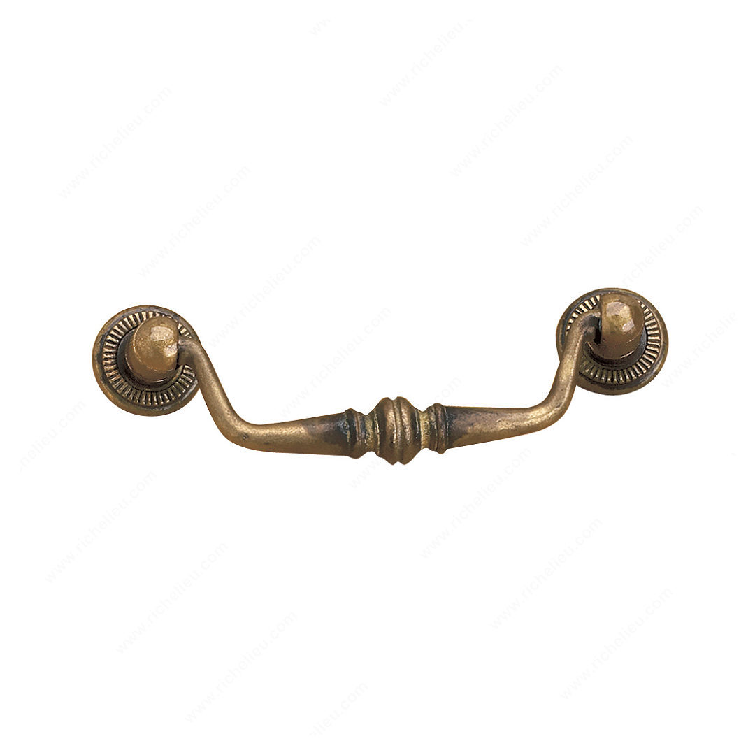 Richelieu BP303580163 Traditional Metal Pull - 3035 adds a touch of opulence to your home décor with its richly embellished design from the Povera Collection. This exquisite drop pull is ideal for enhancing various styles of cabinetry and furniture, seamlessly fitting into both classic and contemporary settings. Measuring 3 15/16 inches in length, 1 1/4 inches in width, and featuring a projection of 5/8 inches, this pull provides a substantial grip while maintaining an elegant profile. The center-to-center measurement of 3 5/32 inches ensures compatibility with standard cabinet layouts. Crafted from high-quality metal and finished in oxidized brass, the BP303580163 showcases a luxurious yellow and brass color palette that elevates any space. Included with the pull is an M4 screw for easy installation, making it a convenient choice for both professionals and DIY enthusiasts. The traditional pendant and ring pull style reflects a timeless aesthetic, perfect for adding character to kitchen cabinets, dressers, or any furniture piece requiring a stylish upgrade. Richelieu's commitment to quality and design is evident in this stunning pull, making it a must-have accessory for anyone looking to enhance their home’s interior.