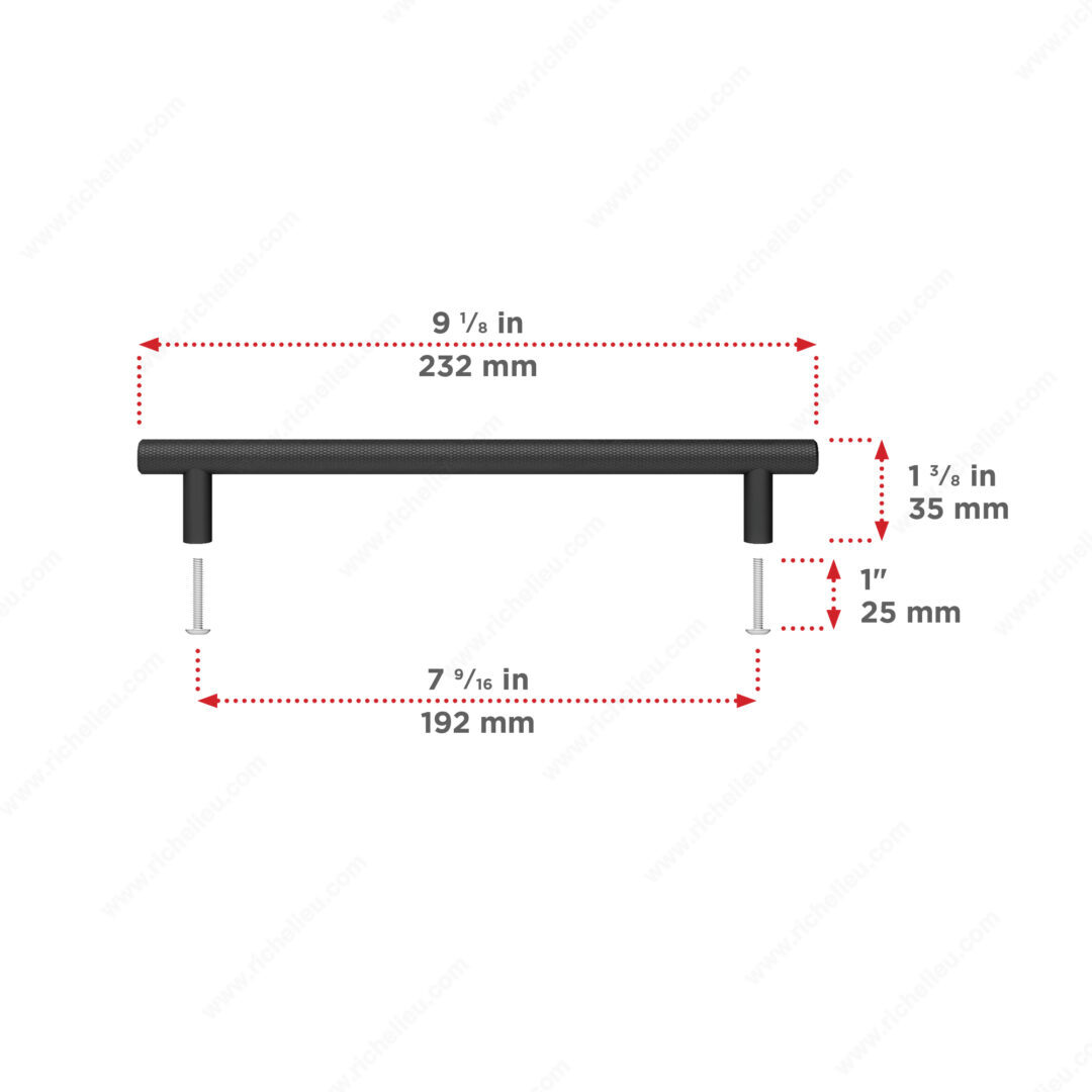 Richelieu BP3060192900 Modern Metal Pull - 3060 embodies a blend of form and function, making it an essential choice for cabinetry and furniture upgrades. Crafted from sturdy aluminum, this pull features a sleek, textured design that ensures durability while enhancing the aesthetic appeal of any space. The matte black finish (Finish Number: 900) offers a contemporary touch, making it versatile enough to complement a variety of interior styles. With an overall length of 9 1/8 inches and a center-to-center measurement of 7 9/16 inches, this pull is designed for comfortable gripping and easy handling. The pull measures 1 3/8 inches in projection, providing just the right amount of depth for accessibility. Its width is a refined 15/32 inches, ensuring it fits seamlessly into modern cabinetry designs. Included with the pull are M4 screws (25 mm length) for straightforward installation, allowing you to enhance your space without the hassle. Part of the comprehensive 3060 collection, the Richelieu BP3060192900 is not just a functional hardware piece; it’s a statement of style and quality that stands the test of time. Upgrade your cabinetry today with this modern metal pull and enjoy its lasting beauty and functionality.