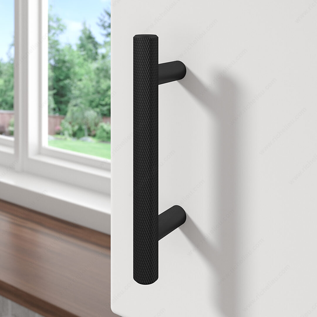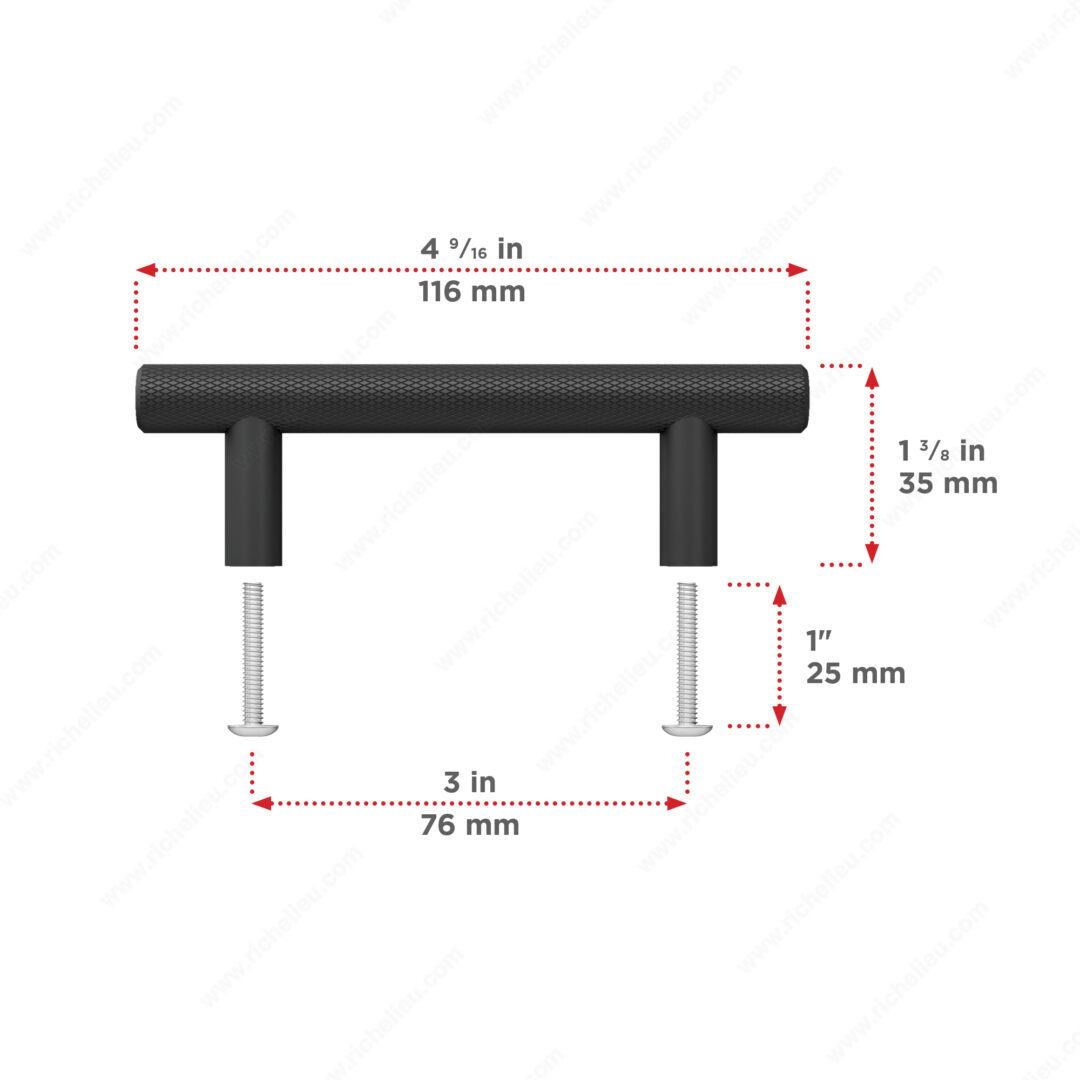 Richelieu BP306096900 Modern Metal Pull - 3060 features a textured and sturdy design that enhances the aesthetic appeal of cabinetry and furniture. Crafted from high-quality aluminum, this pull is not only durable but also lightweight, making it a practical choice for any modern space. The matte black finish adds a touch of sophistication, allowing it to blend seamlessly with various design styles. With a center-to-center measurement of 3 25/32 inches, this pull is perfectly sized for comfortable grip and functionality. Its overall dimensions measure 5 11/32 inches in length, 15/32 inches in width, and a projection of 1 3/8 inches, ensuring it provides a substantial yet sleek profile. The modern style complements a variety of design themes, making it a versatile choice for both residential and commercial applications. Included with the pull are M4 screws, measuring 25 mm in length, ensuring easy installation. This product is part of Richelieu's complete collection, model 3060, and ships conveniently via UPS. Elevate your cabinetry with the Richelieu BP306096900, where form meets function in a timeless design.