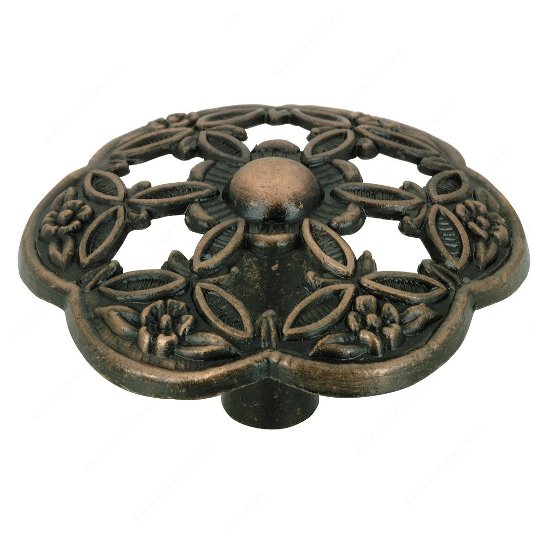 Richelieu BP37500190 Traditional Metal Knob - 3750 delivers timeless elegance to your kitchen or bathroom with its classic design. This knob features a charming flowered detail that adds a subtle touch of sophistication, making it an ideal choice for traditional décor. Crafted from durable metal, the knob boasts an old copper finish that not only enhances its aesthetic appeal but also ensures long-lasting performance. With an overall diameter of 1 21/32 inches and a projection of 29/32 inches, it offers a comfortable grip while maintaining a compact profile. The knob is available in a captivating color palette of red, rose, and rust, allowing it to blend seamlessly with various design schemes. Installation is straightforward, as the Richelieu BP37500190 comes with an included 8/32 inch screw for a secure fit. This traditional-style knob is perfect for those looking to bring a touch of classic charm to their cabinetry. Whether you are a building professional or a discerning homeowner, this knob is sure to enhance the overall aesthetic of any space while providing functionality. Upgrade your interiors with the Richelieu BP37500190 Traditional Metal Knob and enjoy the perfect fusion of form and function.