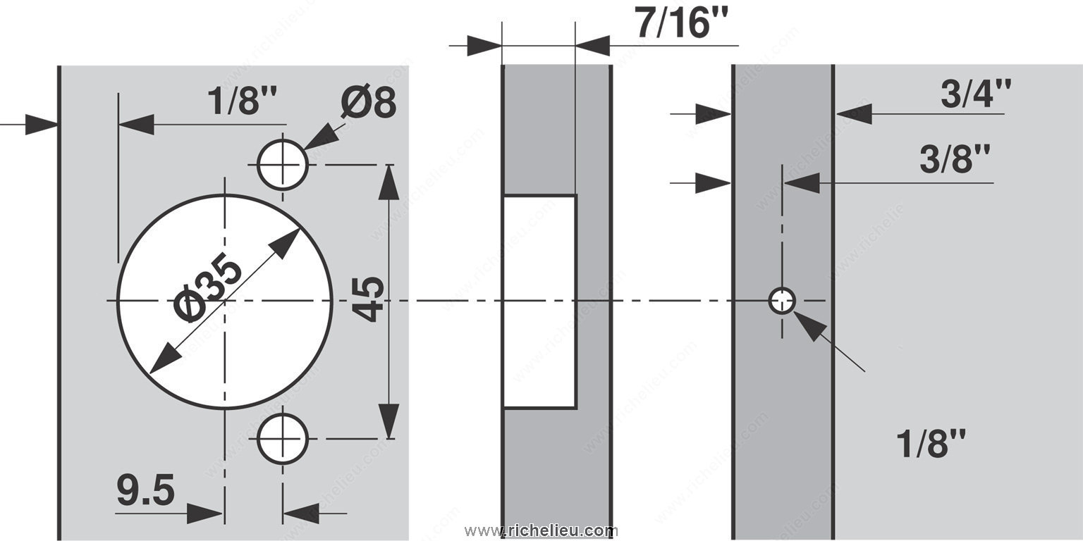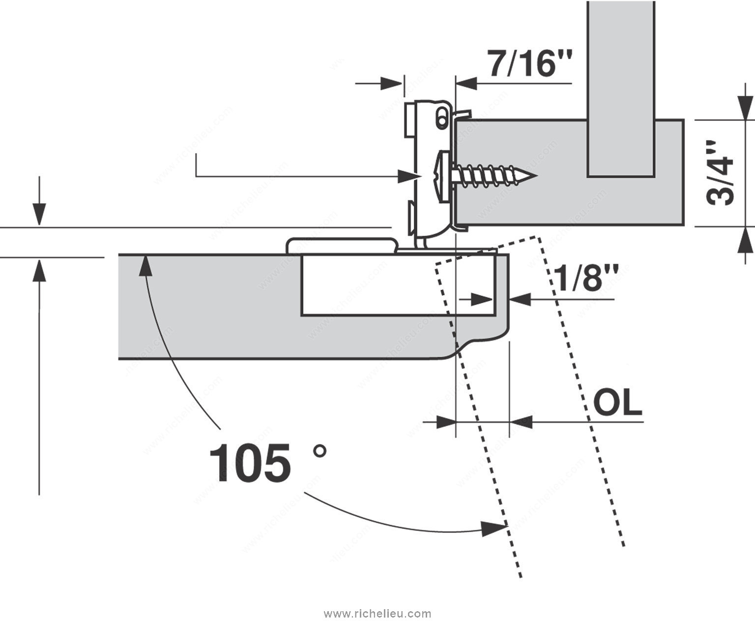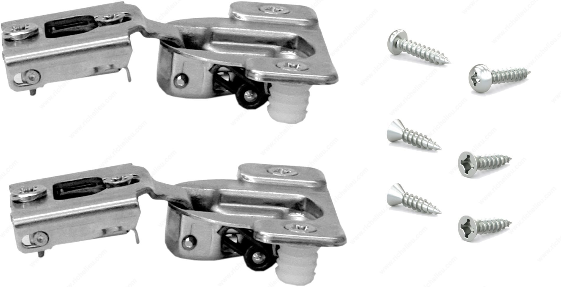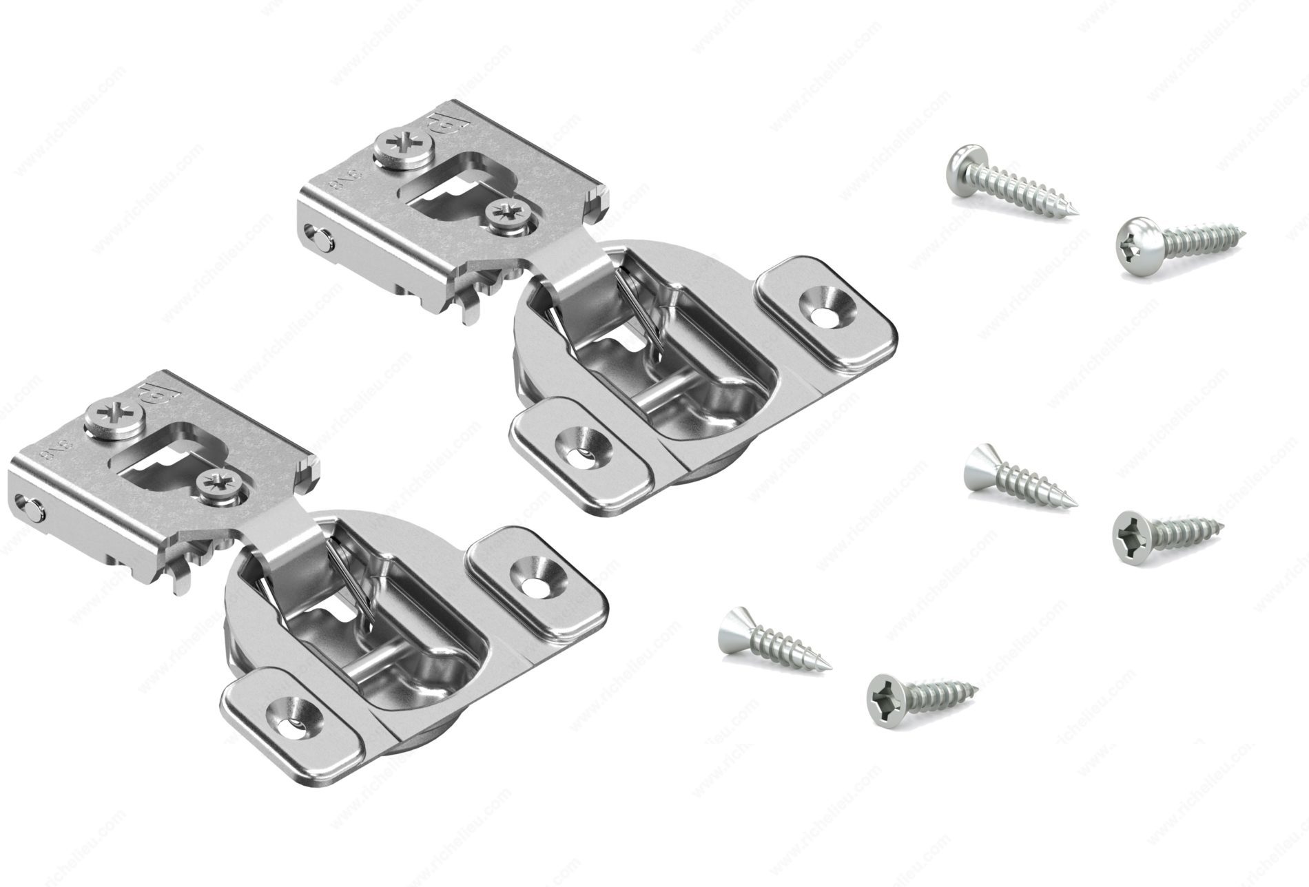 Richelieu BP38N35508180S COMPACT 38N Hinge 105 offers a seamless solution for your face frame cabinet needs. Designed with versatility in mind, these concealed hinges are adjustable in side, height, and depth, making them suitable for both small and large overlays. This adaptability allows for a wide range of applications, ensuring a perfect fit for your cabinetry. Crafted from durable steel, the hinge features a spring closing mechanism that enhances functionality, providing a smooth and reliable door operation. With a hinge opening angle of +105°, access to cabinet interiors is both convenient and efficient. The maximum cabinet and door thickness is 3/4 inch, allowing compatibility with standard cabinetry. The BP38N35508180S hinge is designed for a half overlay door position and features a wrap-around mount that simplifies installation. Each package includes two units, complete with screws for easy fixing. The hinge is designed for use with standard doors, providing a robust and reliable solution for your cabinetry projects. Experience the quality and performance of Richelieu’s COMPACT hinges, perfect for both professionals and discerning homeowners alike.