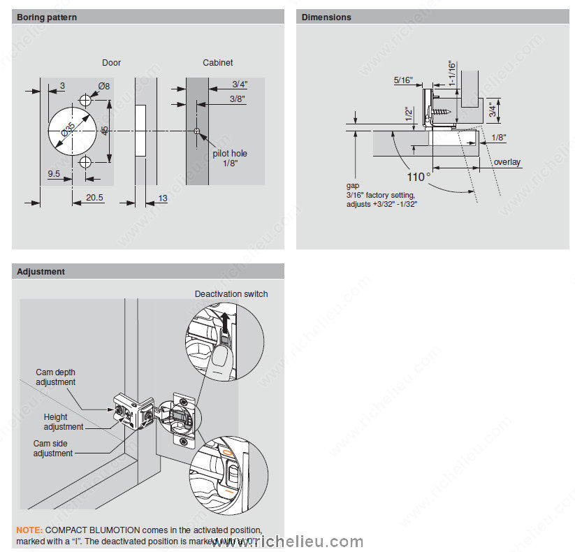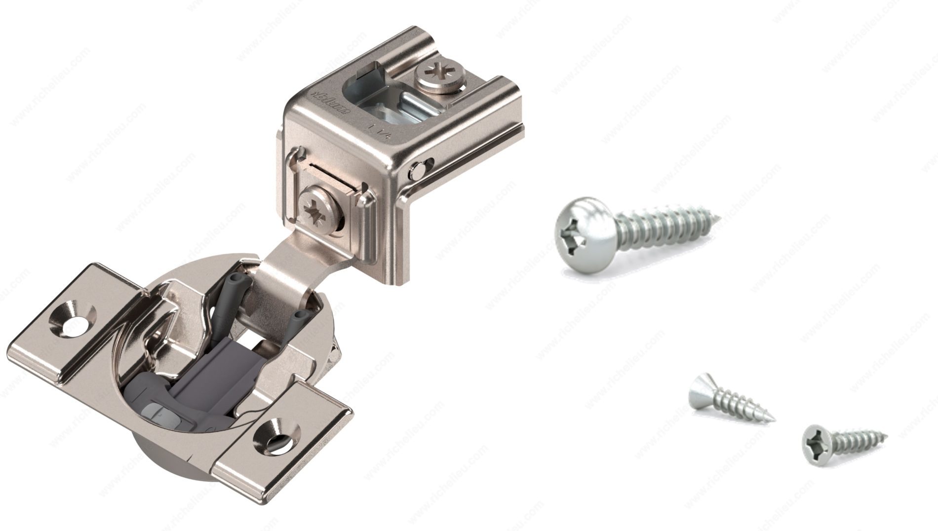 Richelieu BP39C355B20180U COMPACT BLUMOTION 39C Hinges 110 offer an exceptional solution for framed cabinets, combining advanced functionality with a sleek design. Engineered with an integrated soft-closing mechanism, these hinges ensure that doors close quietly and smoothly, enhancing the user experience in any kitchen or cabinetry setting. The BLUMOTION feature can be easily deactivated, making it ideal for smaller or lighter doors while maintaining a consistent and high-quality movement. Designed for full overlay doors, these hinges accommodate a minimum cabinet thickness of 5/8 inches and a door thickness of 5/8 inches, providing versatility in diverse applications. The hinge opening angle reaches a generous +110°, allowing for maximum accessibility. Constructed from durable steel with a nickel finish, the BP39C355B20180U hinges are not only sturdy but also aesthetically pleasing. The wraparound mounting type simplifies installation, and the package includes screws for added convenience. With a milling depth of 1/2 inch and a diameter of 1 3/8 inches, these hinges are designed for precise fitting. Upgrade your cabinetry with Richelieu’s COMPACT BLUMOTION hinges, where quality meets innovation, ensuring a lasting performance for your kitchen or project.