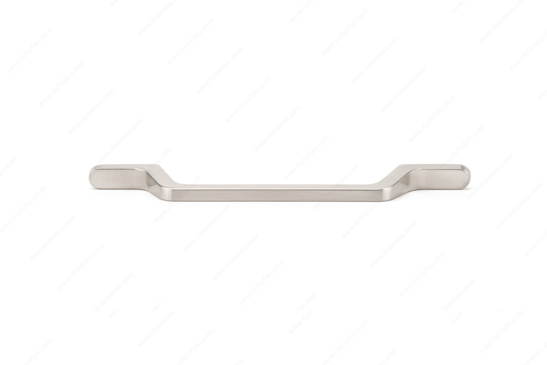 Richelieu BP52010128195 Modern Metal Pull - 52010 features a sleek and contemporary design that beautifully enhances any drawer or cabinetry. The slender profile, accentuated by elongated bases, delivers an ultramodern aesthetic that complements a variety of interior styles. Crafted from durable Zamak, this pull not only stands out visually but also promises longevity and reliability in everyday use. With an overall length of 7 5/8 inches and a projection of 1 1/16 inches, it provides a comfortable grip while maintaining a minimalist appearance. The 5 1/32-inch center-to-center measurement allows for easy installation on standard cabinetry. Finished in a sophisticated brushed nickel with gray and chrome accents, this pull adds a touch of elegance to your spaces. Each pull comes with the necessary 8/32-inch screws for hassle-free installation, ensuring a seamless upgrade to your drawers and cabinets. Part of the complete 52010 collection, the Richelieu Modern Metal Pull is perfect for those looking to create a cohesive and stylish design throughout their home. Whether in a kitchen, bath, or office, this pull is a refined choice that combines form and function effortlessly.