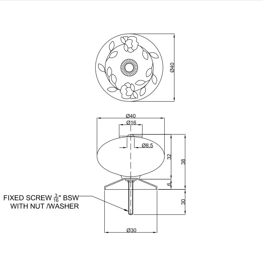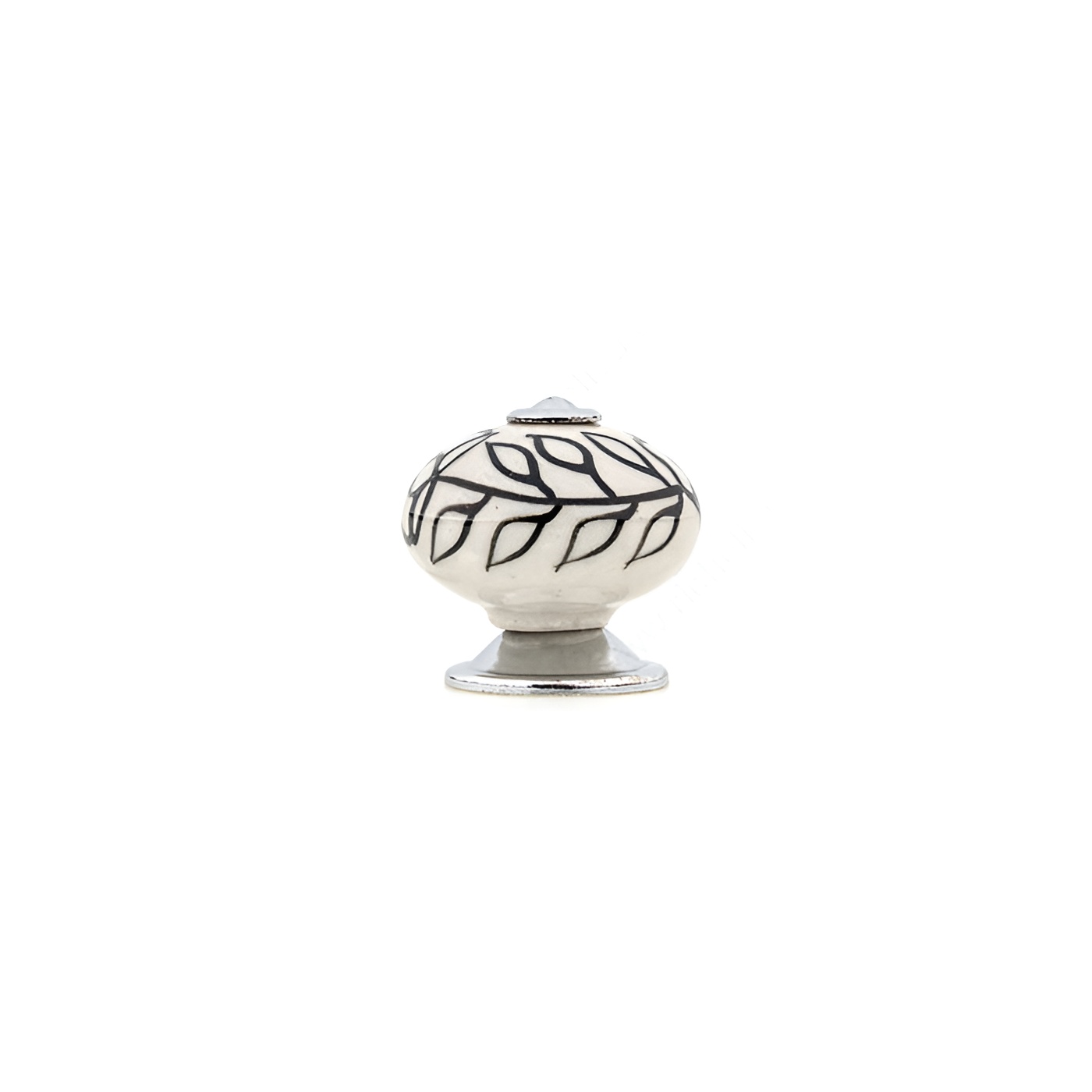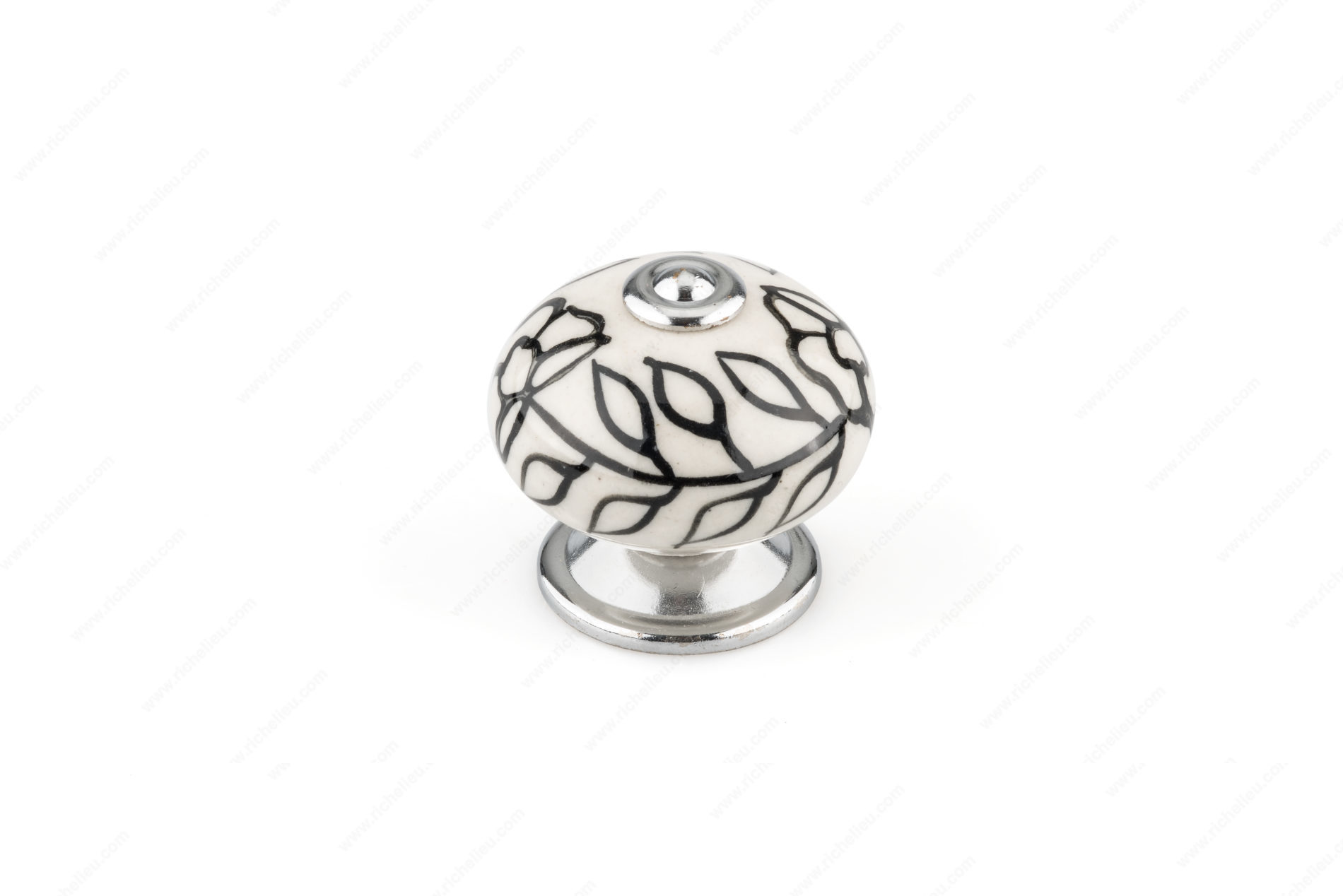Richelieu BP6347401404090 Eclectic Ceramic Knob - 6347 is a stylish addition to any cabinetry or furniture piece, merging elegance with functionality. This round knob features a smooth ceramic surface adorned with a distinctive black vine pattern, beautifully framed by a metallic back plate that enhances its sophisticated appearance. With an overall diameter of 1 9/16 inches and a projection of 1 1/2 inches, this knob is designed for ease of use while providing a comfortable grip. The base diameter measures 1 3/16 inches, ensuring a secure fit for various applications. Crafted from a combination of metal and ceramic, it offers durability and a modern aesthetic that fits seamlessly into eclectic or contemporary designs. Available in three stunning finishes-Almond, Chrome, and Black-this knob allows you to customize your space according to your style. Part of Richelieu’s New Collection, it is designed for versatility and can ship via UPS for your convenience. The knob comes with a 3-cm bolt for easy installation, making it an ideal choice for building professionals and discerning homeowners alike. Elevate your interior with Richelieu’s Eclectic Ceramic Knob, where craftsmanship meets style.