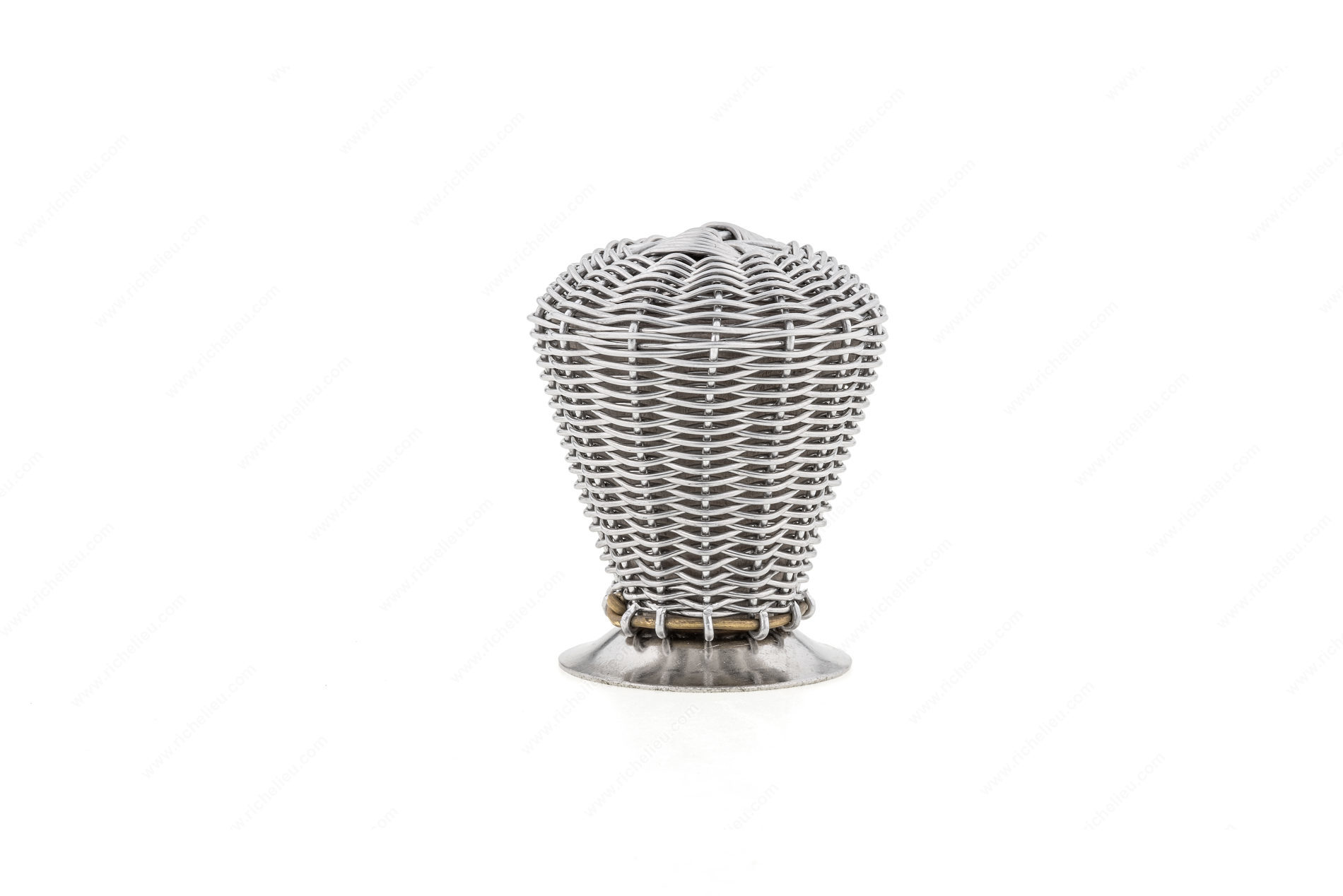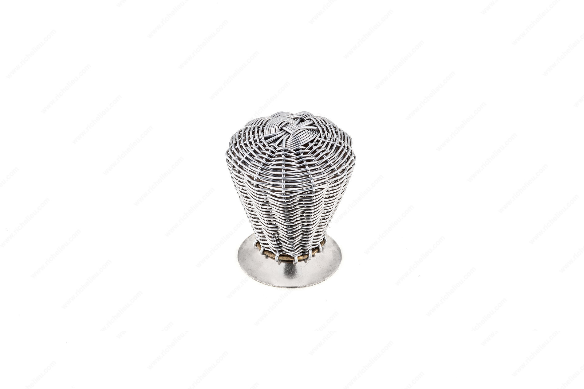 Richelieu BP635737195 Eclectic Metal Knob - 6357 adds a distinct charm to any drawer front with its unique design. This wire basket knob is elegantly perched on a sturdy metal back plate, making it a stylish choice for both contemporary and eclectic interiors. With an overall diameter of 1 3/8 inches and a base diameter of 1 7/32 inches, it strikes the perfect balance between functionality and aesthetic appeal. Crafted from durable metal and finished in brushed nickel, the knob features a striking combination of gray and chrome that enhances its visual interest. Its projection measures 1 25/32 inches, ensuring a comfortable grip while maintaining a sleek profile. This knob is part of Richelieu's New Collection, reflecting a commitment to innovative design and quality craftsmanship. Installation is hassle-free, as it comes with an M4 screw included, allowing you to upgrade your cabinetry quickly. Whether you're renovating a kitchen or refreshing furniture pieces, the Richelieu BP635737195 knob is an excellent choice for adding a touch of sophistication and personality to your space. Elevate your design with this eye-catching accessory that seamlessly blends style and practicality.