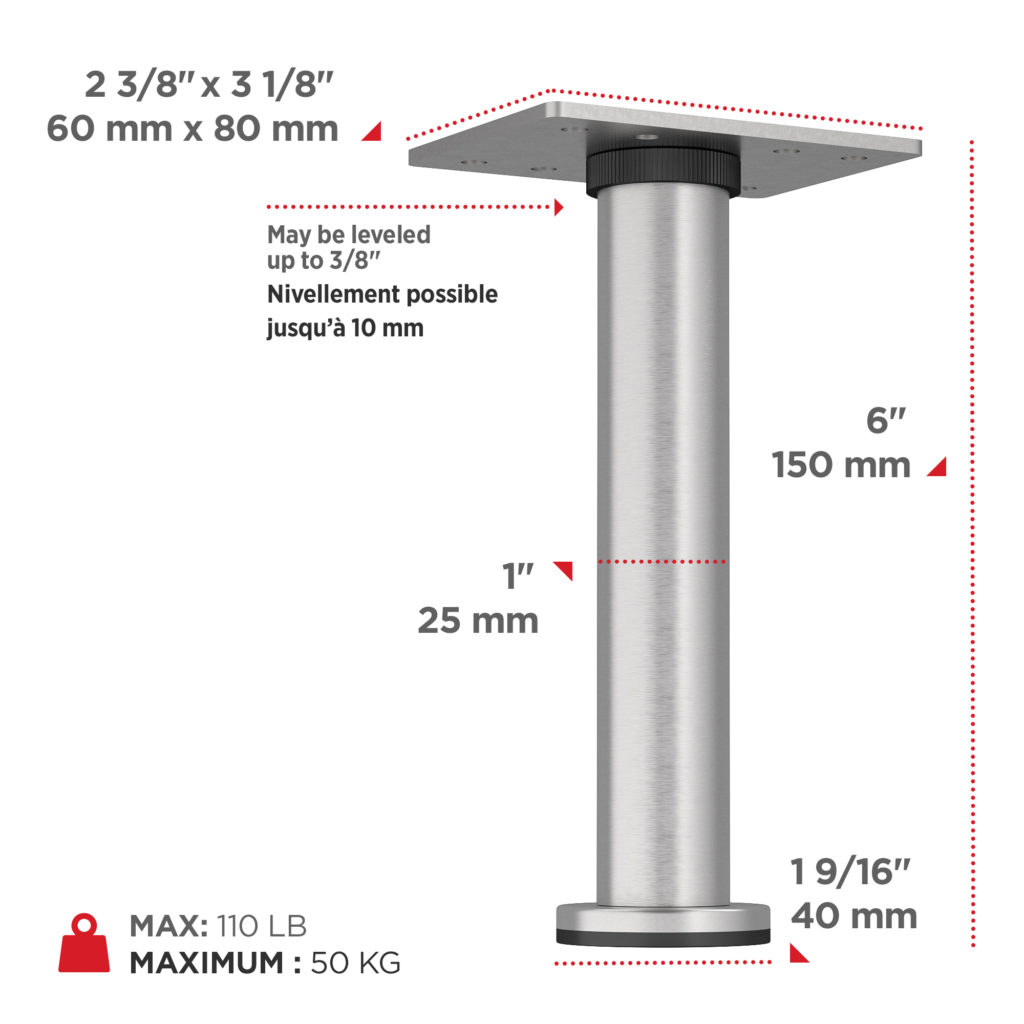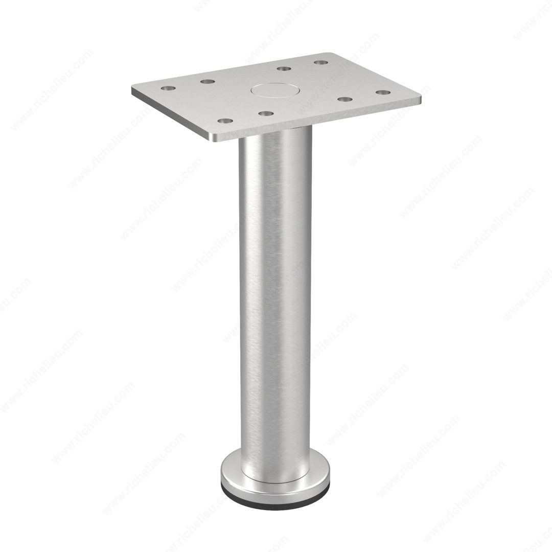 Richelieu BP64217150155 BORSA - Adjustable Furniture Leg - 642 features a robust and stylish design, ideal for enhancing the aesthetics of bedrooms, living rooms, and bathrooms. These industrial-style furniture legs are available in various sizes and a sleek Satin Nickel finish, making them versatile enough to coordinate with multiple furniture pieces or create a cohesive look throughout a room. With a contemporary round shape, the BORSA legs add a touch of modern flair to dressers, bathroom vanities, nightstands, and TV stands, elevating the overall decor. Designed for easy installation, these legs come equipped with levelers, allowing for height adjustments of up to 3/8" to accommodate uneven floors, ensuring stability and support. Constructed from durable Stainless Steel 201, each leg boasts a load capacity of 110 lbs, providing strength and reliability for various applications. The base diameter of 1 9/16 inches and a height of 5 29/32 inches make these legs a practical choice for any furniture project. With plate dimensions of 80 mm x 60 mm, the BORSA legs are not only functional but also add an elegant touch to your space. Upgrade your furniture effortlessly with Richelieu's adjustable furniture legs.