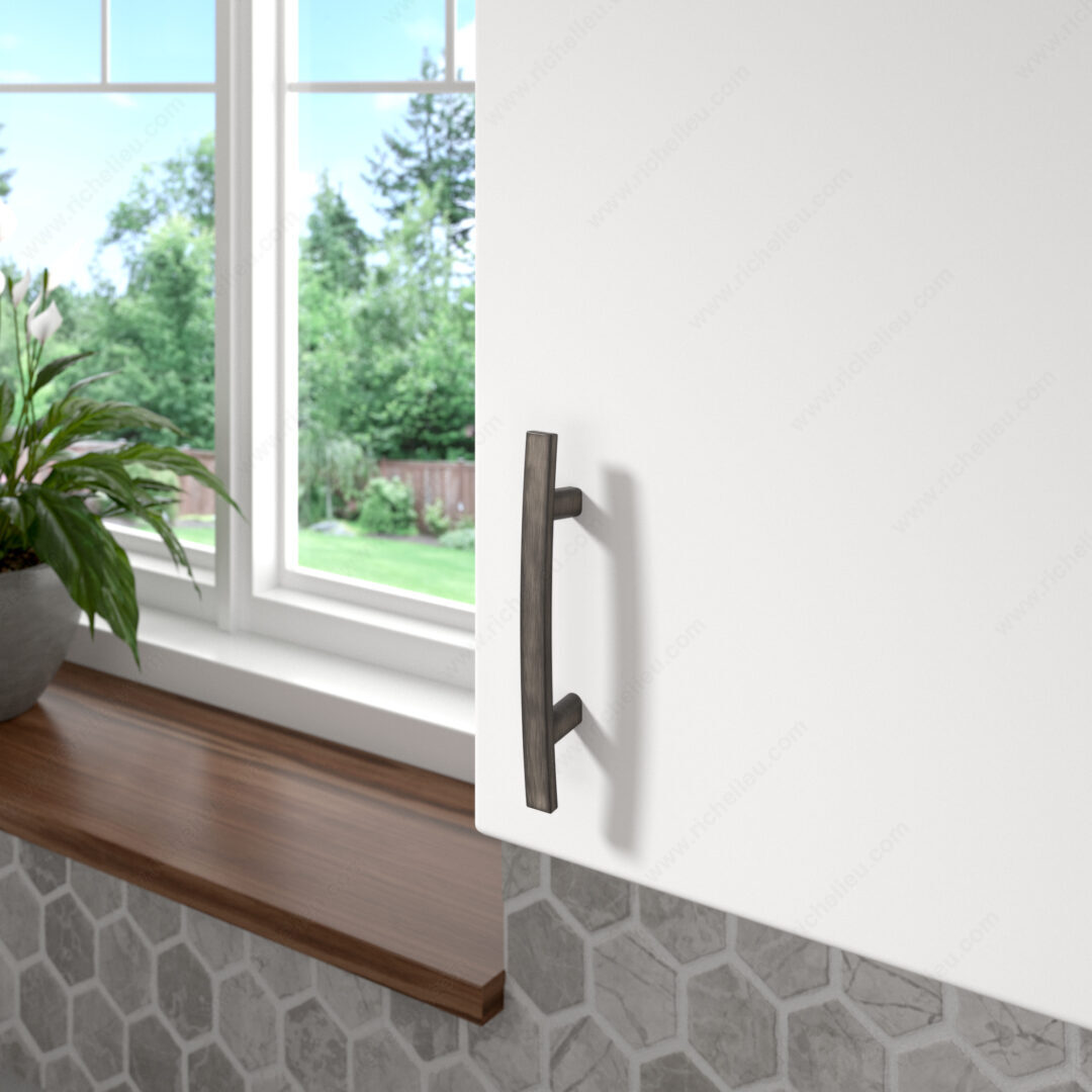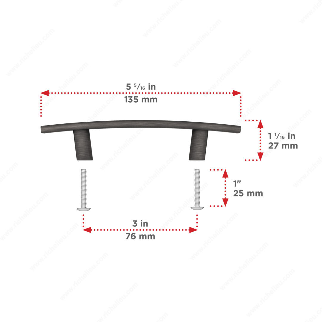 Richelieu BP65076143 Transitional Metal Pull - 650 offers a stylish upgrade for both kitchen and bathroom cabinetry. This pull features a slightly curved design that brings a touch of elegance and sophistication to your interior décor, making it an excellent choice for those looking to enhance their space. With a center-to-center measurement of 3 inches, this pull is crafted from durable zamak, ensuring both longevity and strength. The antique nickel finish, identified as Finish Number 143, adds a timeless quality while the gray and chrome color combination complements a variety of styles. Measuring 5 5/16 inches in overall length, 7/16 inch in width, and 1 1/16 inches in projection, this pull is perfectly sized to provide functionality without overwhelming your cabinetry. The product comes packaged in a convenient bag and includes 8/32 inch screws for easy installation, ensuring a hassle-free experience. Richelieu's attention to detail and commitment to quality are evident in this transitional style pull, making it an ideal choice for both building professionals and discerning homeowners. Elevate your cabinetry with this beautiful and functional hardware piece, designed to enhance the overall aesthetic of your living spaces.