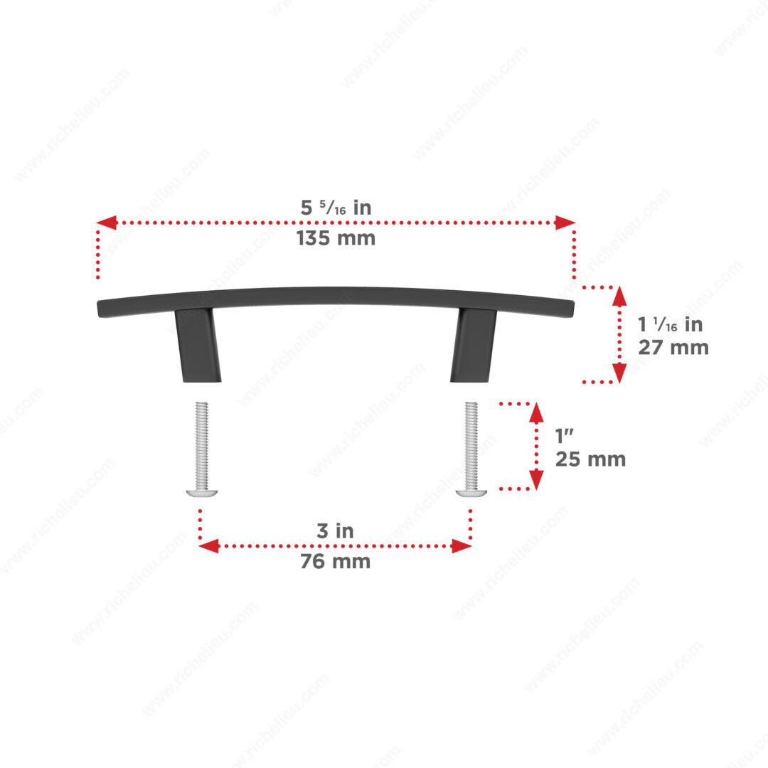 Richelieu BP65076BORB Transitional Metal Pull - 650 offers a stylish enhancement for kitchen and bathroom cabinets. This pull is designed in a transitional style, featuring a slightly curved shape that adds a distinguished touch to your interior décor. Crafted from durable zamak, it combines both strength and elegance, making it a reliable choice for any cabinetry. With a center-to-center measurement of 3 inches, this pull fits seamlessly into existing designs. The overall dimensions measure 5 5/16 inches in length, 7/16 inches in width, and a projection of 1 1/16 inches, ensuring a comfortable grip while maintaining a sleek profile. The brushed oil-rubbed bronze finish not only imparts a rich, warm color but also provides a sophisticated contrast that complements various design themes. Installation is straightforward, as it includes an 8/32 inch screw for easy setup. Each pull is packaged per unit, making it convenient to order according to your project needs. Whether updating a single cabinet or outfitting an entire kitchen, the Richelieu BP65076BORB pull is an excellent choice for enhancing both functionality and style in any space.