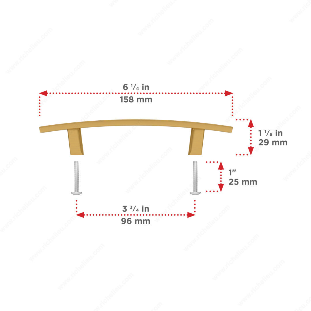 Richelieu BP65096158 Transitional Metal Pull - 650 is designed to elevate the aesthetics of your kitchen and bathroom cabinets. With its elegantly curved shape, this pull brings a distinguished flair to any interior décor, making it an ideal choice for both modern and classic spaces. The brushed aurum gold finish exudes sophistication, while the striking yellow and brass color combination adds a touch of warmth. Measuring 6 7/32 inches in length with an overall projection of 1 5/32 inches, this pull is both functional and stylish. The center-to-center measurement of 3 25/32 inches ensures a seamless fit for various cabinetry styles. Crafted from durable zamak, the pull is built to withstand daily use while maintaining its allure. Each pull comes packaged in a convenient bag and includes 8/32 inch screws for easy installation. With a width of 7/16 inches, the Richelieu BP65096158 offers a comfortable grip, making it a practical addition to your home. Whether you are renovating or simply updating, this transitional pull serves as a perfect finishing touch for your cabinetry. Enhance your space with Richelieu’s commitment to quality and design excellence.