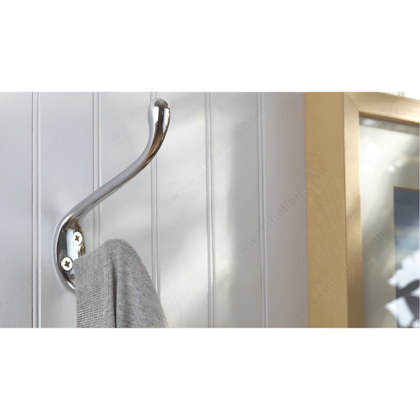 Richelieu BP6513140 4-1/2 in Utility Hook - 6513 is the perfect blend of functionality and style, making it an excellent choice for any space. Crafted from durable metal, this double hook features a sleek chrome finish that complements a variety of décors, from modern to traditional. Measuring 4 23/32 inches in height, with a projection of 3 17/32 inches and a width of 31/32 inches, it is designed to fit seamlessly in tight areas while providing reliable support. With a robust load capacity of 22 lbs, this utility hook is ideal for hanging coats, bags, or other everyday items, ensuring your space remains organized and clutter-free. The included screws simplify installation, allowing you to mount it quickly and effortlessly. Available in a stylish gray and chrome color combination, the Richelieu utility hook not only serves its purpose but also enhances the visual appeal of your entryway, mudroom, or any other area where extra hanging space is needed. Whether you're a building professional or a knowledgeable homeowner, the Richelieu BP6513140 is a practical addition that combines quality craftsmanship with versatile design. Elevate your organization solutions with this elegant, functional hook.