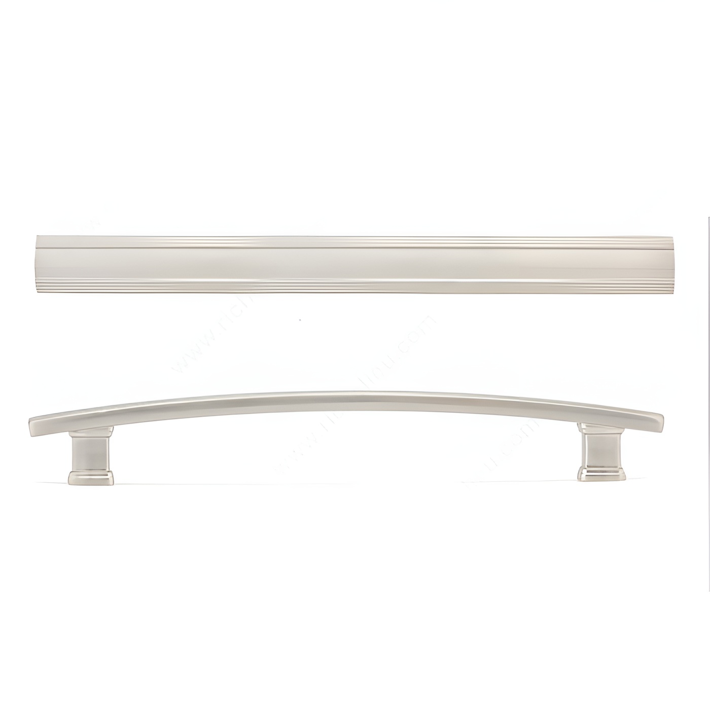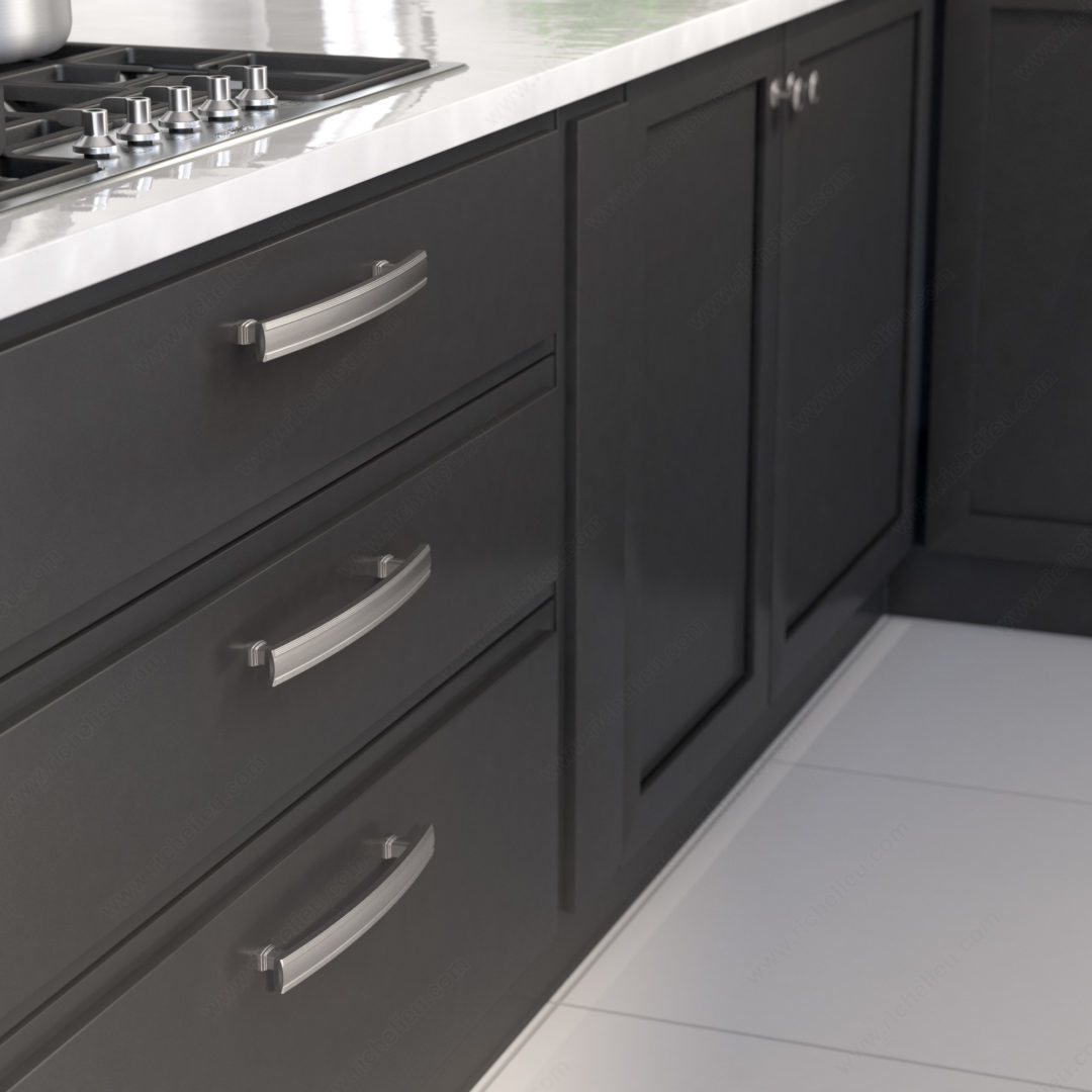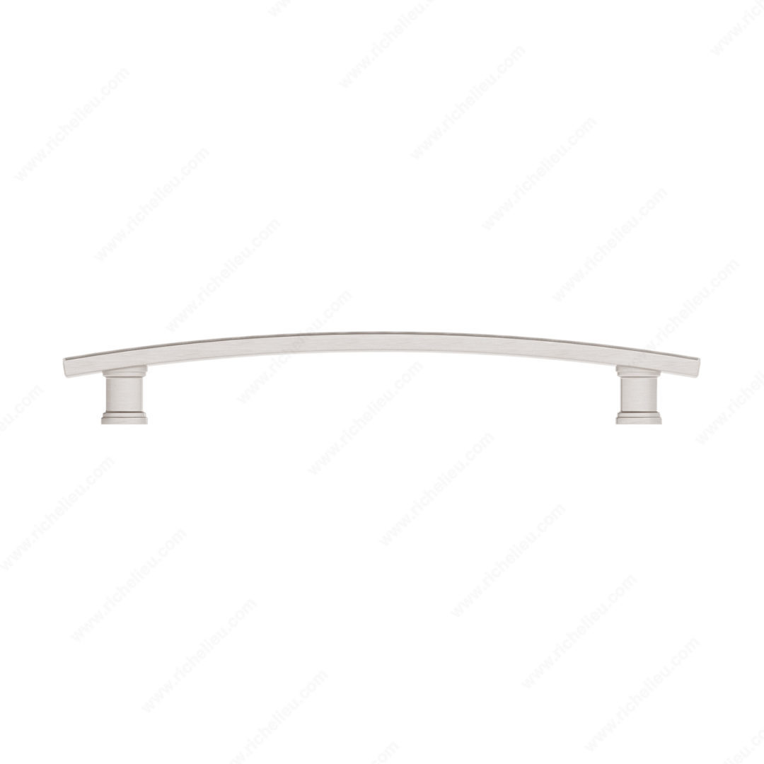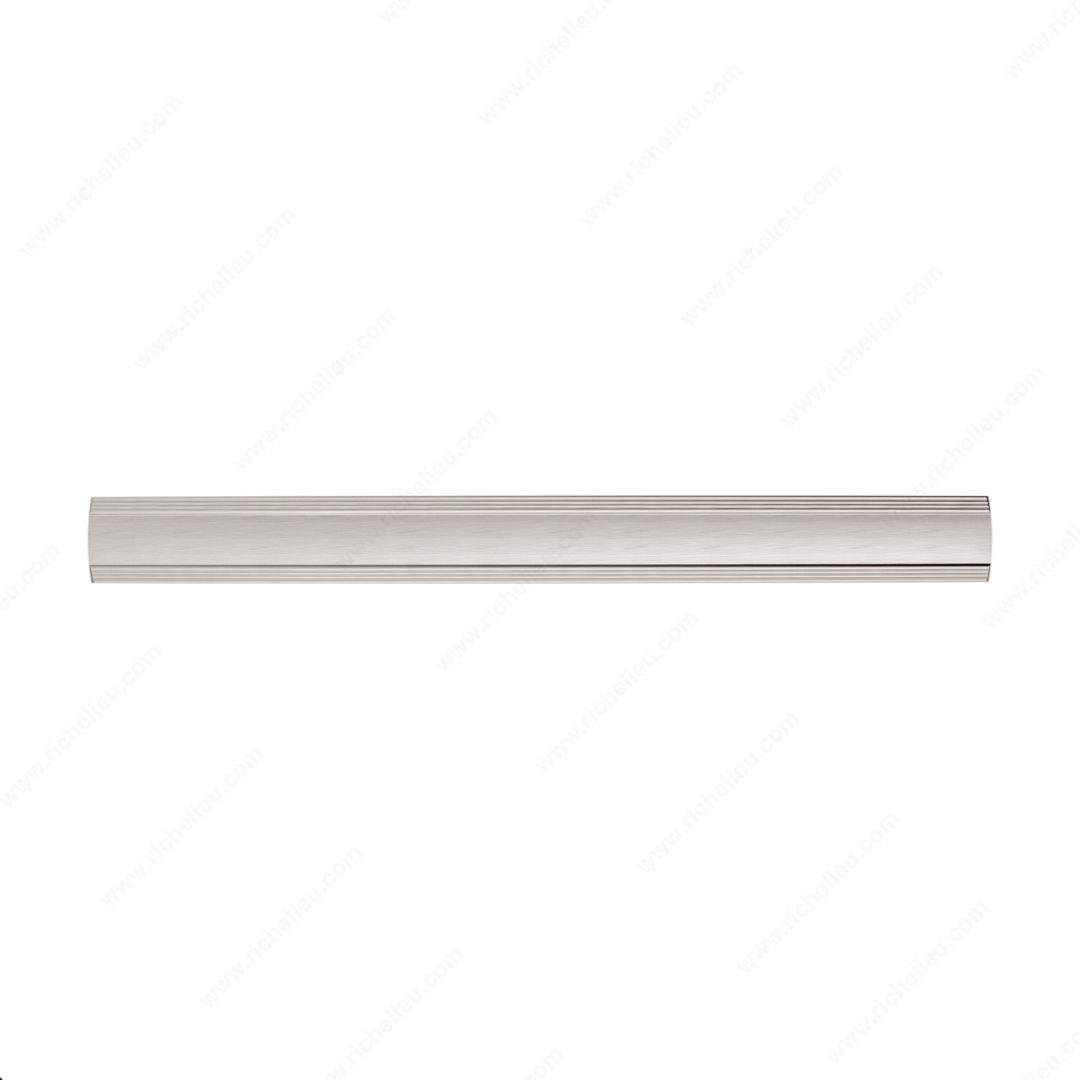 Richelieu BP7070192195 Transitional Metal Pull - 7070 is designed to enhance the aesthetic of your furniture with its elegant and distinctive look. Featuring a smooth, arched band complemented by delicate stripes above and below, this pull brings a modern touch to transitional spaces. Crafted from durable zamak, it ensures longevity while maintaining a refined appearance. With an overall length of 9 3/8 inches and a center-to-center measurement of 7 9/16 inches, this pull is ideal for various cabinetry and furniture applications. Its brushed nickel finish, paired with gray and chrome accents, offers a sophisticated color palette that can seamlessly blend with your décor. The pull boasts a projection of 1 3/8 inches, providing a comfortable grip while adding dimension to your furniture pieces. Included with the pull are 8/32 inch screws, making installation straightforward and hassle-free. This versatile piece is part of the new 7070 collection, which includes a variety of coordinated hardware options, allowing you to create a cohesive look throughout your space. Elevate your interior design with the Richelieu BP7070192195 Transitional Metal Pull, a perfect combination of style and functionality.