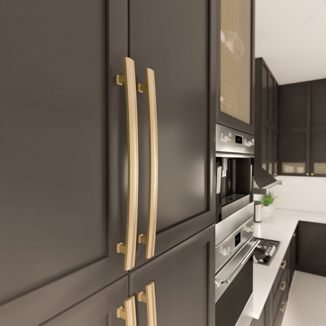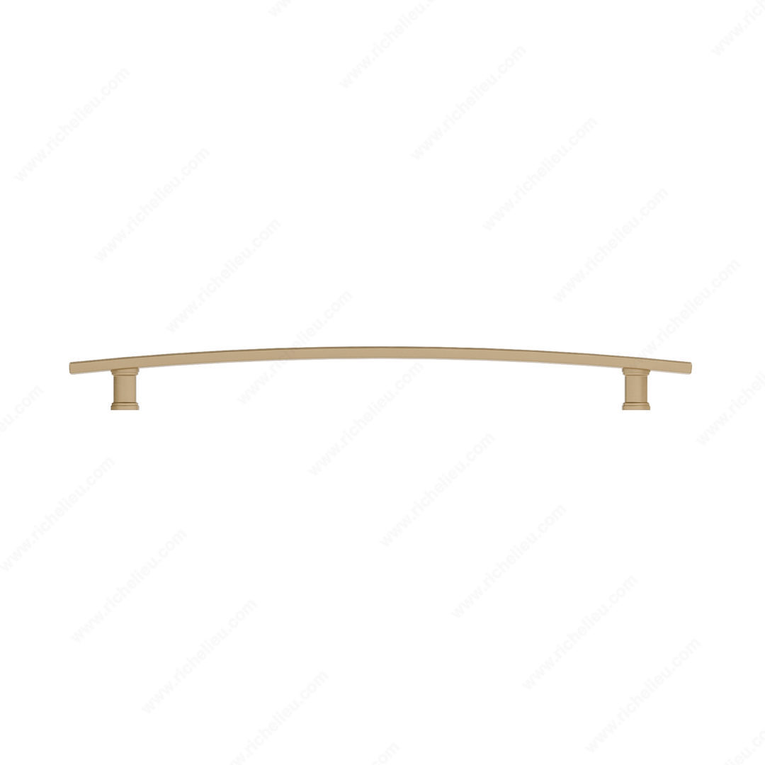 Richelieu BP7070320CHBRZ Transitional Metal Pull - 7070 offers an elegant solution to enhancing your furniture's aesthetic with its distinctive design. Featuring a smooth, arched band complemented by thin stripes above and below, this pull exudes sophistication while maintaining a transitional style that suits a variety of decors. Measuring 15 3/8 inches in length with a center-to-center distance of 12 5/8 inches, this pull is crafted from durable zamak, ensuring both strength and longevity. The exquisite champagne bronze finish adds a touch of warmth, making it a perfect fit for contemporary and classic spaces alike. With an overall projection of 1 9/16 inches and a width of 29/32 inches, it comfortably fits in hand, providing easy functionality. The BP7070320CHBRZ is part of the stylish new collection, designed to elevate your interior while seamlessly coordinating with other pieces in the 7070 collection. Installation is straightforward, as M6 screws are included. Whether you're upgrading your kitchen appliances or enhancing cabinetry, this transitional pull not only adds visual appeal but also transforms everyday functionality into an experience of elegance and style.